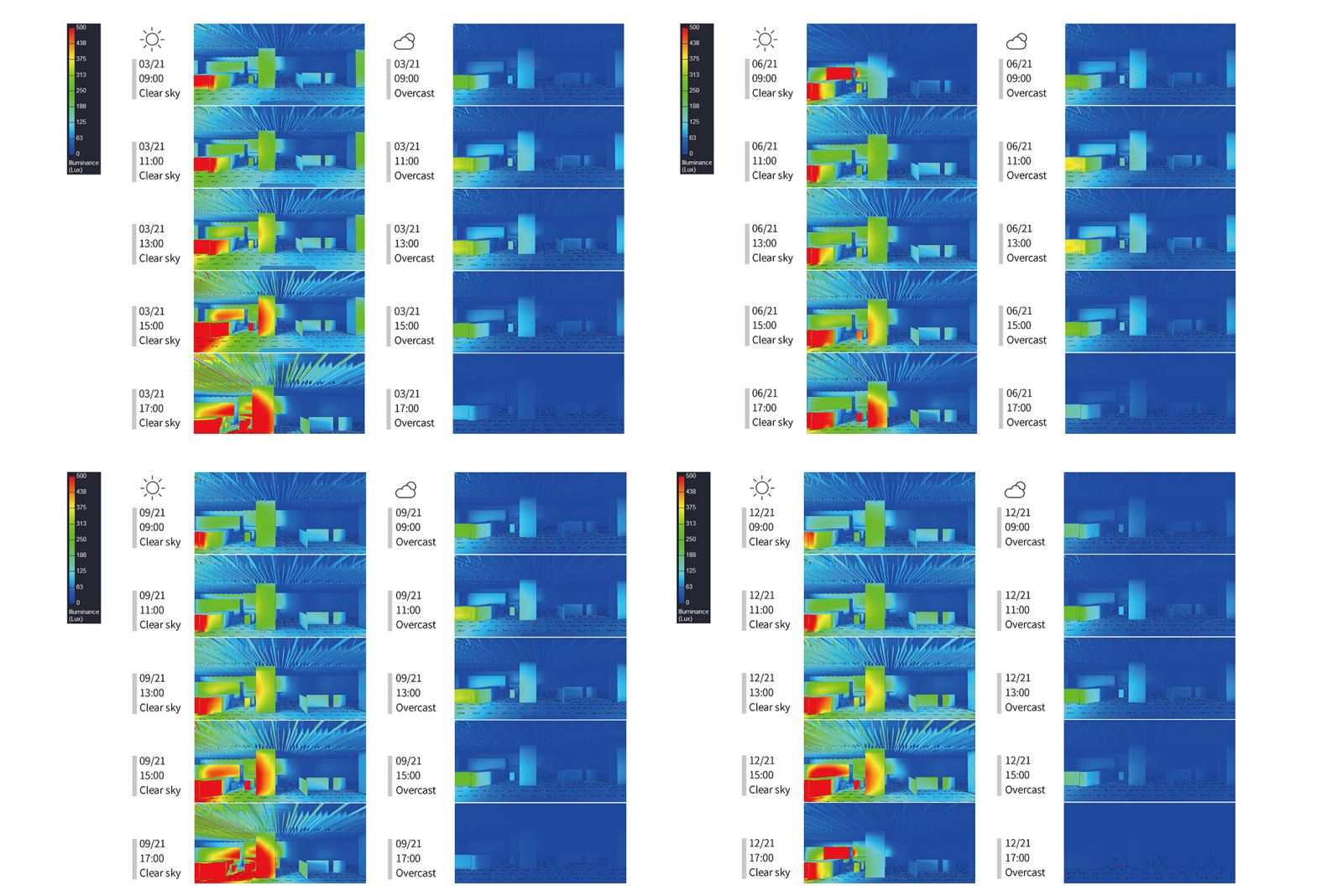 是故,要治療這個展廳環境太暗的宿疾,就不能只從換燈或是加燈著手,因為要以人工照明來與自然天光抗衡,是不切實際的想法,執行團隊與館方在理解展廳遇到的課題後,擬定以「降低前景與背景的視覺對比」作為主要照明策略,而為了達成這個策略的目標,採取了三個照明手段:一、在玻璃窗上裝貼低可見光穿透率的減光膜降低輝度,二、利用均質照明提升全展廳空間的基礎照明,三、配合展覽陳設規畫,透過近距離或遠處的窄角度投光,拉高展品的局部重點照明;過程中除了做現場的照度與輝度量測,也透過對全年各時段的日光環境進行電腦模擬,理解到太陽光在開館期間,透過窗戶滲入到常設展廳的各個展區的強度與影響時段,藉此規劃出在大晴天與陰天的天空條件下,各展區的開燈調控比例,讓原本是造成視覺干擾主因的自然光,轉變為提供展廳基礎照明的光源,在原本以高效率LED光源替換傳統鹵素光源,在光源光效上得到近5倍的躍進之外,透過分區的燈光調控得到更進一步的照明節能成果。