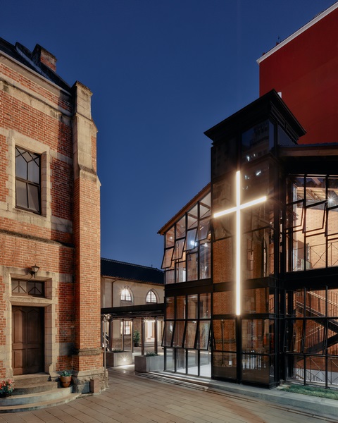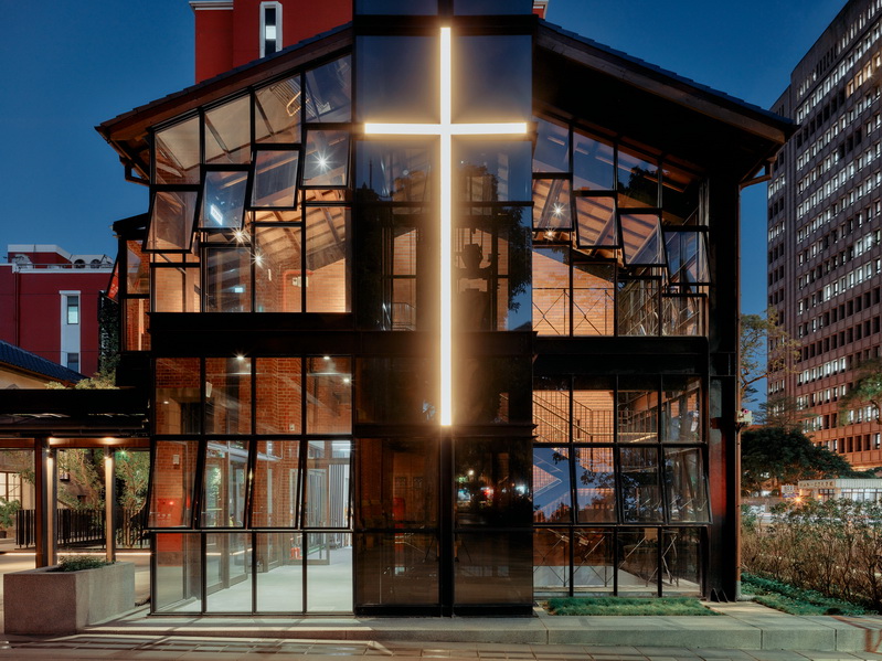 新建築採用鋼構造使量體變得輕盈,雙斜屋頂鋪深色日本瓦、實木水平遮陽百葉及東西兩側延伸的紅磚量體,一方面延續了主禮拜堂的既存材質,一方面以輕透的玻璃、鋼構創造空間及視線的延續性,五個連續柱間與主禮拜堂五個扶壁結構韻律呼應。面濟南路側採用黑色塗裝,希望成為不具特徵的背景,對內則呈現百葉的木質感,與中庭內各種自然、溫緩的元素包括主日學教室的米色外牆、東側的垂直綠牆及中庭的大樟樹融合,空間內外活動、動線都在此展露無遺,進而創造柔軟親切、鼓勵交流的中庭核心空間。