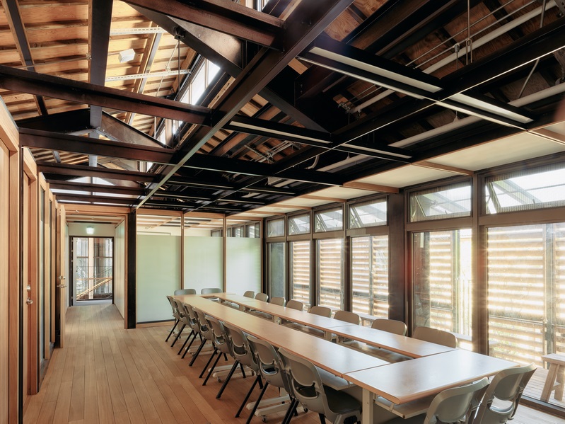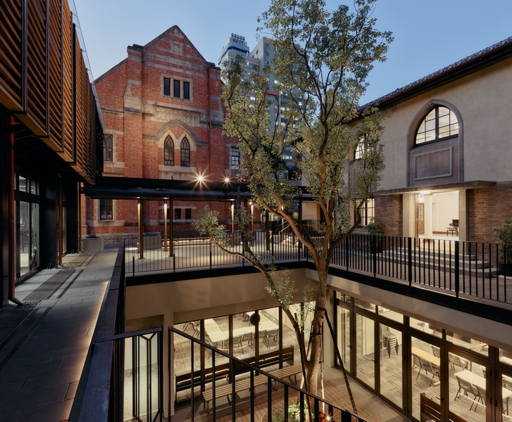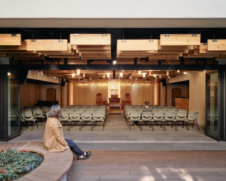 為創造出兼具內聚性與通透感的場所,配置下凹中庭以紓解地面上的量體,中庭與地下一層的小禮拜堂相連,透過可全開的玻璃折門,空間的使用可擴充到中庭木平台,庭內植一棵大樟樹,由下而上提供兩層遮蔭空間,亦成為中庭的重要景觀元素。