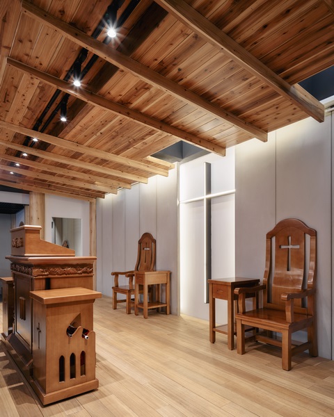 透過天光的反射,給禮拜活動的人們精神性的空間體驗,伴隨著溫馨之氛圍。 下沉廣場的小禮拜堂,主牆與天窗的結合,將光帶入地下空間。當日照不足時,藉由安裝於天窗側牆,模擬日照的輔助光灑落牆面,再現視覺端景。 錯落於天花格柵間的吊燈,象徵由講台向中庭發出擁抱溫暖之光,邀請門外的人們入內。