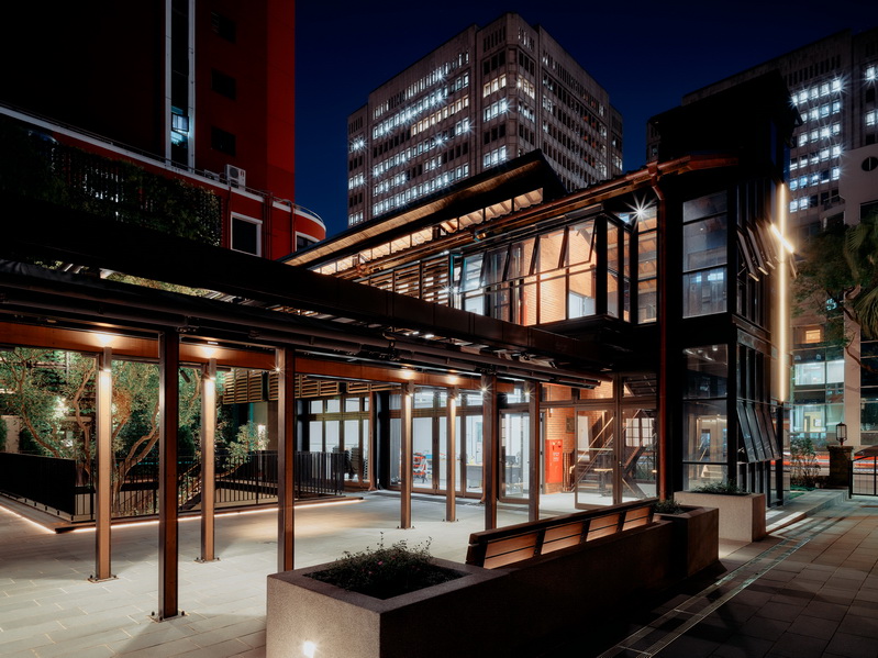 低尺度的燈光串連各區域,低調的指引人們。 廊道及樓梯扶手細部結合線型燈,下照於鋪面後反射,行徑者在柔和且連續的光帶領下,安心地漫步。 中庭的大樟樹,其婆娑姿態,藉著傍晚光影交替, 讓人駐足、沉思、禮讚。 藉著光的施與受, 撫慰了人們。