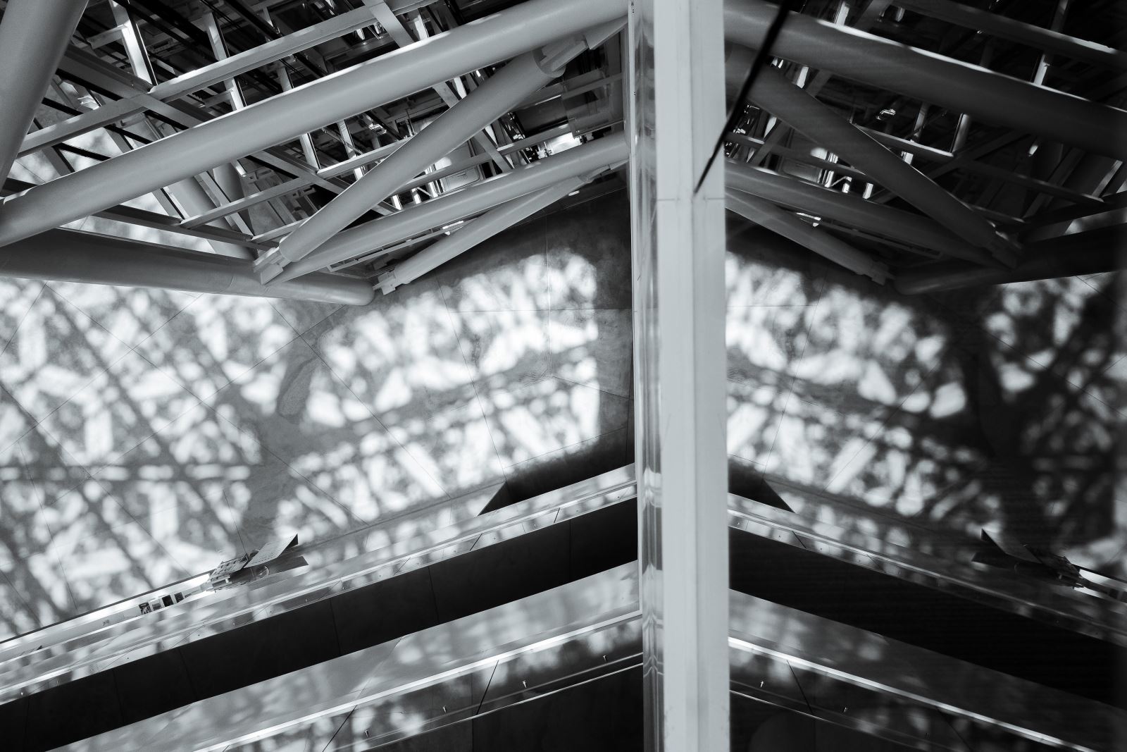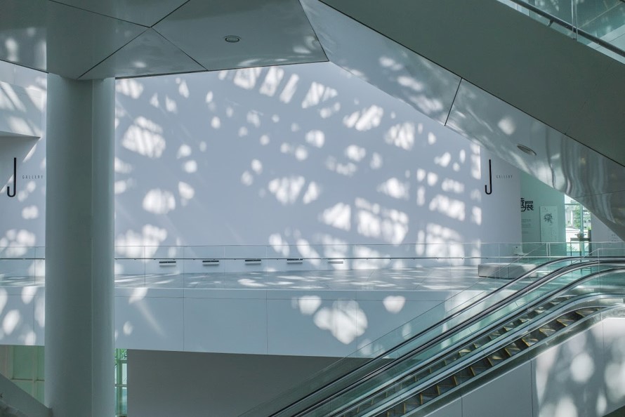 尤其別具特色的大型五角碎形屋頂,為因應臺南炎熱的氣候,建築師模擬大自然樹蔭效果,透過幾何造型製作碎形結構,用以調節建築空間綠能,遮擋百分之八十日照,當太陽以不同角度照射在碎形屋頂上時,可呈現如光穿透樹葉般的美麗光影。無論陽光普照或雲迷霧鎖的日子,民眾可以在2館大廳感受大自然的創造力。隨著日照角度的改變與日照強度的變化,陽光迤邐揮灑在牆上的光影,有時如Jackson Pollock的激昂豪放,有時又像文人水墨般的優雅綿長。南美館2館的白牆上,永遠展示著世界獨一無二的創作。