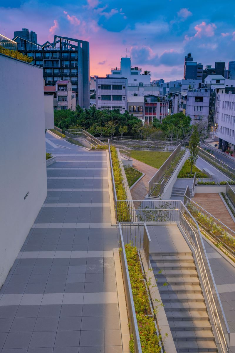 戶外的照明也出現在入口階梯、椅下空間、步道欄杆及扶手樓梯等處安裝的低色溫線性燈,不但提供了民眾溫暖又安全的引導照明,更為館區整體景觀營造出光帶不規律縱橫交錯的照明美感,讓夜裡的南美館展現出尊貴耀動的明亮氛圍,成為了臺南市中心奪目的地標,讓臺南市越夜越美麗。