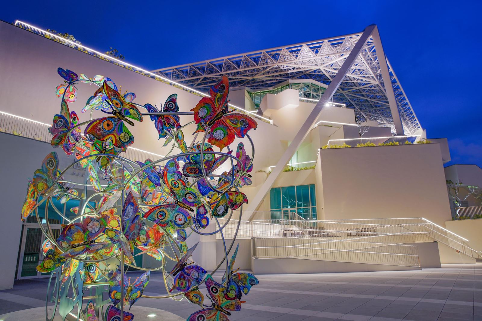 除了自然光之外,南美館2館的主體建築亦搭配建築師選用的低色溫燈光,營造出既典雅又宏偉的氣勢。民眾在夜間可以觀賞到,透過上層投光照明的設置,建築外觀的五角造型鋼骨結構演繹出虛實變化的線條律動美感;中、下層外牆垂直錯位的塊面投光,則創造出幾何造型明暗層疊及光影變換的光效。