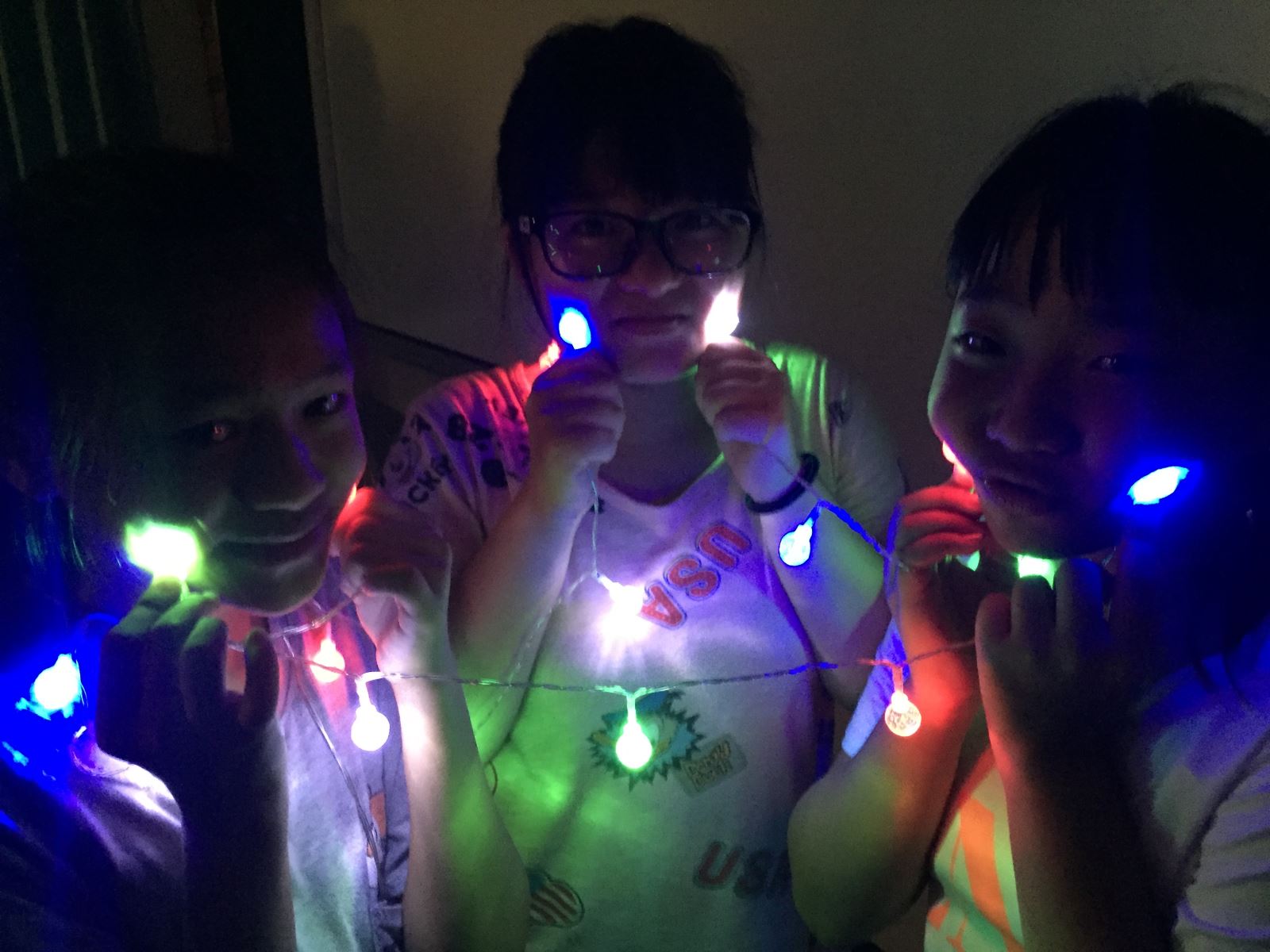 「我是光」由泰安國中的謝文軒老師所設計的「光、影與我」先備課程首先登場,謝老師針對光的物理特性進行解說,在泰安老師們的協助下,同學開始分組創作。為了讓同學信手捻來即可體驗戲劇性的光影變化,基金會事先準備的教材箱內包括有大型手電筒、變焦手電筒、蠟燭、聖誕燈泡、三菱鏡、放大鏡、塑膠網、鐵絲網、派對鏡面反射球、色片、不同形狀的透明壓克力結構、動物模型、水草模型、面具…等琳琅滿目的素材,同學們藉由操作不同光源照射在不同介質、物件甚至身體上,非常具有想像力地營造出許多耐人尋味的光影現場,創意十足也合作無間!