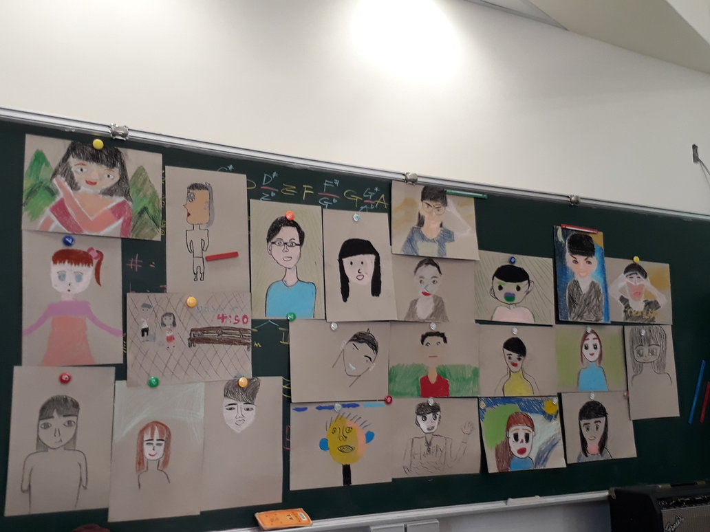 課堂最後,在燈光下同學拍攝具有情緒的五官變化照片,觀察並繪製自畫像,進行靜態的自我介紹。在開始畫畫之前,亦慈向同學們介紹了知名墨西哥女性藝術家芙烈達・卡羅(Frida Kahlo)幾張經典的自畫像作品,瀏覽芙烈達如何在特定的生命經歷中,將其強烈的情緒轉化為生命力十足的自畫像。聽完老師的引導之後,同學們重新審視自己的形象,很快地進入專注創作的狀態,賣力地佈局、勾勒這張平面的自我介紹。在拍攝技術發達便捷的今日,生活中有許多自拍或者其它留存/變造自我形(影)象的機會,究竟自己想要以什麼樣態(在什麼樣的平台上)示人,似乎是我們時常要面臨的決定,從同學們創作的過程中,亦可發現他們的思考過程:有人設計了情境,有人決定側臉示人,有人將空間與時間的特性加入。課程尾聲,大家完成的作品逐漸佔滿黑板,拼湊出孩子們誠懇自信的群像。
