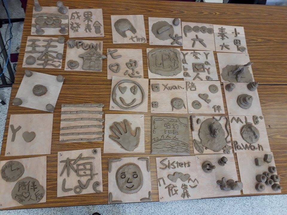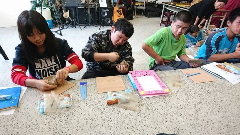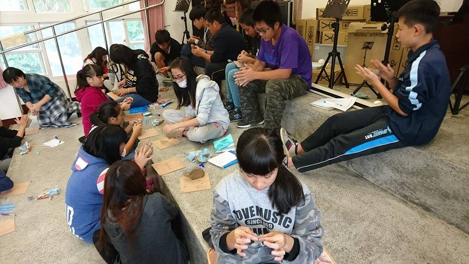 從物件延伸為創作,藝術家請同學們用陶土呈現自己帶來的珍貴物件。許多同學是充滿好奇地第一次玩土,藝術家鼓勵大家感覺一下材料質地,摸摸看它的溫度,摔摔看、捏捏看、用工具鑿出痕跡, 思考材料與物件對話的過程。大家循序漸進地嘗試各種互動,掙扎、重做、發問、思考,到靜下來專注捏塑。觀察大家的作品:有人製作多個物件形成一個空間、有人再現五官形象、有人抽象地表達旋律或心情,也有人直接捏出字來表達心裡想法。當他們真摯地述說著每個微小而特殊的生命經驗時,眼睛都散發著光芒!