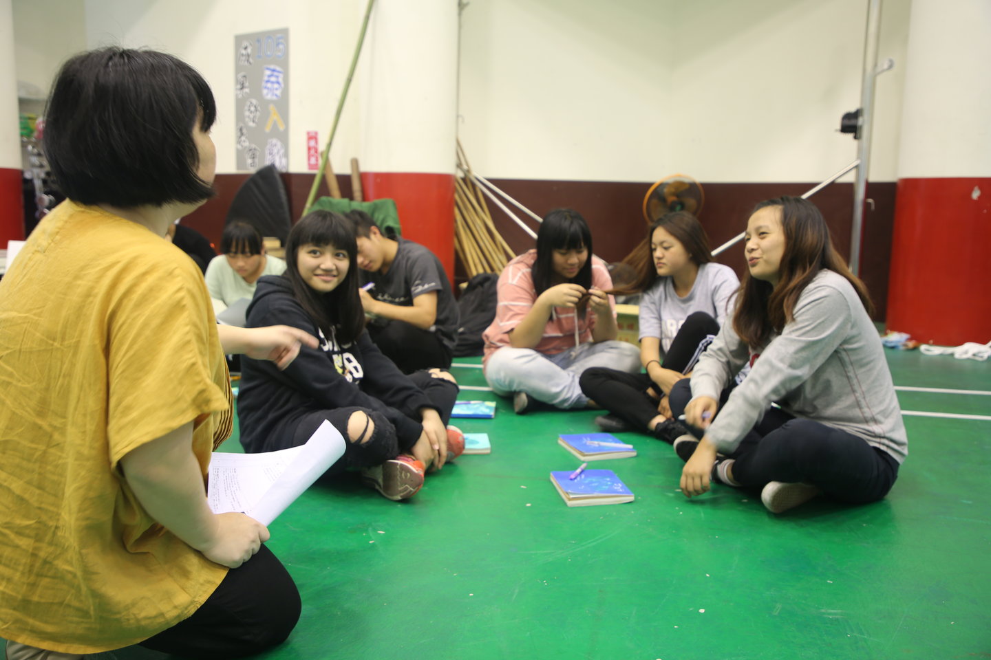 經歷了上學期遊戲、創作的時光,下學期課程我們帶領同學以思考「關係」作為教學命題。針對同學們的創作表現與人格特質上顯現的特性,將同學分為「球」、「我說」、「走時間的人」、「對稱的舞蹈」、「綁」、「十年後的這裡」等六組,各組以集體創作的模式發展作品。第一堂課,亦慈老師大致介紹課程方向之後,同學分別面對各自的任務!