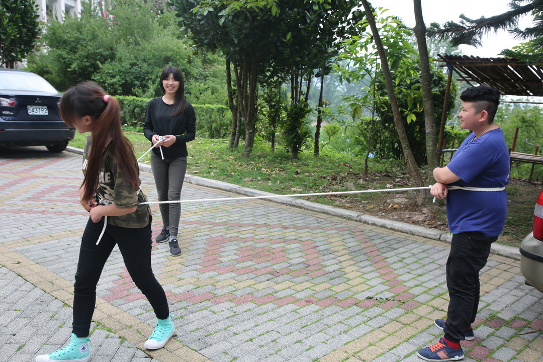 「綁」這組同學,嘗試各種牽制:感受兩人在肢體間捆綁時相互拉扯的張力;到校園環境裡,身體與巨大的樹幹綁在一起;或三人同時被連結在一起時,如何移動的實驗。
