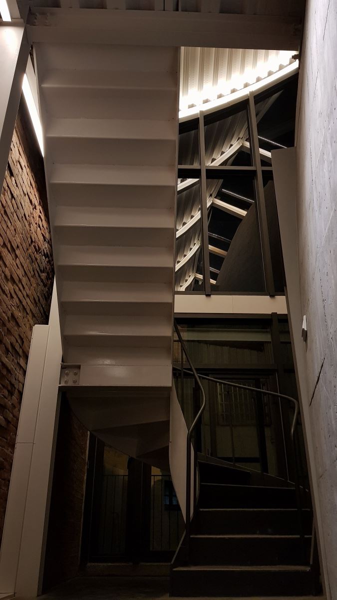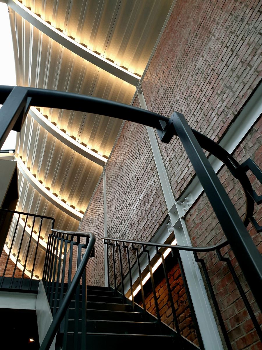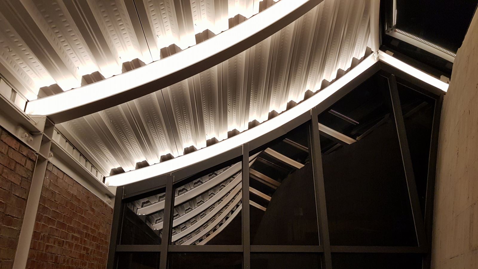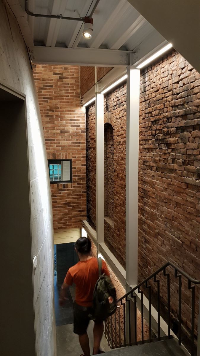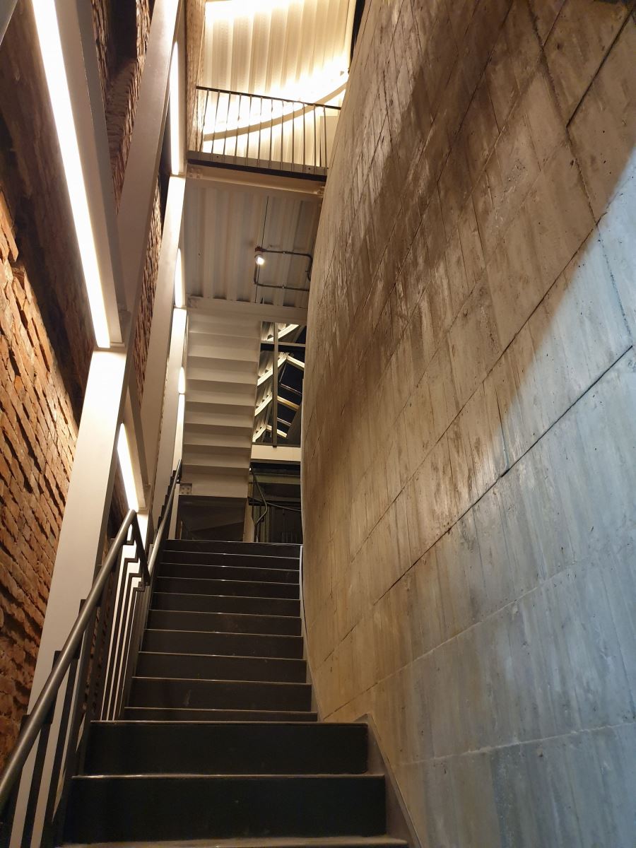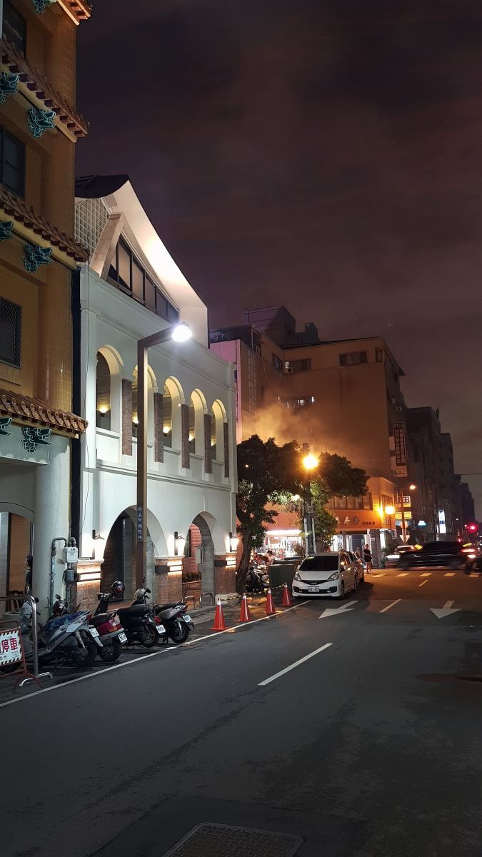 夜間照明的設計上,希望在中區繁華逐漸褪色風化,略顯蕭條的街景中,注入既古典又前衛的光環境:首先,在立面拱圈及人字屋簷的投射上強調曲線線條;其次,在作為商業空間將人帶到3樓的垂直動線樓,層次豐富仿若科幻電影場景的梯間,卻又充滿著懷舊的線條與材質,令人流連忘返。