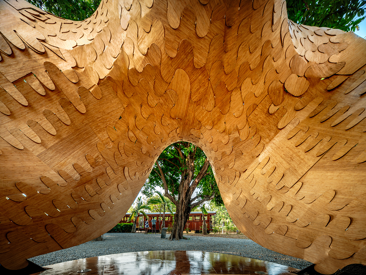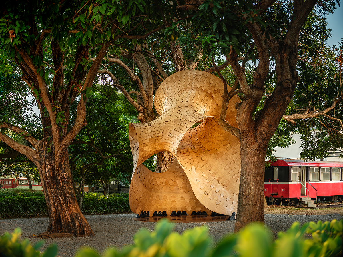 本屆的作品有9件,分別座落於阿里山林鐵沿線的車站,從北門站出發後,會逐漸地攀升至竹崎、梨園寮、水社寮,最後的終點站則是位於海拔1534公尺的十字路車站。本藝術裝置作品 『疊舞竹曲』座落於北門車站樹木環繞優美的公園綠地上。作品的設計主軸為基於『竹子新結構』的觀點,並利用竹複合薄板材料,與透過材料的彎曲性能,設計和建造一座5M高的多孔隙自由形態薄殼結構。