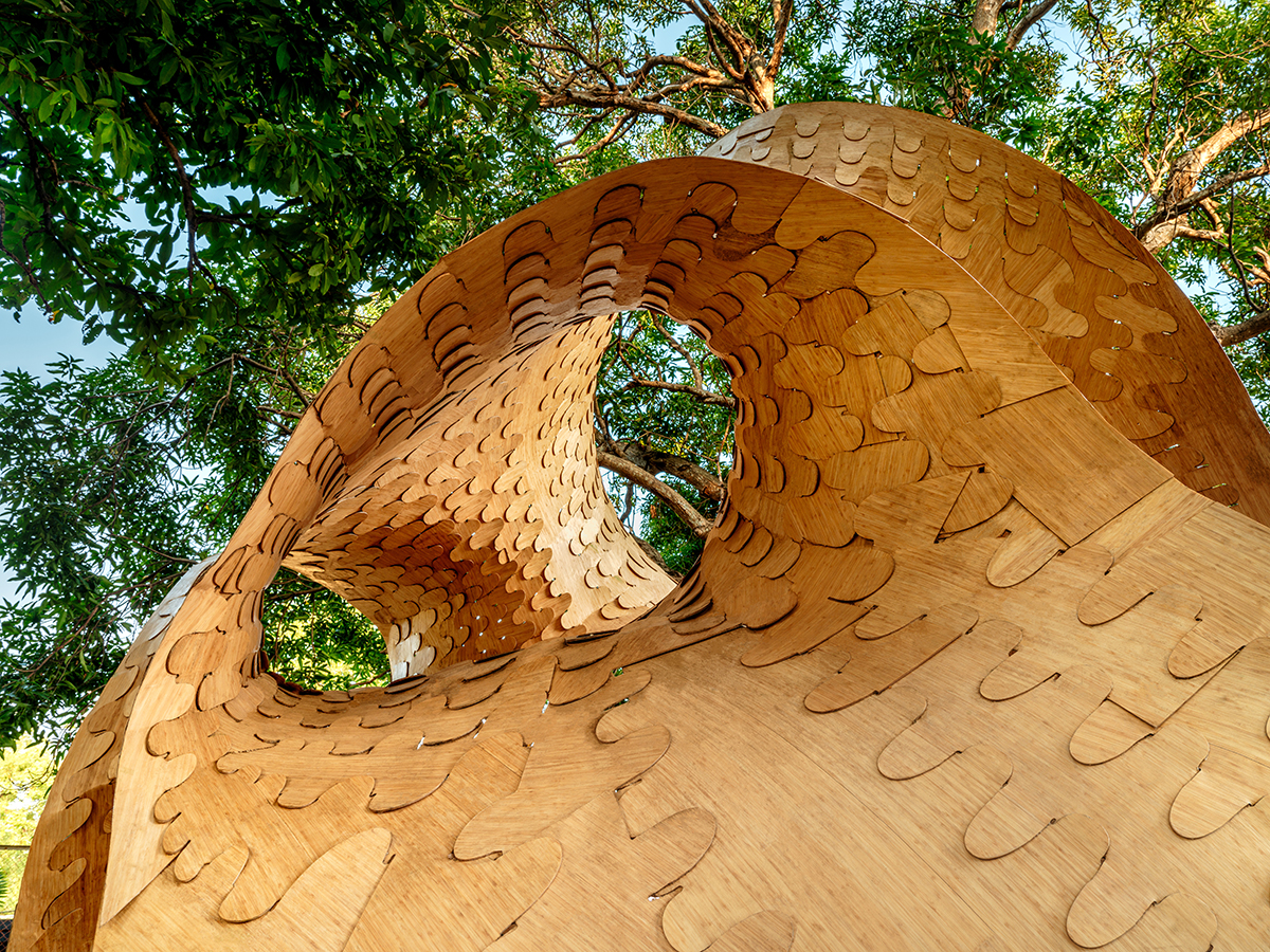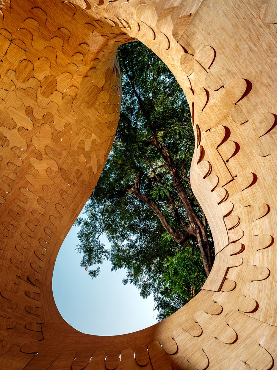 在永續發展為重的今日,竹子因具有作為良好構築之自然材料特性,被廣泛與討論作為建造材料的可能性。而竹子具有強而有力的韌性與彈性,因此,目前大多以原竹型態經過適當處理後,以桿狀方式備運用於構造物當中,而如此一來,材料之間由於生長情況差異(例如:竹節的數目、彎曲、長短等…)往往具有巨大之變異性,難以被系統化運用。而「疊舞竹曲」試圖結合目前自然材料中之「工程木材」概念,以竹複合材(竹片+玻璃纖維材料),透過疊加垂直與水平交互分布之薄竹皮,重新詮釋竹材之可能性,形成一具有優良韌性與彈性之輕盈薄板材料,而透過材料的轉變,進一步帶領型態之解放,重新展現輕盈彎曲型態之竹構可能。