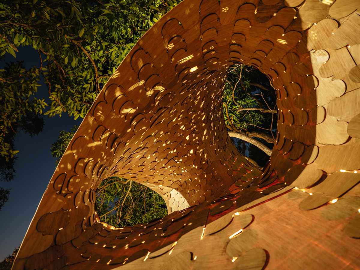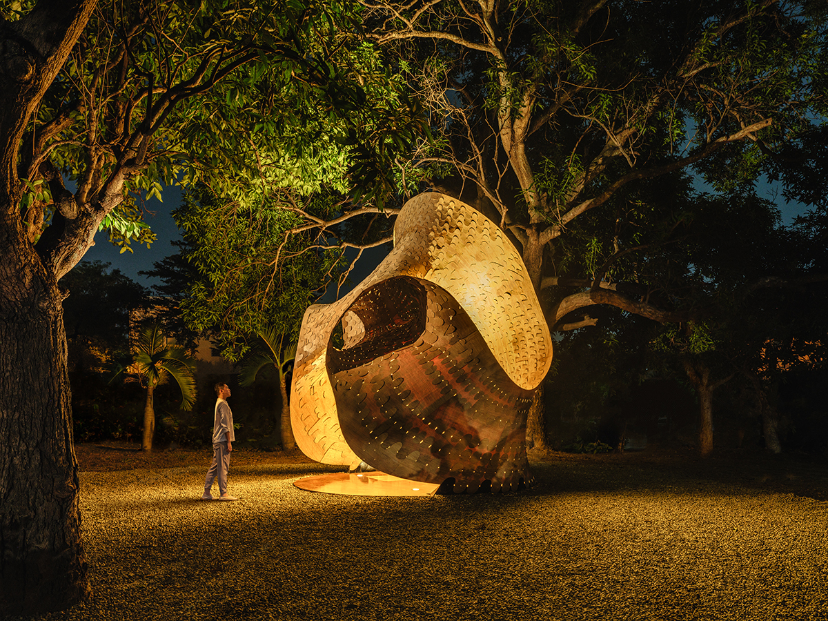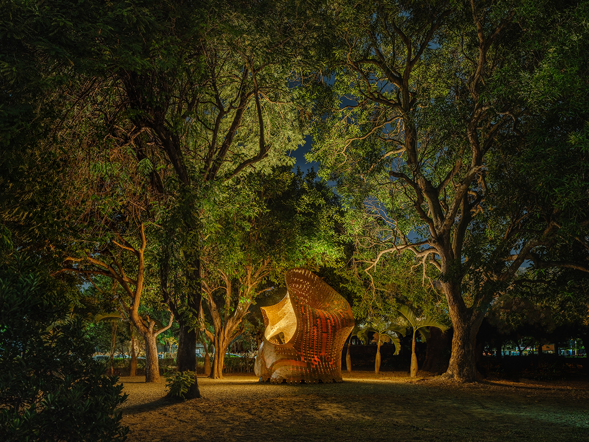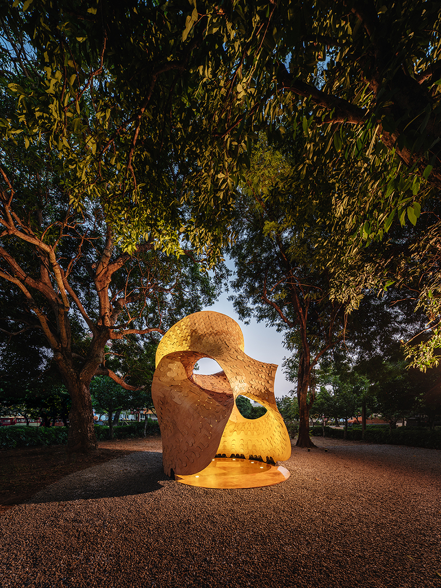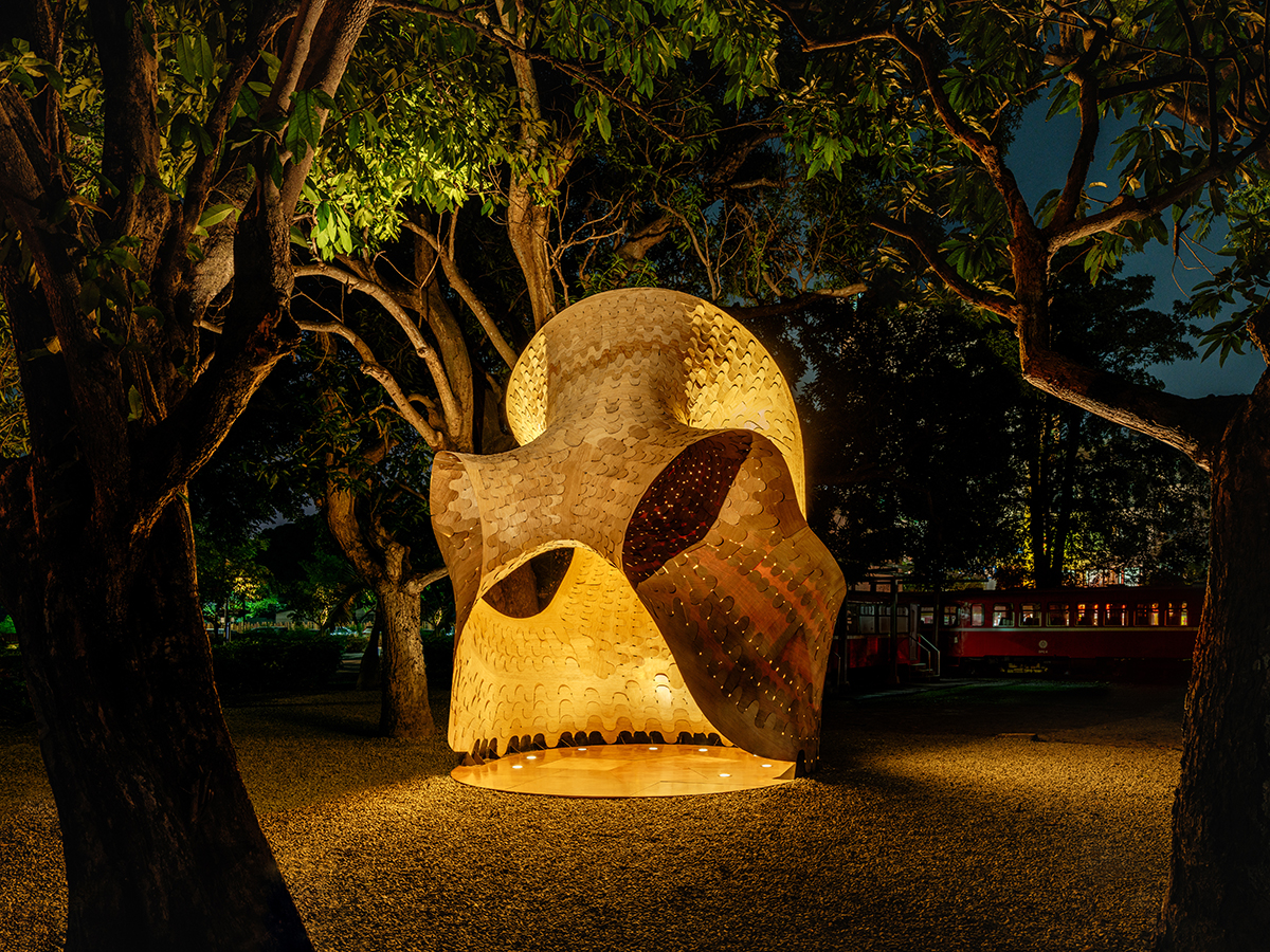 「疊舞竹曲」作品位於嘉義市區阿里山森林鐵路車庫園區當中,其環形之身影藏於一茂密的樹林間,在白日行經的旅客如經過竹林般,望見竹與木色相間匆匆,而當夜色降臨,在作品內部設置的光源(色溫3000K)由內部打出,照映在不規則的曲面上,光沿著曲面流動,幾何的內外兩面被光影清楚的分界於3D的空間當中,而光影從薄竹板中透出纖維線條,不僅呈現輕盈更呈現出了構築的痕跡。而光影更進一步從整個自由的造型「疊舞竹曲」間竄出,光芒散落成星星在包覆的暗空間裡、光芒射出在樹梢上、光芒撒在地上把樹葉都變成黃色的沙,瞬間經過的旅客不再匆匆經過,而是停留下來駐足項是發現森林間發出獨特光亮的構竹旋律,吸引著人漸漸靠近,沿著光線、沿著彎曲,擾動著整場樹林間光影的旋律。