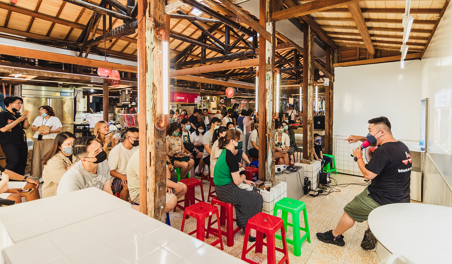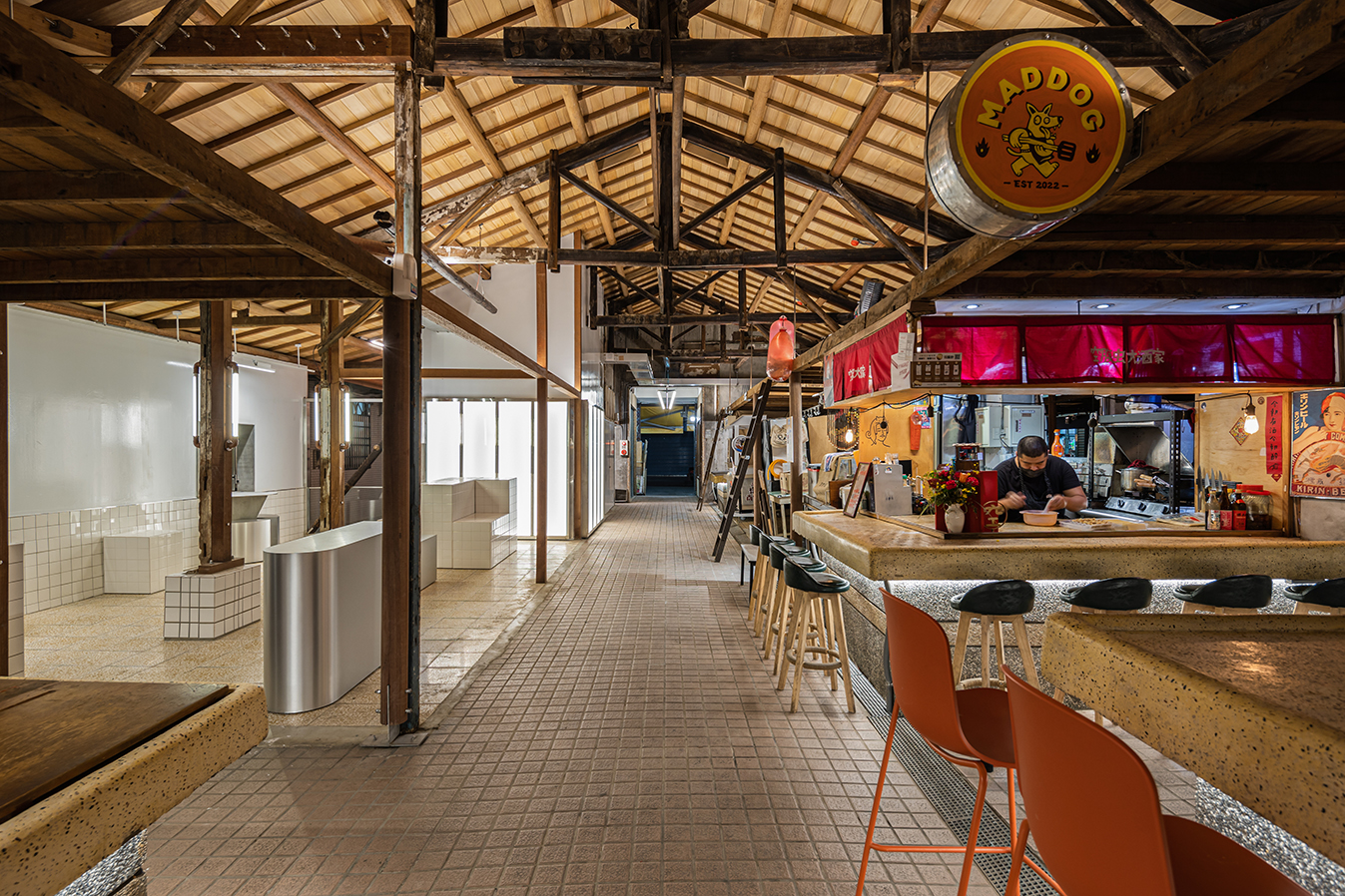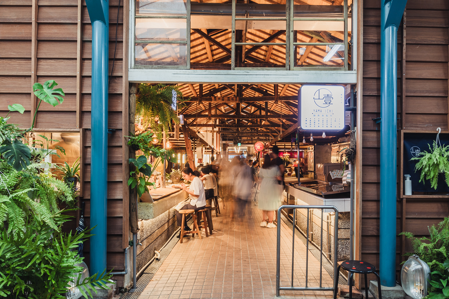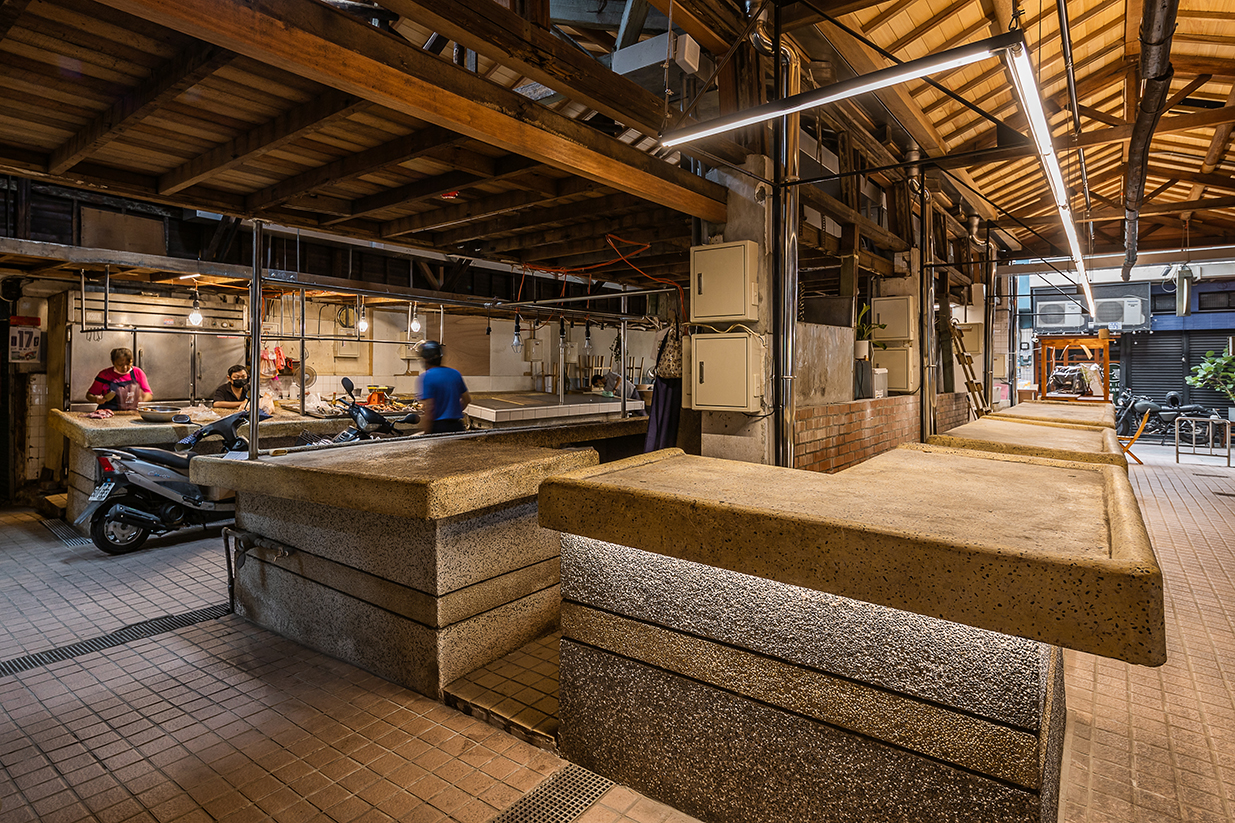 思索著那盞台灣人最習慣的光,同時與傳統攤商及新創老闆們話家常,盼能在言語間找出彼此對於需求與感受的平衡。很幸運能與想法思考卓越的建築師合作,引光入室是個絕妙概念,卻也挑戰傳統攤商對溫度與鮮度的慣性。營業時間從清晨的傳統攤商;黃昏的新舊交織;入夜的年輕老闆,這些條件在在考驗著光環境如何拿捏。