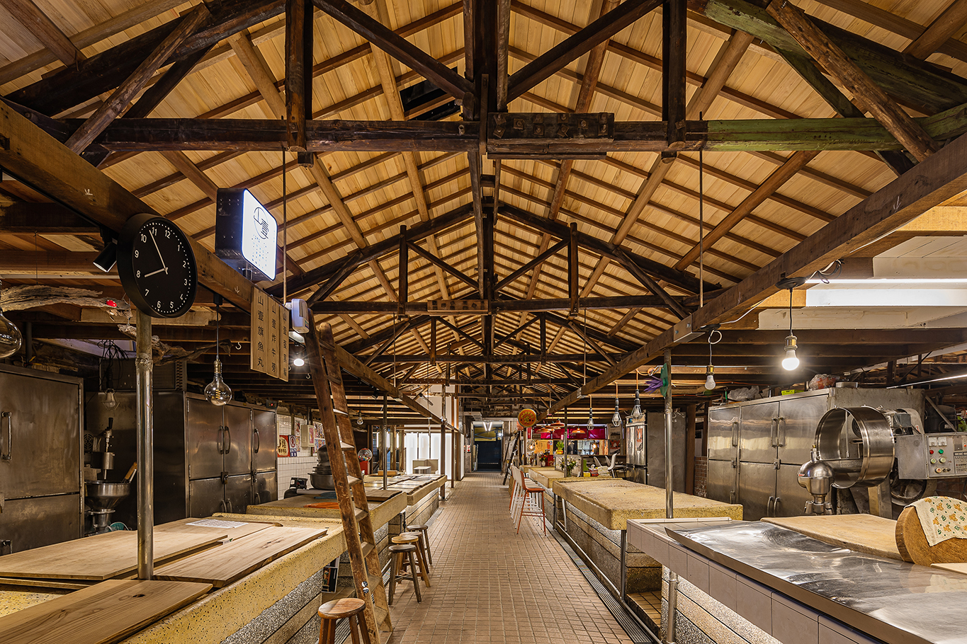 白日裡天光由高處大片大片灑落,人工光源要滿足攤台上的生鮮照明、老闆備料、主顧寒暄;攤台下方提示了動線指引,讓年長者看清路面也提醒用路人一起維護路面整潔.天空中的木桁架屋頂透露出鹽一市場的身世背景,是空間紋理中不可忽視的存在,如何以最輕的手法介入並賦予當代詮釋,成了所有參與者關注的焦點。