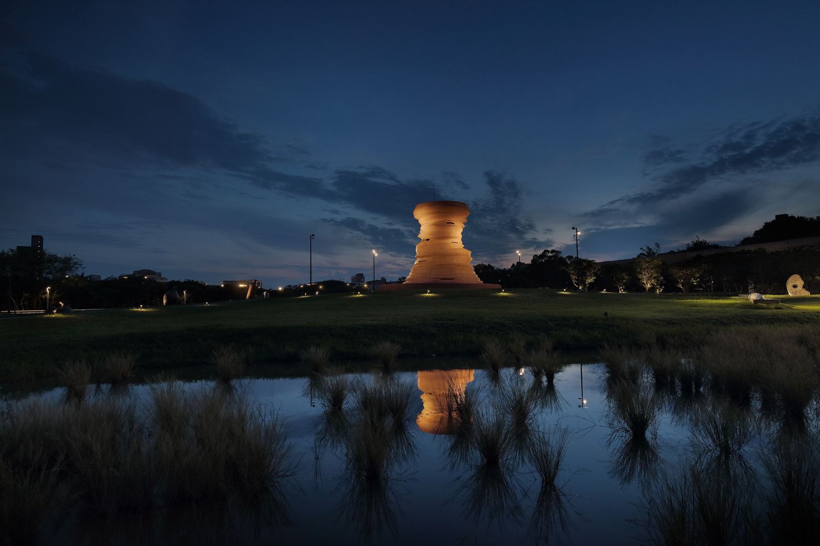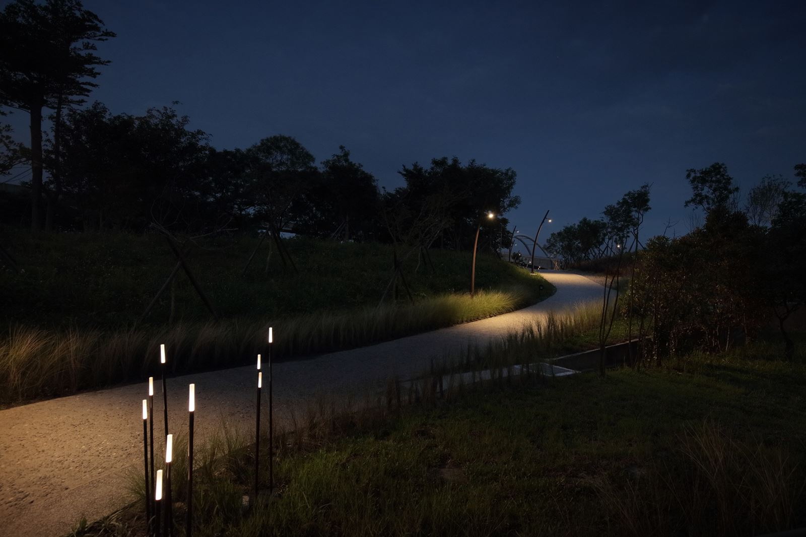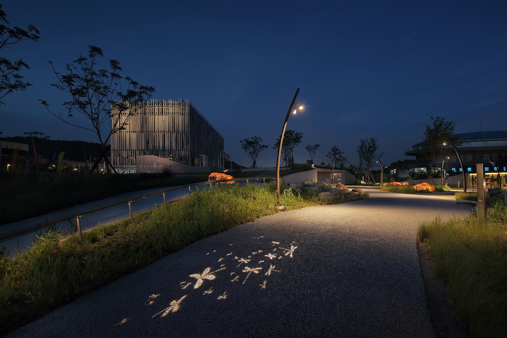 新北市美術館戶外園區照明包含許多與環境呼應的設計,例如仿生蘆葦的景觀高燈、溪畔常見的豆娘圖案燈光投影等等,照明不僅是提供良好的光環境,更進一步地與環境做對話。