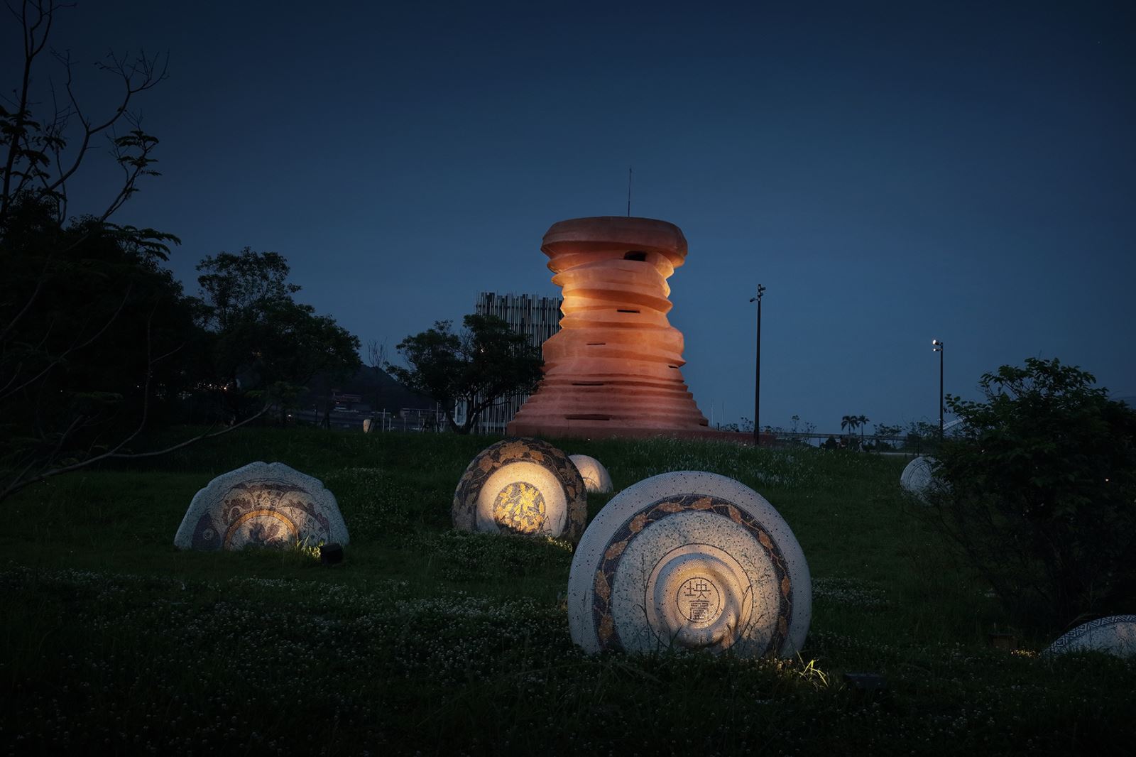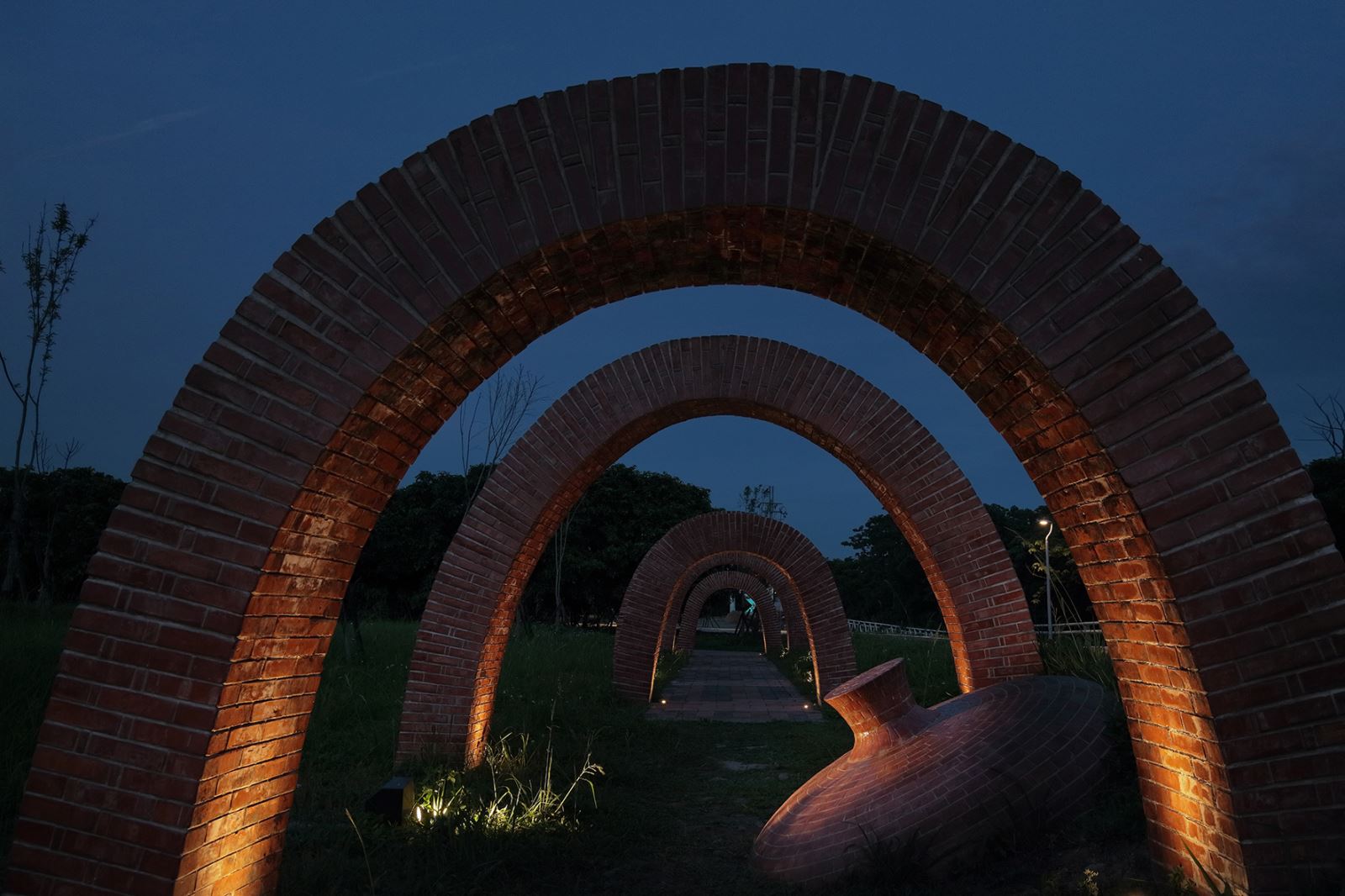 以光影重塑公共藝術品坯、瓷意生活、王者之仗—1804與走泥四件作品的夜間樣貌,以適宜的照明呈現其個自特色又融入整體環境中。透過嚴謹電腦照度計算後,用光映現「坯」的量體美感與「走泥」的紅磚拱型線條空間感。