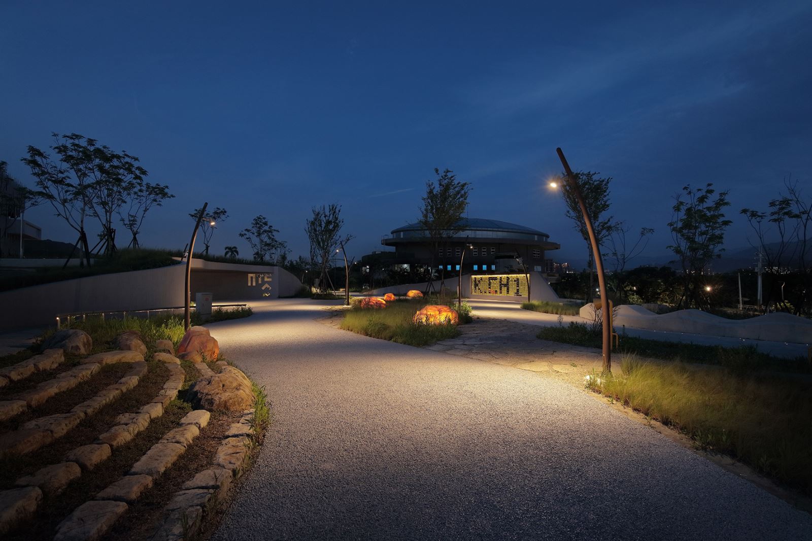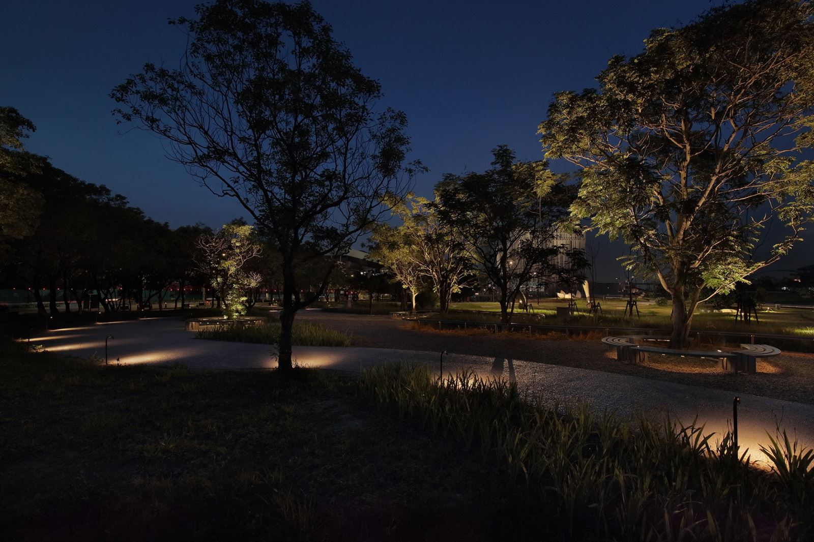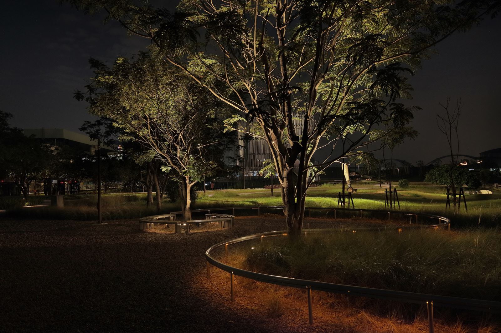 以低尺度的照明方式,金屬弧型飾條與座椅下方間接照明,配合微光吹拂在樹梢上,更襯拖出其後方「坯」的美感。以亮度較低的前景強化後方藝術品,用照明創造夜間空間層次感。