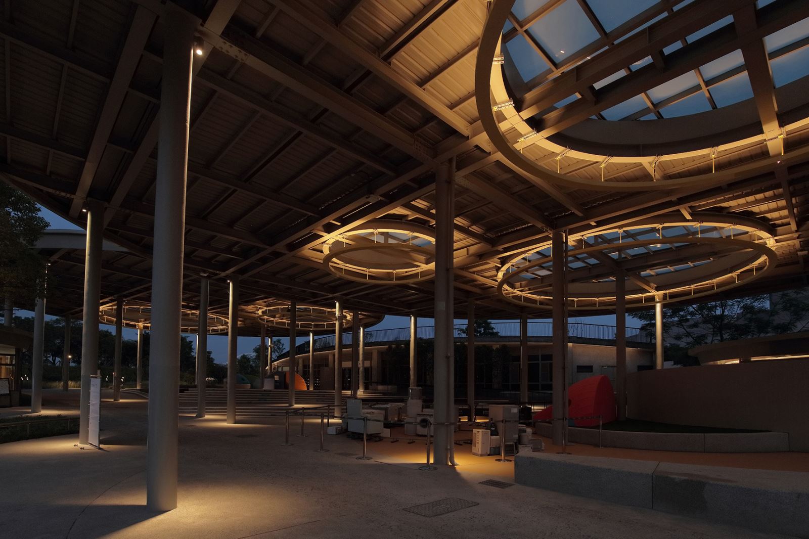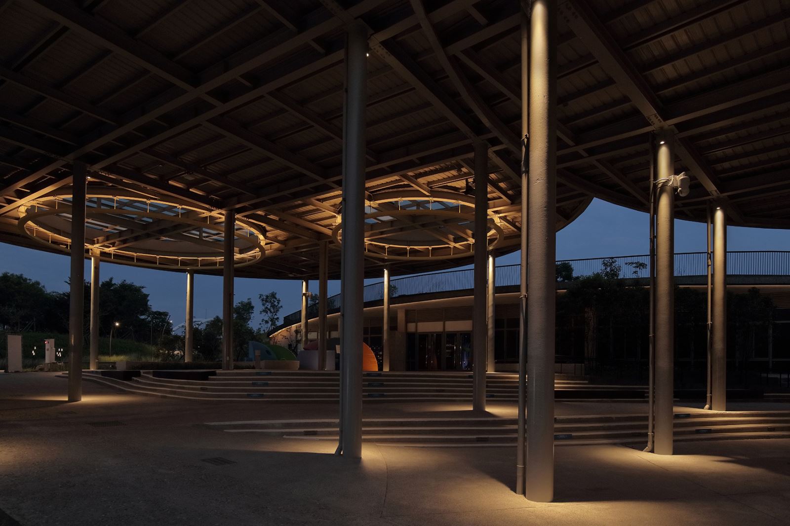 運用原有的圓型透光天棚的設計語彙,照明設計師設計五盞大型圓型吊燈於夜晚向上反射光線,創造空間的趣味與藝術性 ; 而白天灰色系的柱子,也因為適宜的照明方式,反而在夜晚成為空間美感因子。