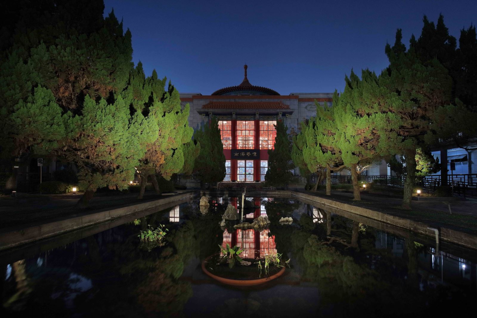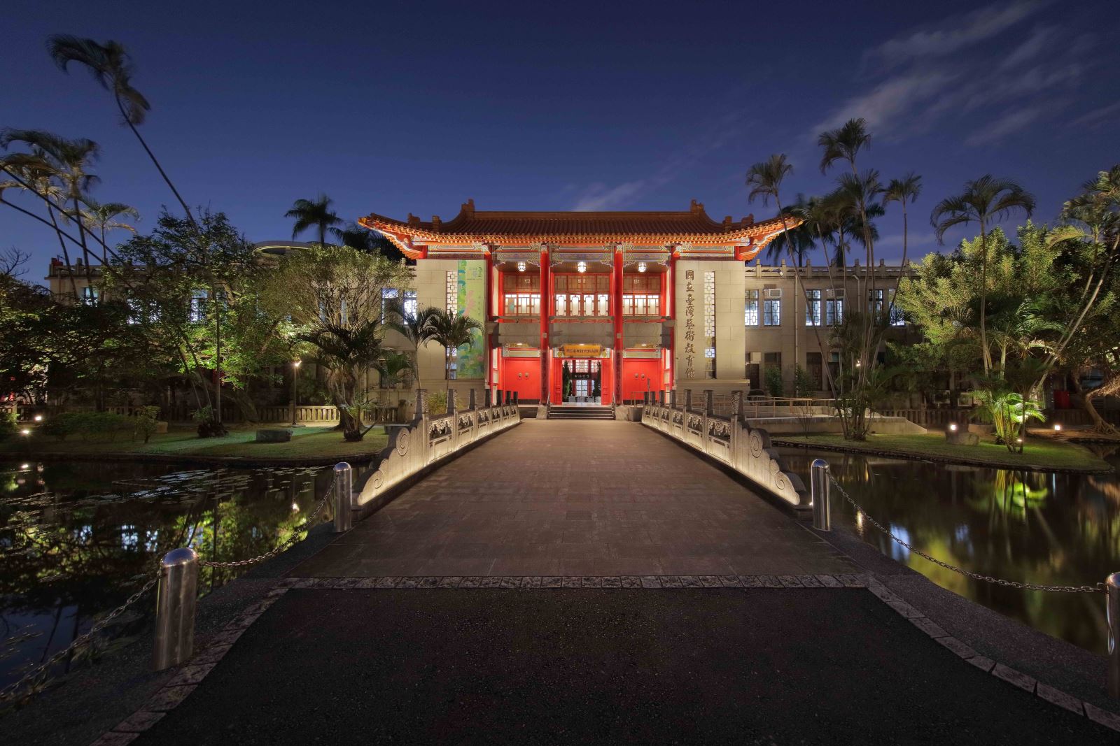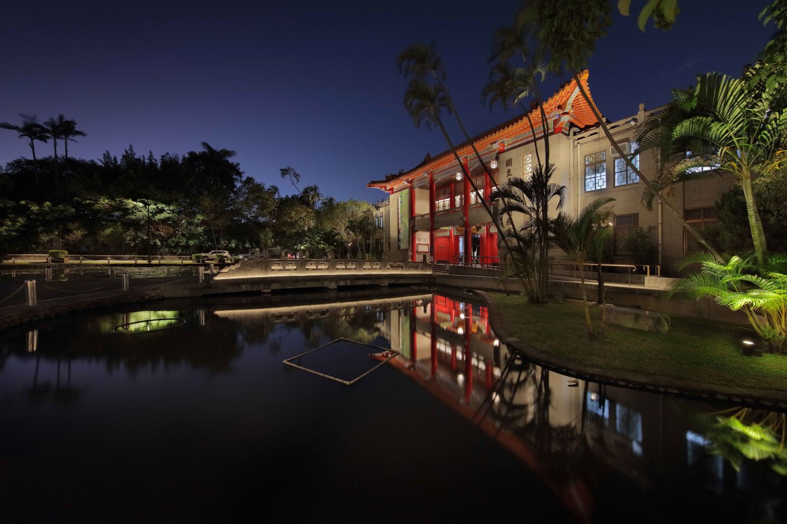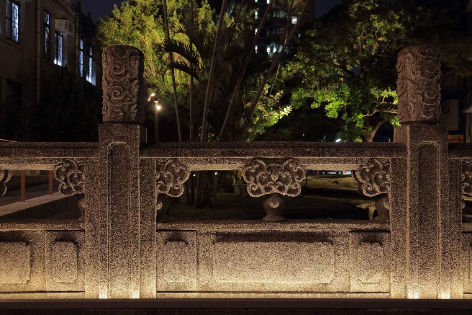 入口前的神橋、周邊步道,以及漢、和、西洋混合建築樣式的建築立面,是整體景觀之門面,也是夜間的視覺焦點。藉由光環境聚焦於中式建築細節,水面倒影結合建築窗櫺立面的內透光效果,使園區由外而內連成一氣,塑造優雅而靜謐的氛圍。漫步橋上,可體驗逐光踏影的趣味;漫遊池畔樹木步道,可欣賞湖水映照至神橋的光影之美。