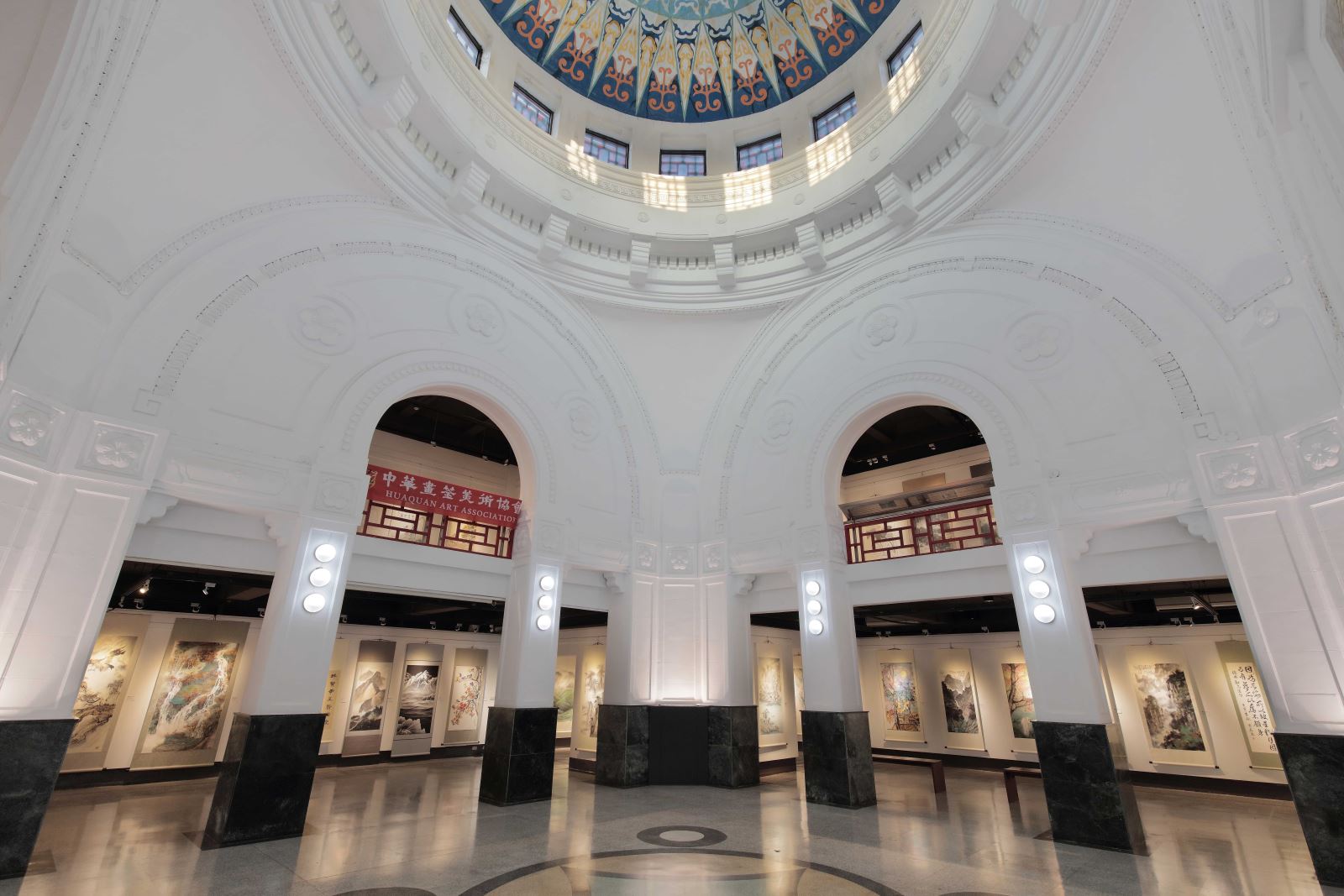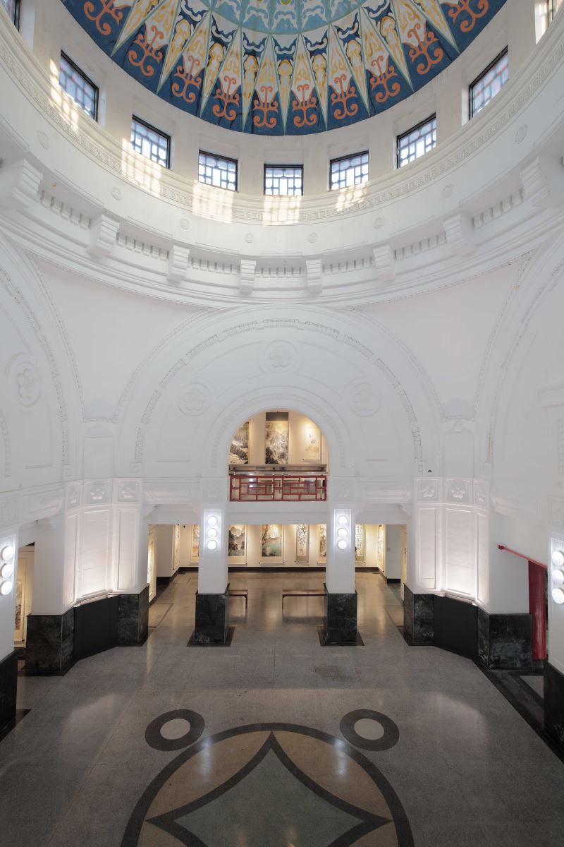 藝教館內,極具歷史意義的第一展覽廳,其中庭為一挑高10餘米的空間,中心頂層穹頂開窗引進自然光照,使第一展覽廳的建築細部特色隨著日光分秒的變化映現豐富的表情。照明設計概念在此空間以自然光照為主,人工光源為輔,藉燈光控制的設定依時序使人工光(雙色溫LED燈具)的色溫隨著日升至正午到日落有著節律變化,同時亦補足空間因天候影響而不足之照明需求。