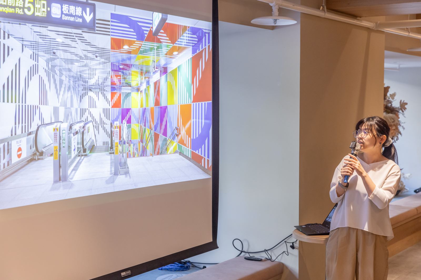 位於環狀線板橋站的「思映之間」,是法國藝術家丹尼爾·布罕(Daniel Buren)的大型公共藝術。藝術家整合車站周圍環境與元素,並將人行動線以及時間的概念融入其中,以慣用的8.7公分條紋的藝術語彙、搭配9種色彩板材及月台15種彩虹列柱,運用高明度、高彩度、高對比的色彩組合,營造強烈的視覺效果。隨著在空間移動,旅客得以沉浸於色彩變化、時光流影之中。