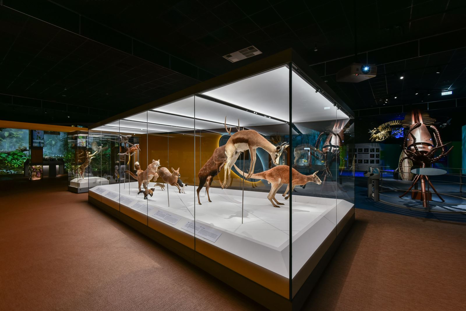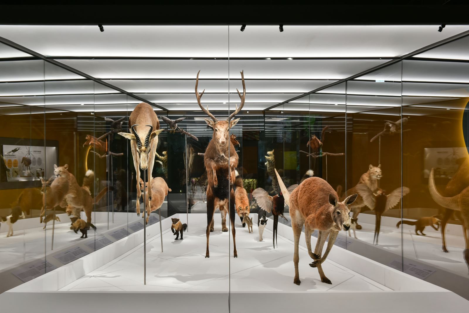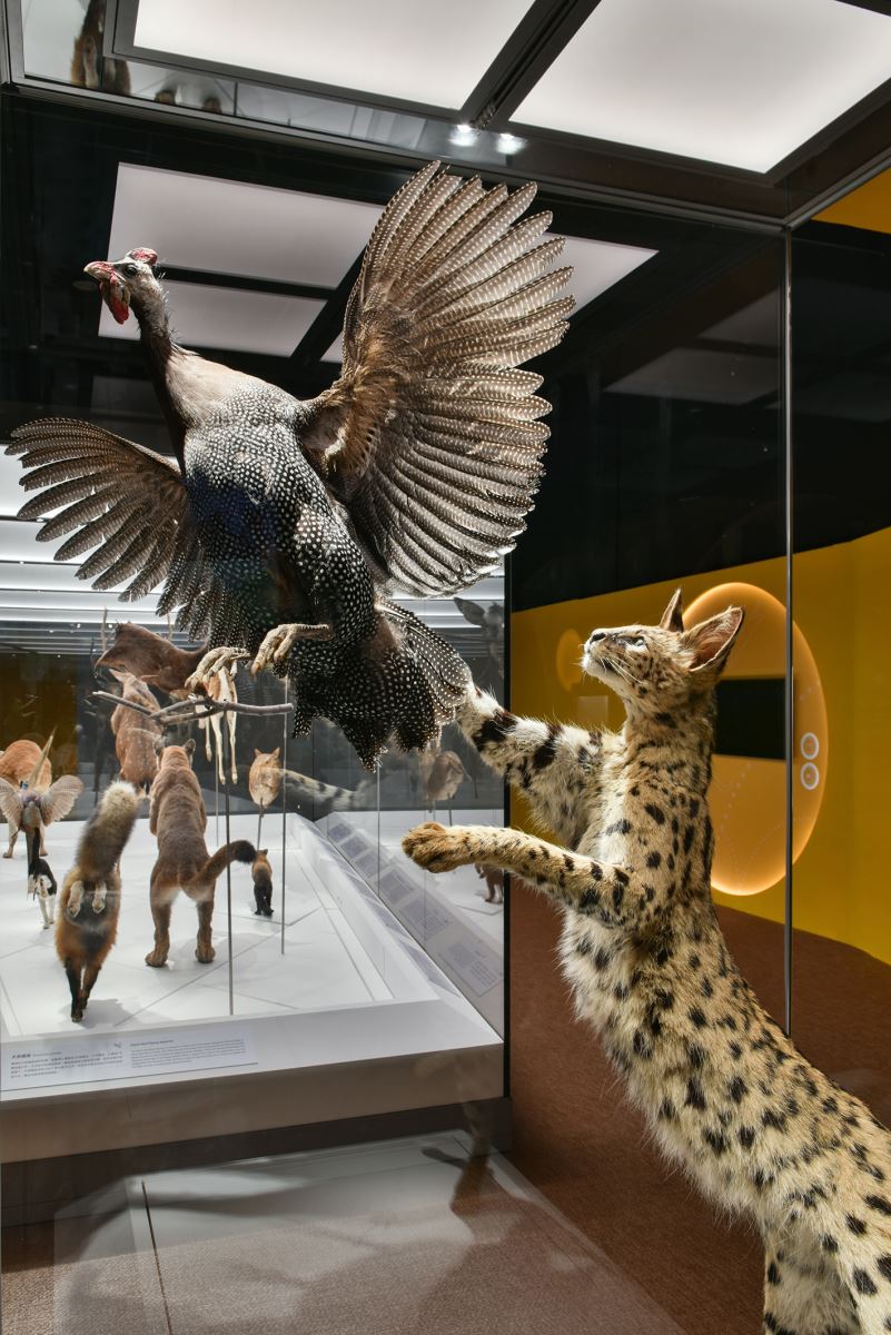 新展廳空間調性為乾淨簡潔的展示風格,以純白色背板為背景,讓觀者可以關注於展示標本、模型的各種細節。照明設計概念則是希望展示標本就像在自然光的環境中讓人欣賞,標本、模型可以完整呈現出其身體姿態及毛髮細節。在對待動物標本時,光線可賦予其生命,重現其姿態與樣貌,在〈動一動:生物力學〉的標本展櫃,用明暗及陰影來強調肉食動物狩獵的兇猛神情,展現草食動物奔跑跳躍的動態線條,讓觀者能充分感受其展示主題。