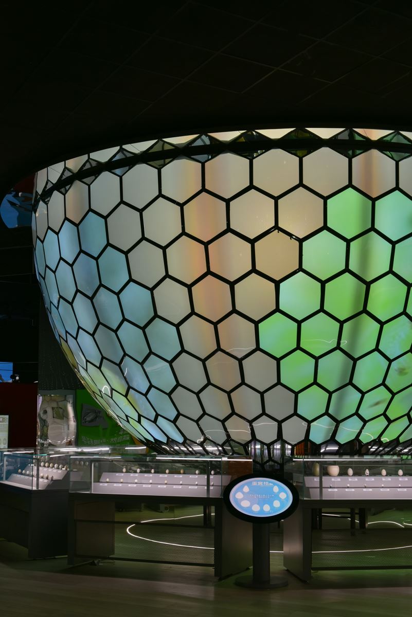 由於新展廳規劃有許多玻璃展櫃,降低玻璃反光不讓其影響觀賞體驗成為重要課題,照明設計需檢驗燈具投射角度,控制各區域明暗對比,讓展櫃內的亮度高於環境,並將燈具設置於櫃內,避免由櫃外投光而產生玻璃反射及眩光,櫃內展示背板及布置以高明度顏色及啞光面材質為主,同時也需調整互動展示螢幕及投影的亮度,還有調配說明圖文版的亮度,目的是避免讓玻璃展櫃產生類似鏡子的反射效果從而影響觀賞體驗。