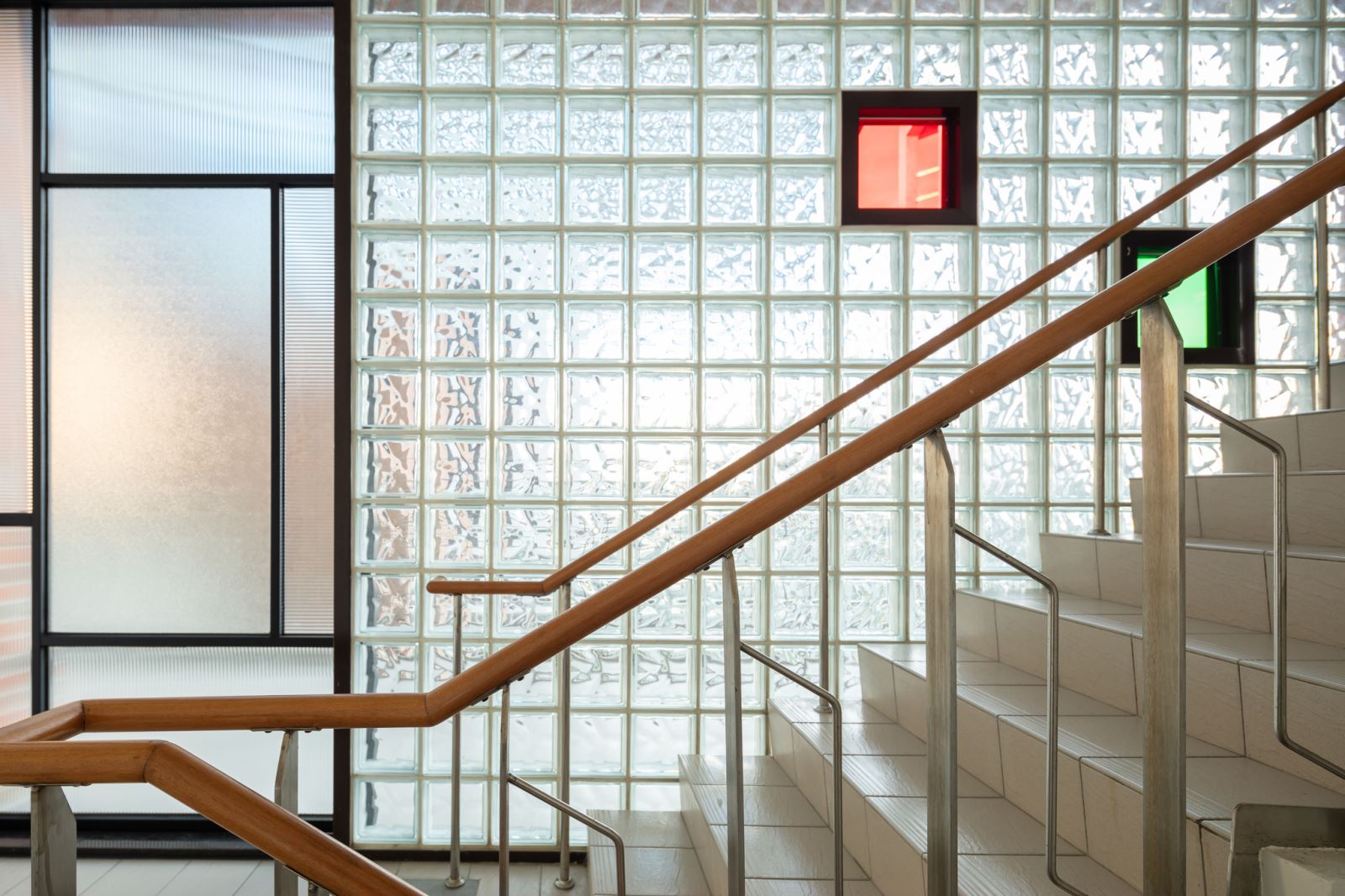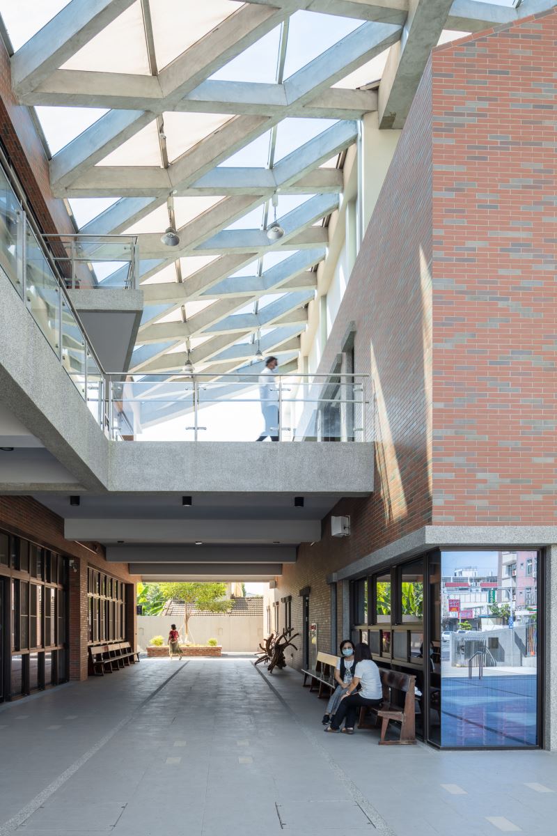 兩棟建築相隔6米,以二樓活動平台銜接,其上有菱形格子樑之採光玻璃屋頂,引入陽光,使三樓陽台及二樓活動平台保有充足採光,一樓則是舒適涼爽的風巷穿廊,多層次的半戶外空間提供了聚會、交誼、節慶活動的優質場所。