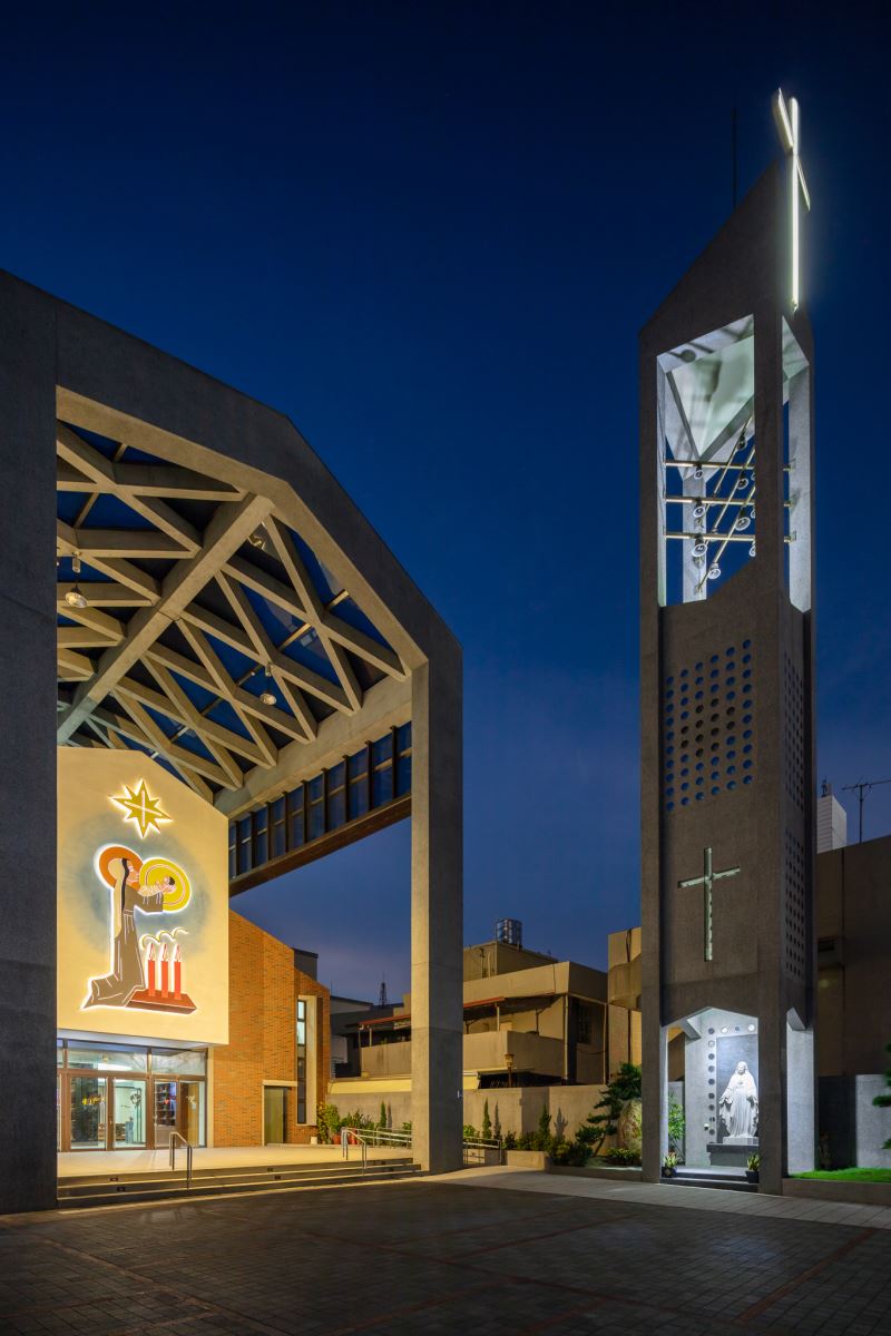 白天的美是隨時間流轉之建築光影變化,夜間燈光照明,則以重點照明彰顯聖母聖心浮雕像、聖母亭及鐘樓十字架等宗教主題。