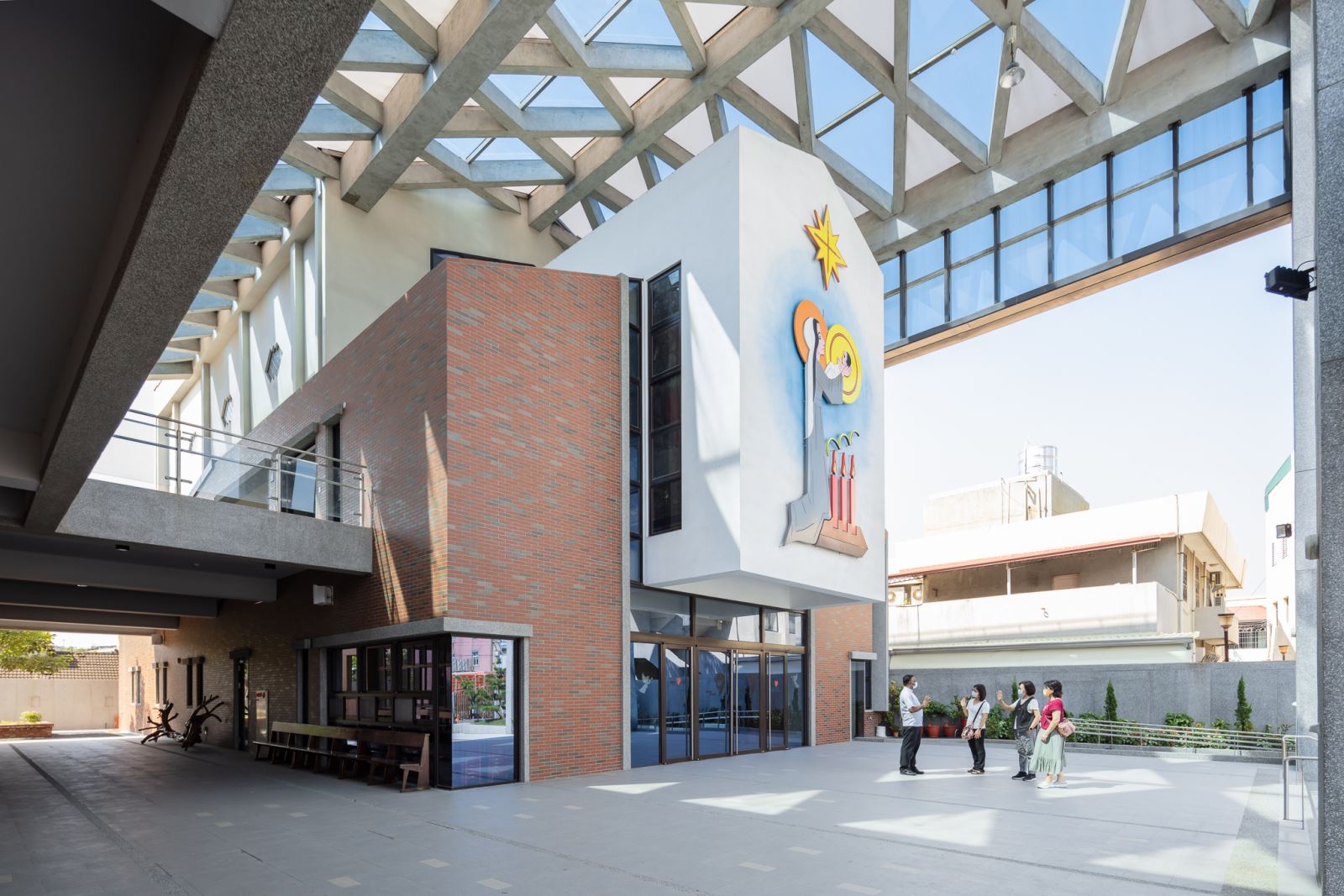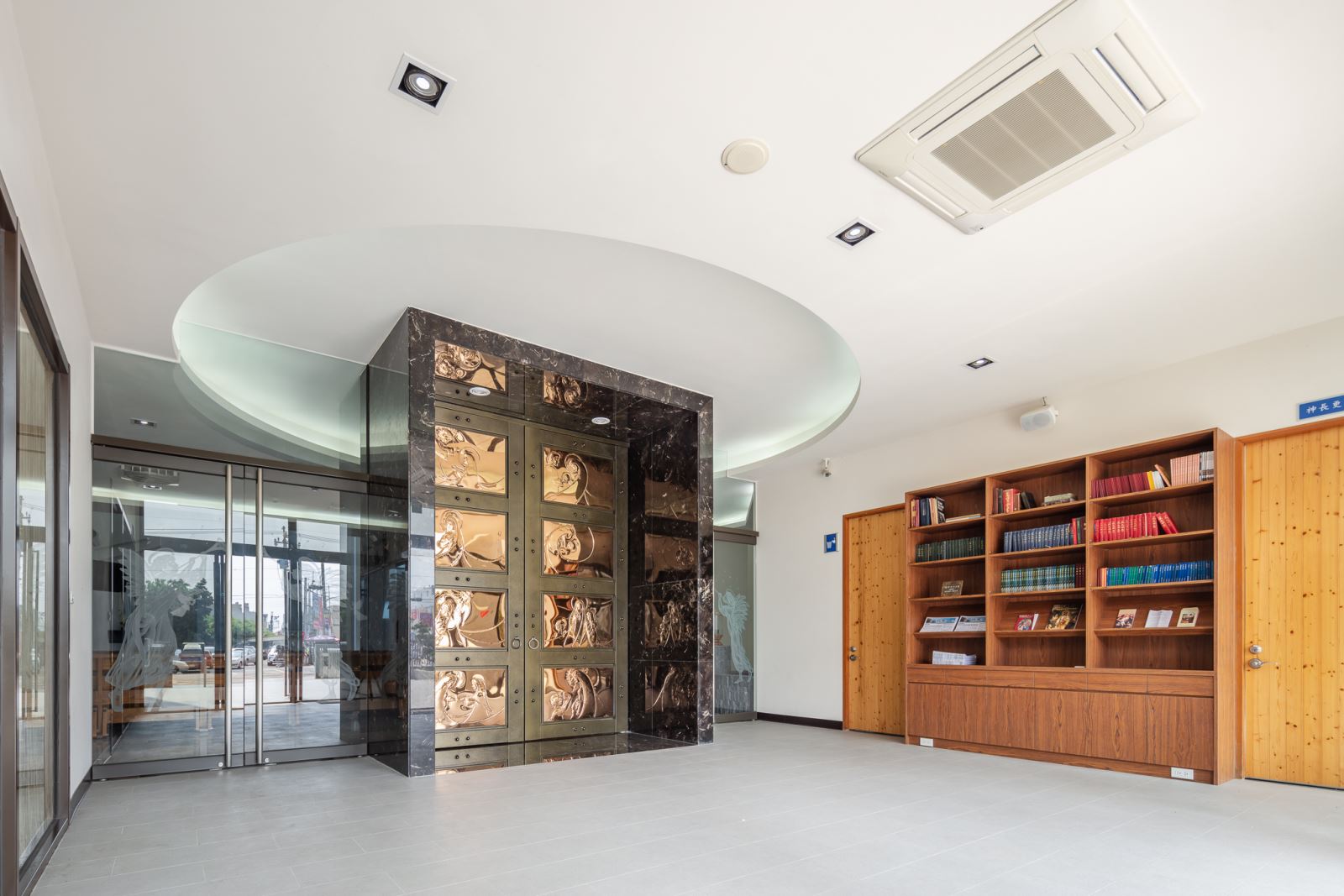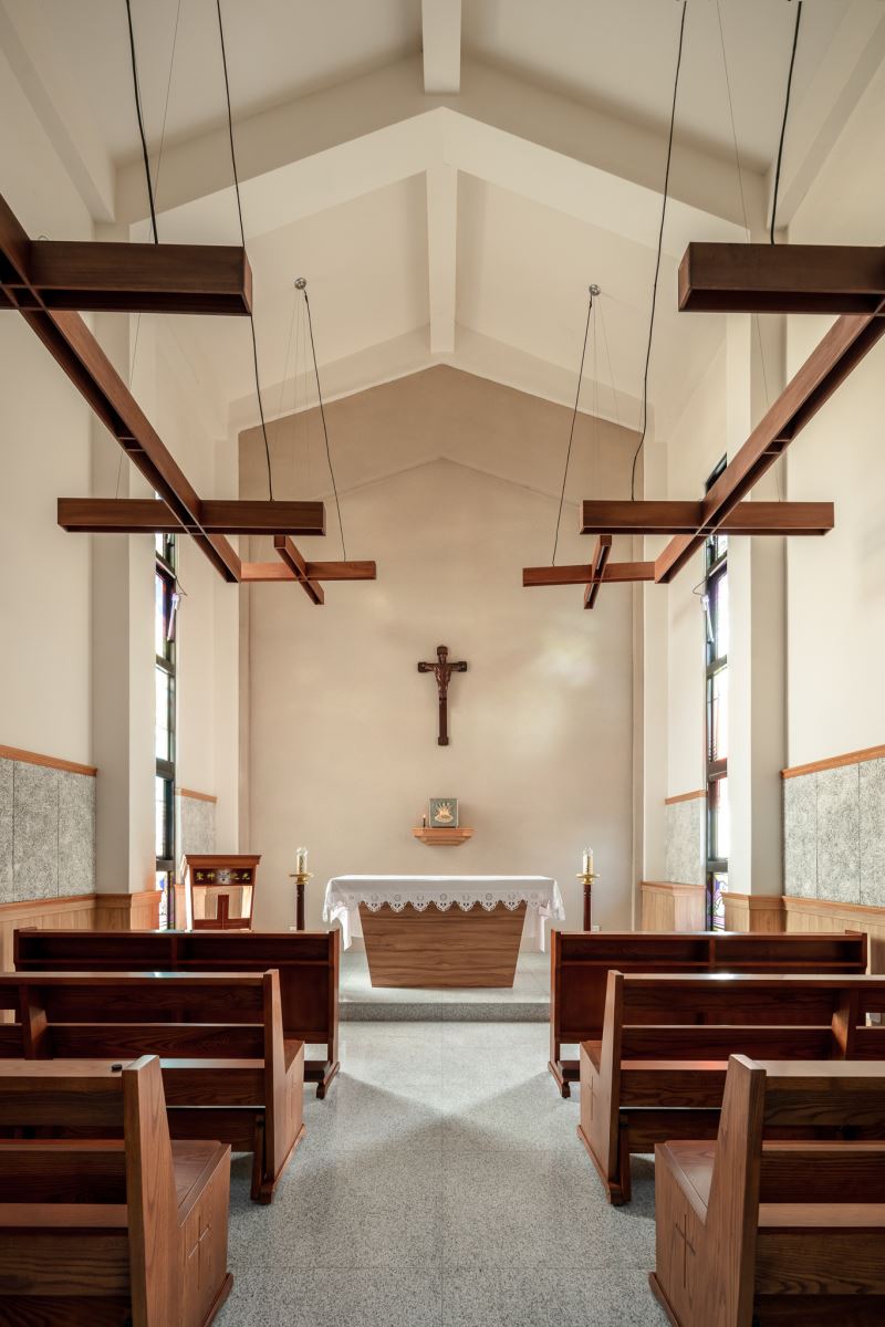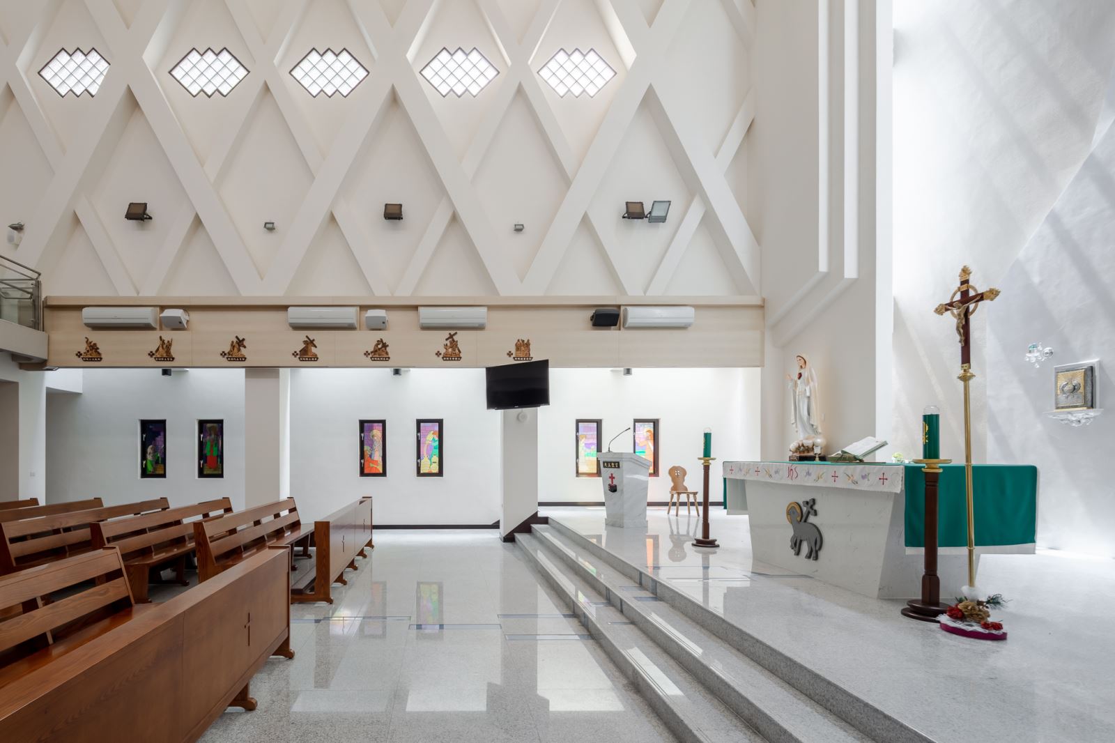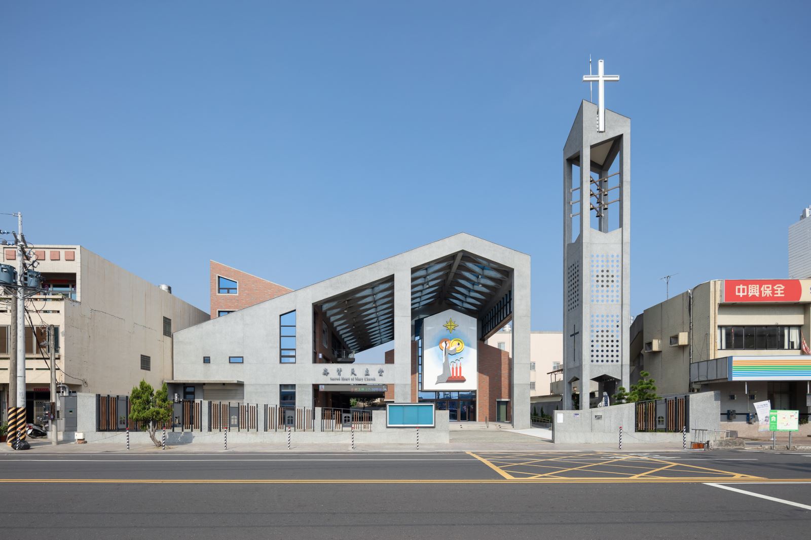 整體建物主要由聖母亭/鐘樓、教堂棟以及服務棟合理適切配置於基地上,教堂棟與服務棟機能獨立,兩棟之連結則透過一樓穿廊及二樓活動平台串接在一起,而屋頂菱形格子樑天窗順應外觀造型,覆蓋三樓陽台、二樓活動平台以及教堂棟前廊,提供全天候不受氣候影響之半戶外陽光穿廊活動空間。