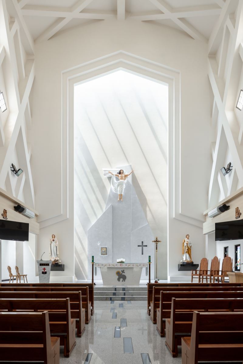 教堂的配置由前院、聖母亭/鐘樓、教堂棟依進堂空間序列並輔以服務棟適切安排。整體建物自南光路退縮留設前院,作為都市空間的緩衝帶,也做為進入教堂前心靈沉澱的場所,因此前院右側設置聖母亭/鐘樓做為進入聖堂前的靜心祈禱空間。進堂之序列則是由半戶外門廊進入前廳,通過聖門後即進入教堂內部。教堂內面對祭台左側柱廊及祭台背牆上方設計採光天窗,陽光照亮柱廊並一路延伸至祭台背牆,隨著時間流轉,聖所充滿光影變化,引領人們仰望天主的國度。