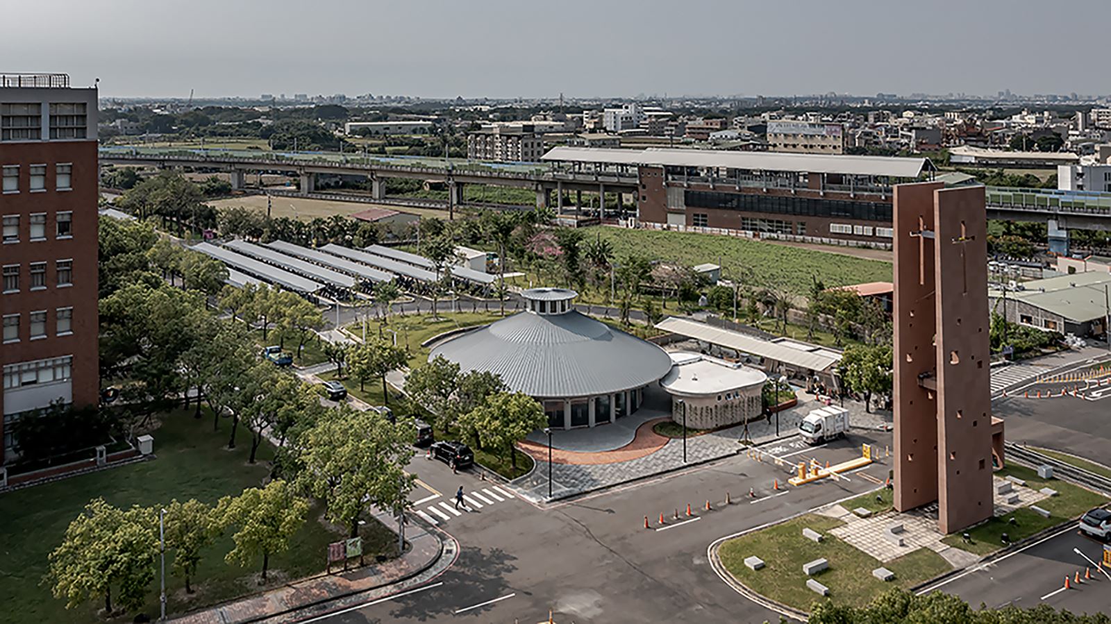 使用淺色金屬屋頂,具有高反射率,可提高屋頂阻擋太陽輻射的能力。同時,為提高屋頂熱阻性,使用厚達12公分的隔熱層,以防止出現熱橋效應。長榮堂整體是一圓形的空間,本身具有儀式感,穹頂上通風換氣的太子樓也是天光的入口,清晨、黃昏時天光自穹頂中心灑下,風吹動竹風鈴的噠噠聲,也搖曳著竹風鈴的十字架,希望學子在莊嚴殿堂中領納真理的洗滌。