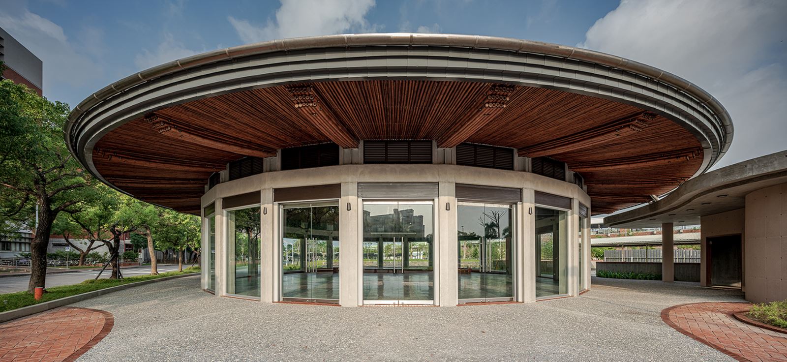長榮堂作為進入長榮大學校園後的第一棟建築,被寄予提供多功能活動,偏向精神性、或公共性的活動,它是一個集會空間,也可以三兩師生休憩、靜思的空間。走進長榮堂的視覺焦點,就是環繞圓心的24組半月形竹桁架。由每組竹桁架以鋼構為接頭,以臺灣本地的孟宗竹、桂竹為骨幹。靠近地面的柱樑為RC結構,RC環樑以上則為竹構。弧形的下弦是室內最主要的空間亮點,是結構的同時也充滿了藝術的表現力。設計上為了追求視線的穿透感,本案24跨距內有23面牆使用玻璃。為了同時兼顧節能效益,設計了3米深的出簷環繞建築。簷高3.5米,簷深3.2米,因此在太陽角度高於42度的時候,出簷都可以完全遮擋陽光。