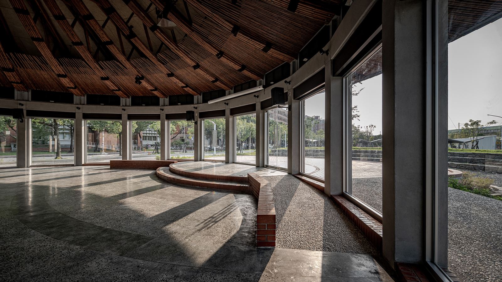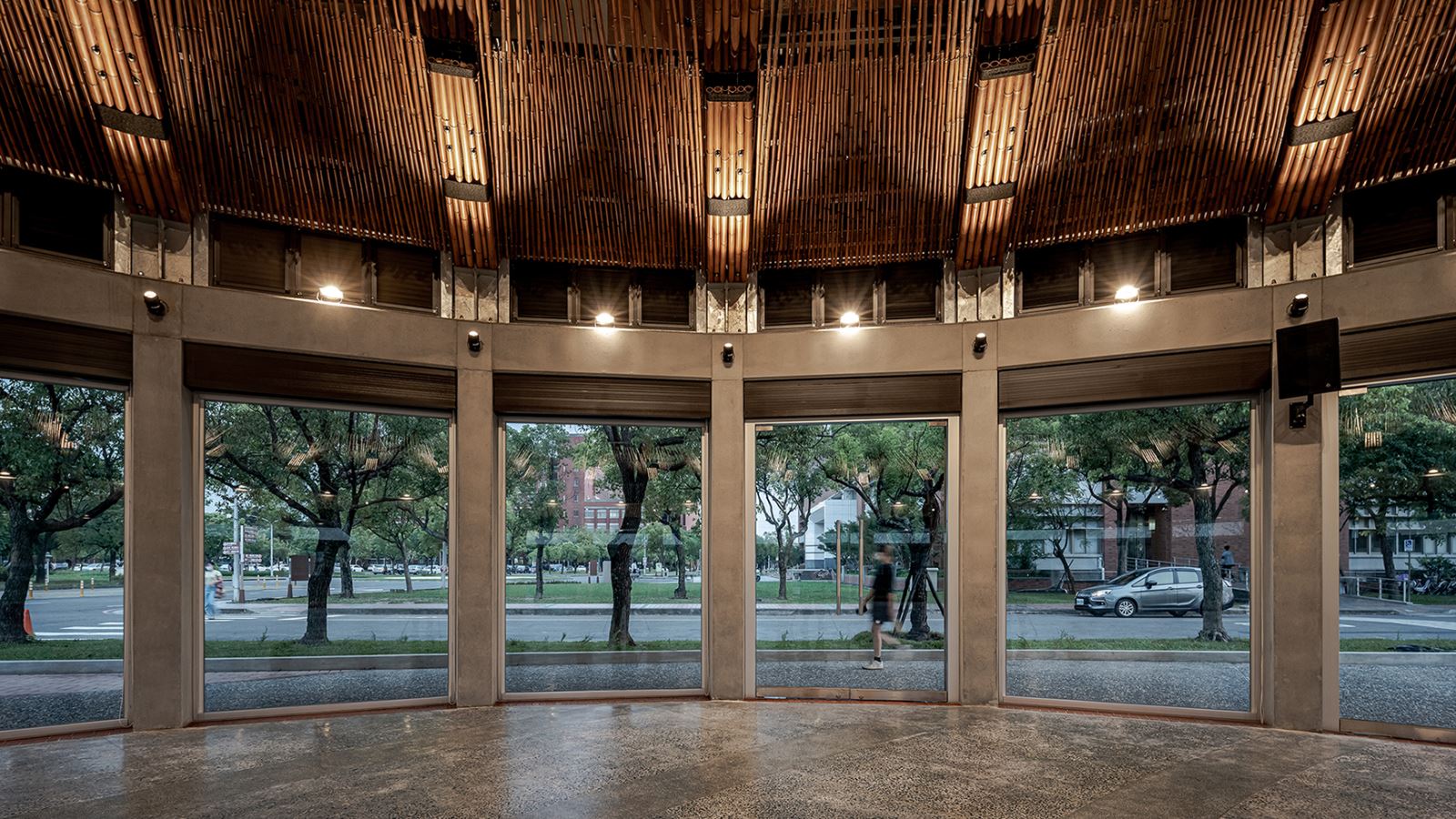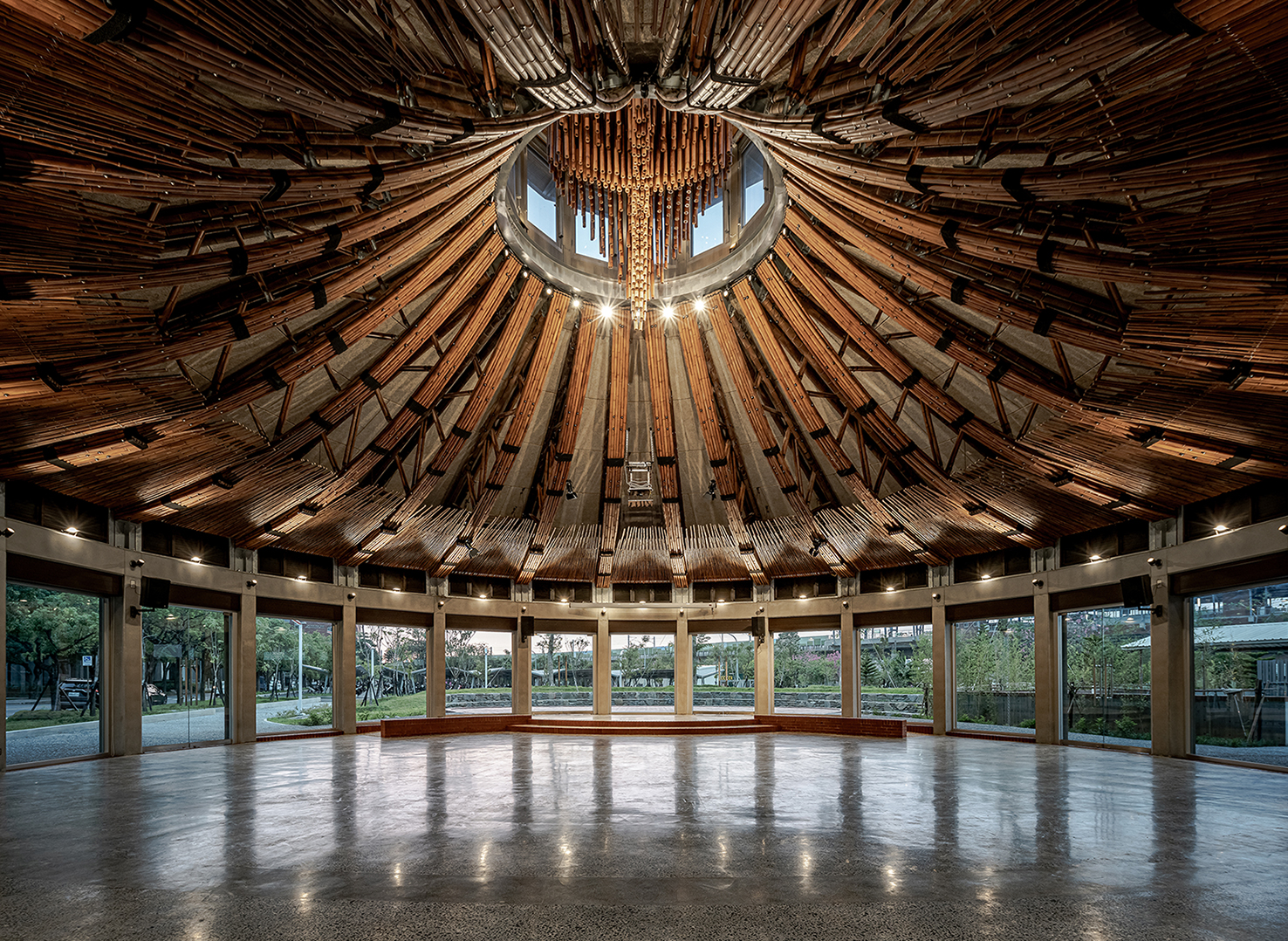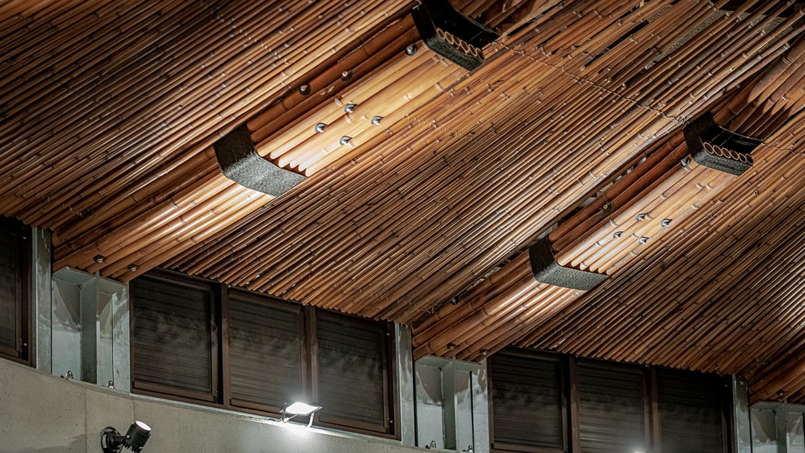 做為多功能使用的空間,照明系統的規劃以配合空間的使用需求,從設置於高處的下照投光燈具提供高照度的照明環境,但同時也透過設置於環梁上的投光燈,打亮室內極具特色的二十四組半月形竹桁架,讓原本隱蔽於陰影內的天花板與桁架,能躍入使用者的視野之中,在照明的功能與感官需求同時被照顧。