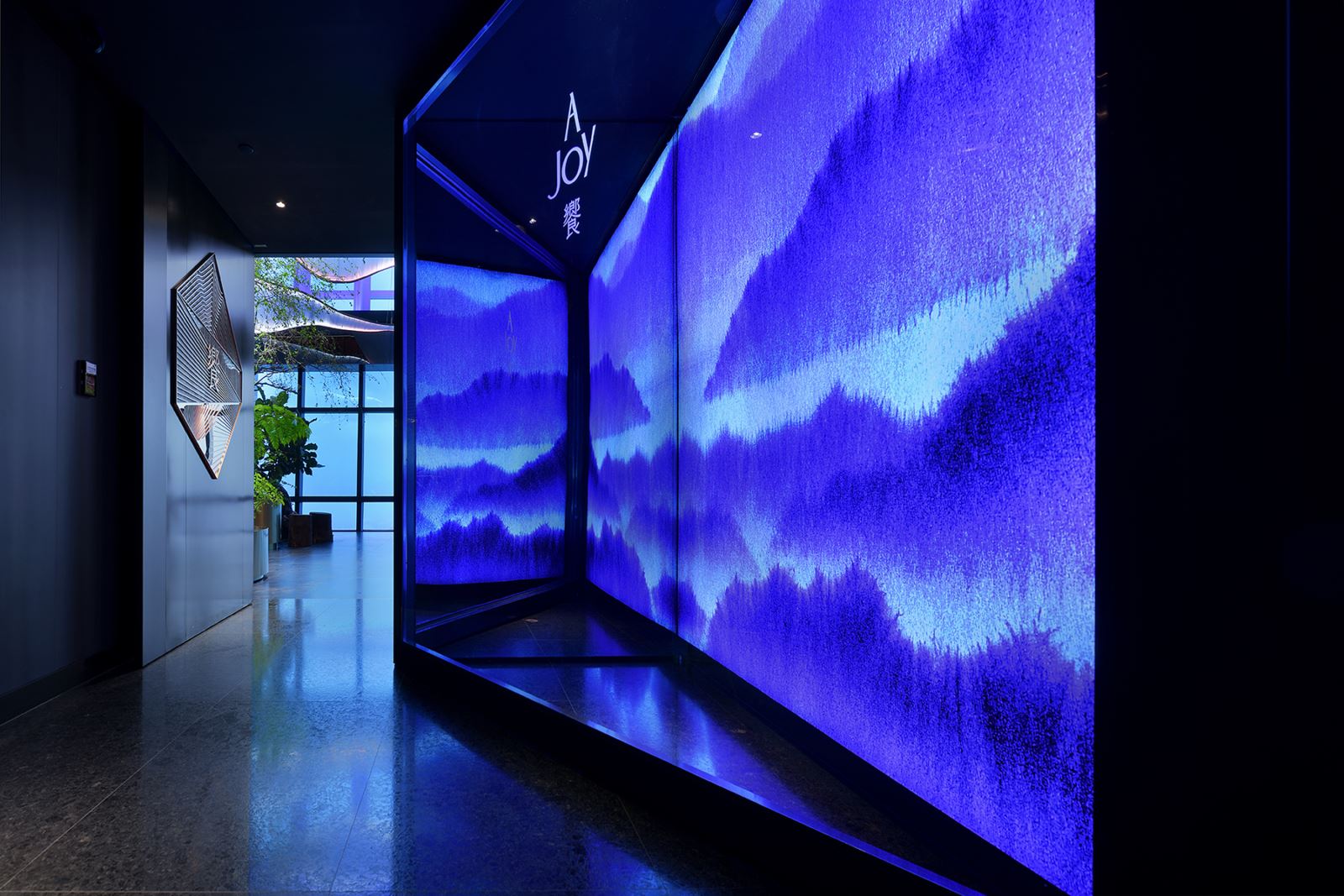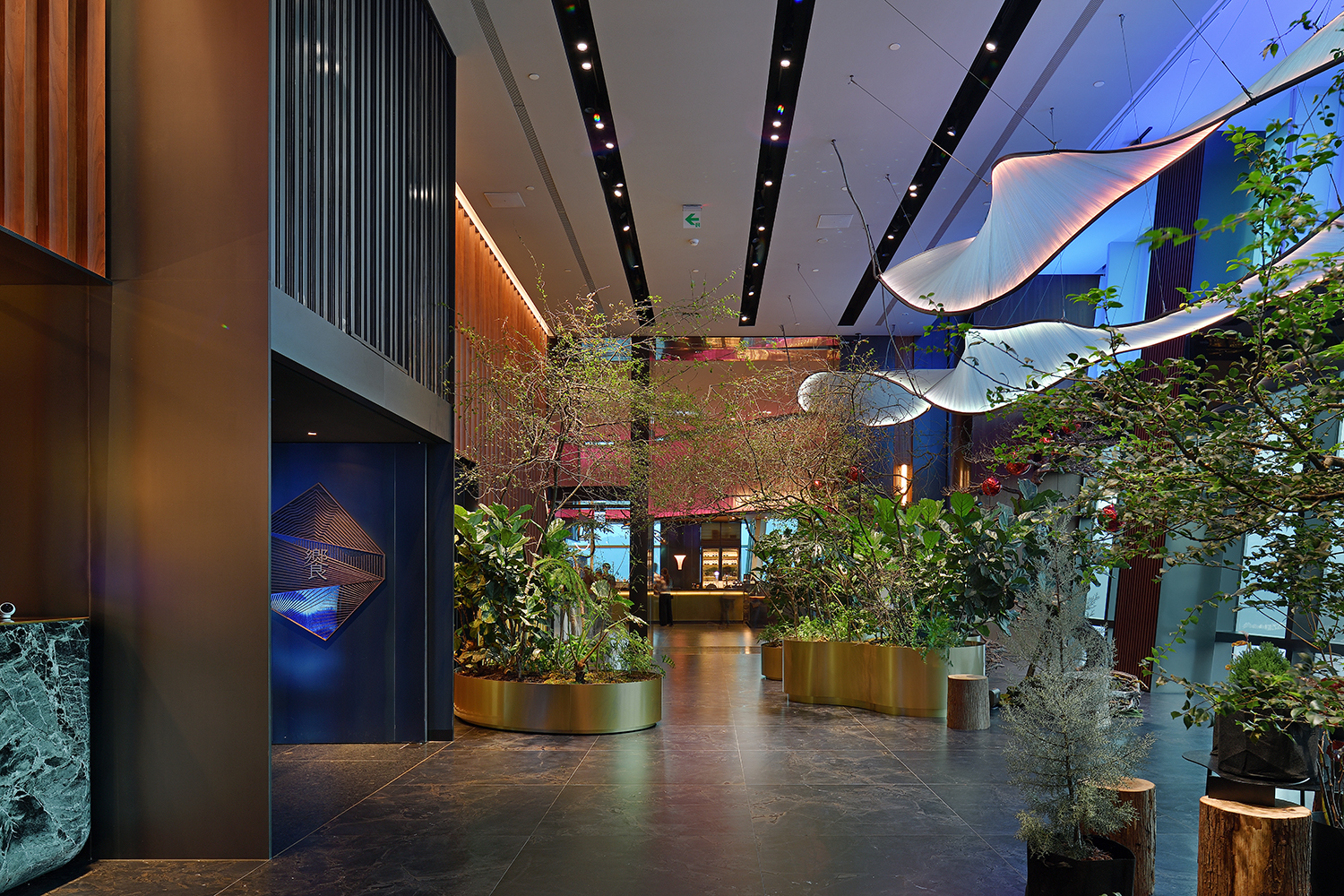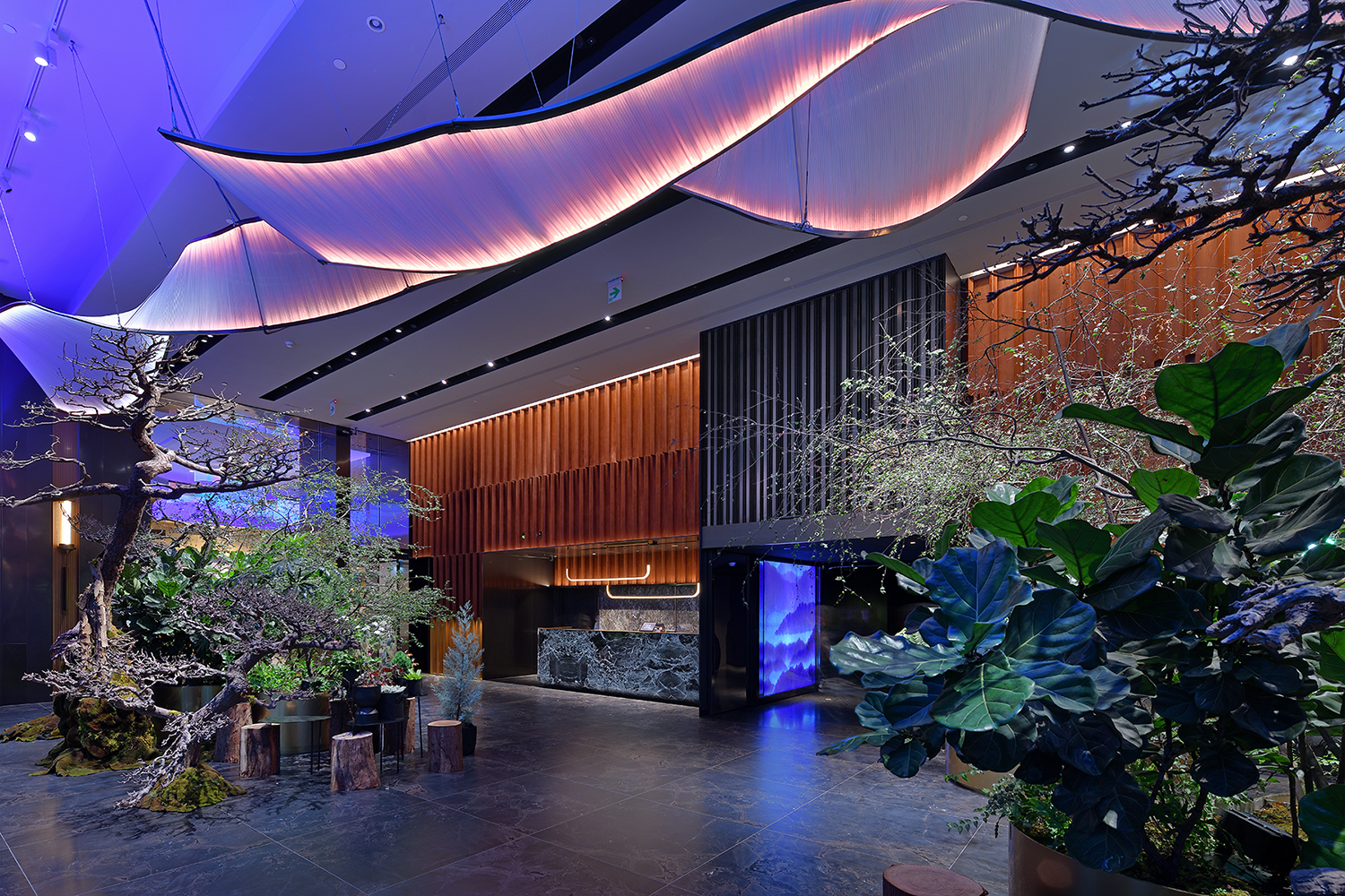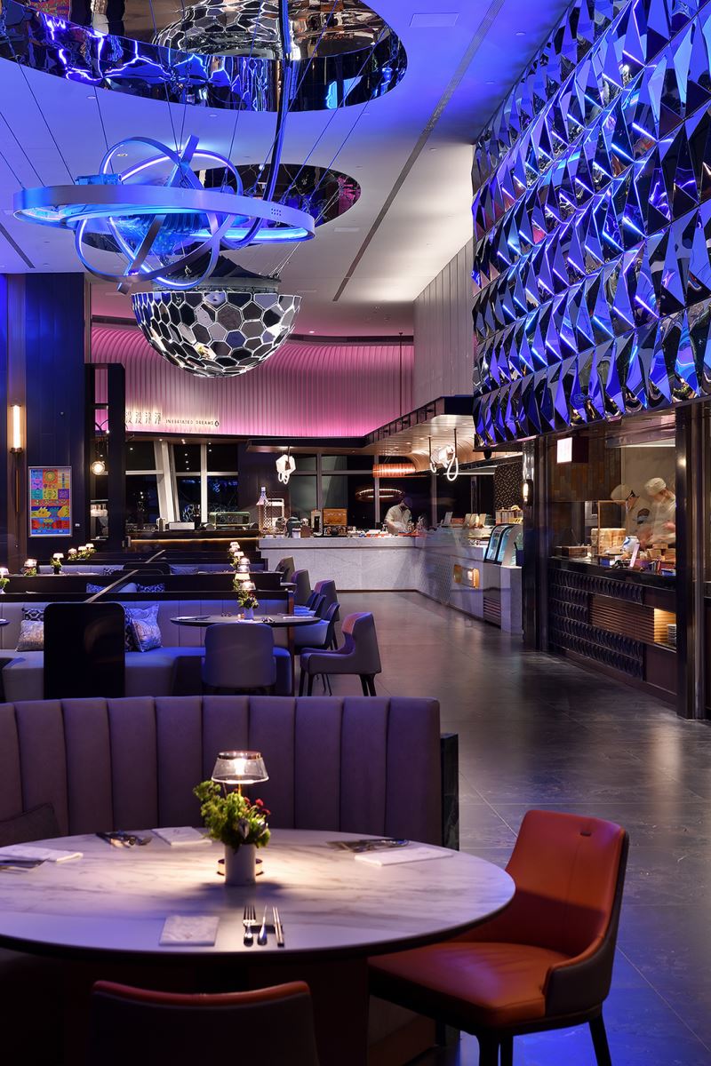在本案的場景中,照明的功能已超越了一般性目的,不僅引導了空間流動、配合室內設計整合了空間尺度感,提升了空間氛圍,還達到了更高層次的藝術性。在滿足各區域,例如備餐工作區、取餐展示台、用餐座位區、賓客接待區等機能性需求的同時,照明系統以精細且有秩序的方式一一系統化的處理性質迥異的被照面,包含各種尺度、高程、質感、形狀、材質、色彩、透明度、姿態和紋理等。舉例來說,通過高天花遙控燈具系統的設置,確保能因應下方自然植物生長的永續維護和對焦的可行性;而透過特調混色光與室內設計區域主題相輔相成,能夠清晰地劃分出各自的視覺主題,再局部佐以動態流動的燈光效果,呼應區域定調的未來感,以提升場景的豐富度;而運用弧形軌道不僅確保天花線條與裝置藝術的呼應,從而實現整體的和諧與融合。