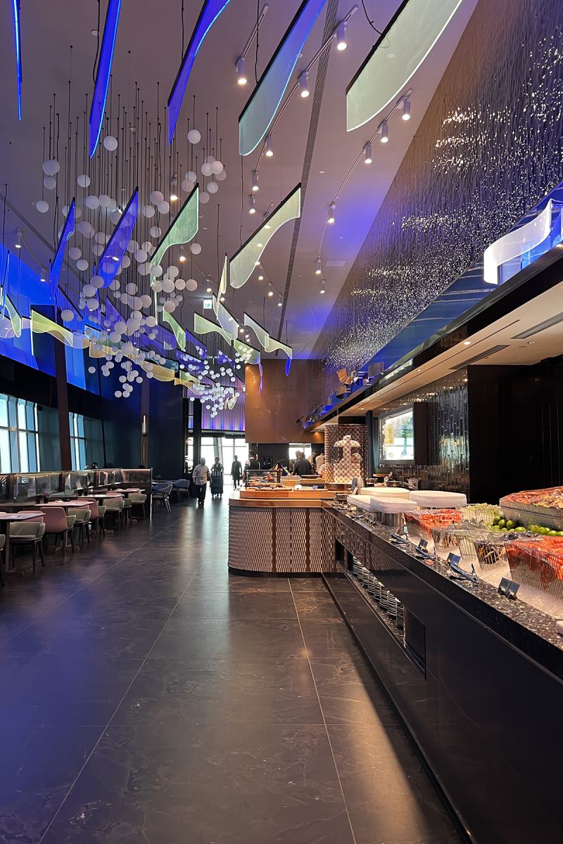 踏入位於101大樓高層的頂級自助餐廳,穿過空間縮放之後,映入眼簾的是一片由地面延伸到天際的環繞式落地窗,開展的都市全景帶給賓客深刻的第一印象。