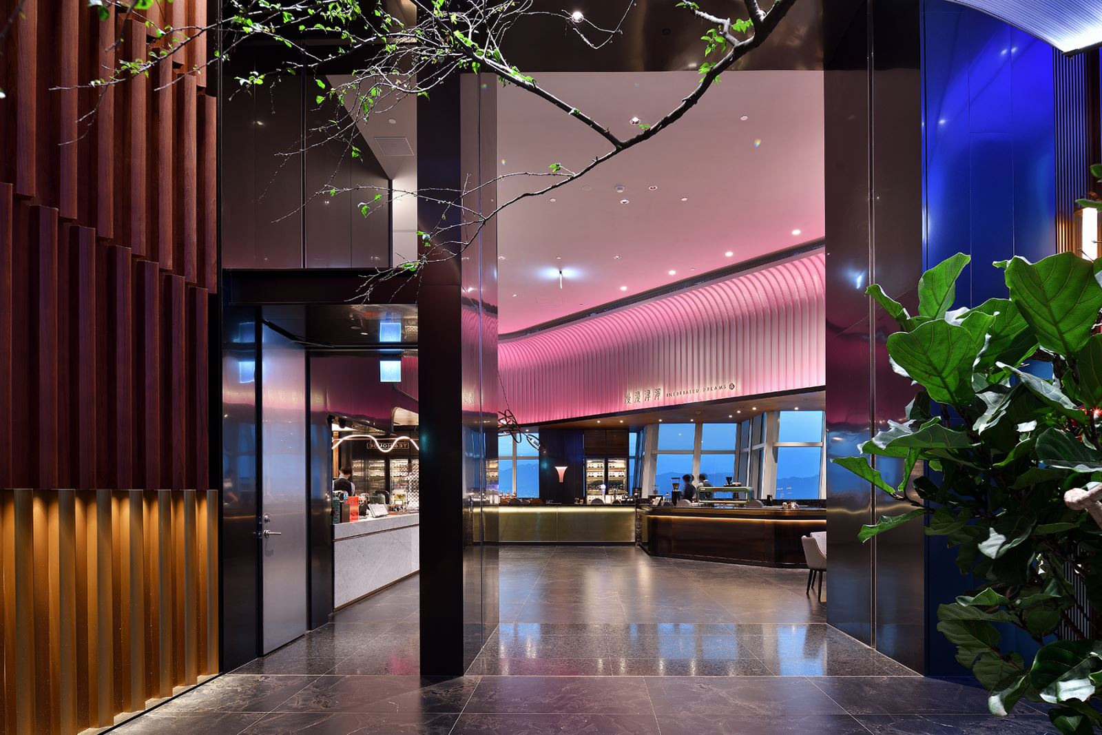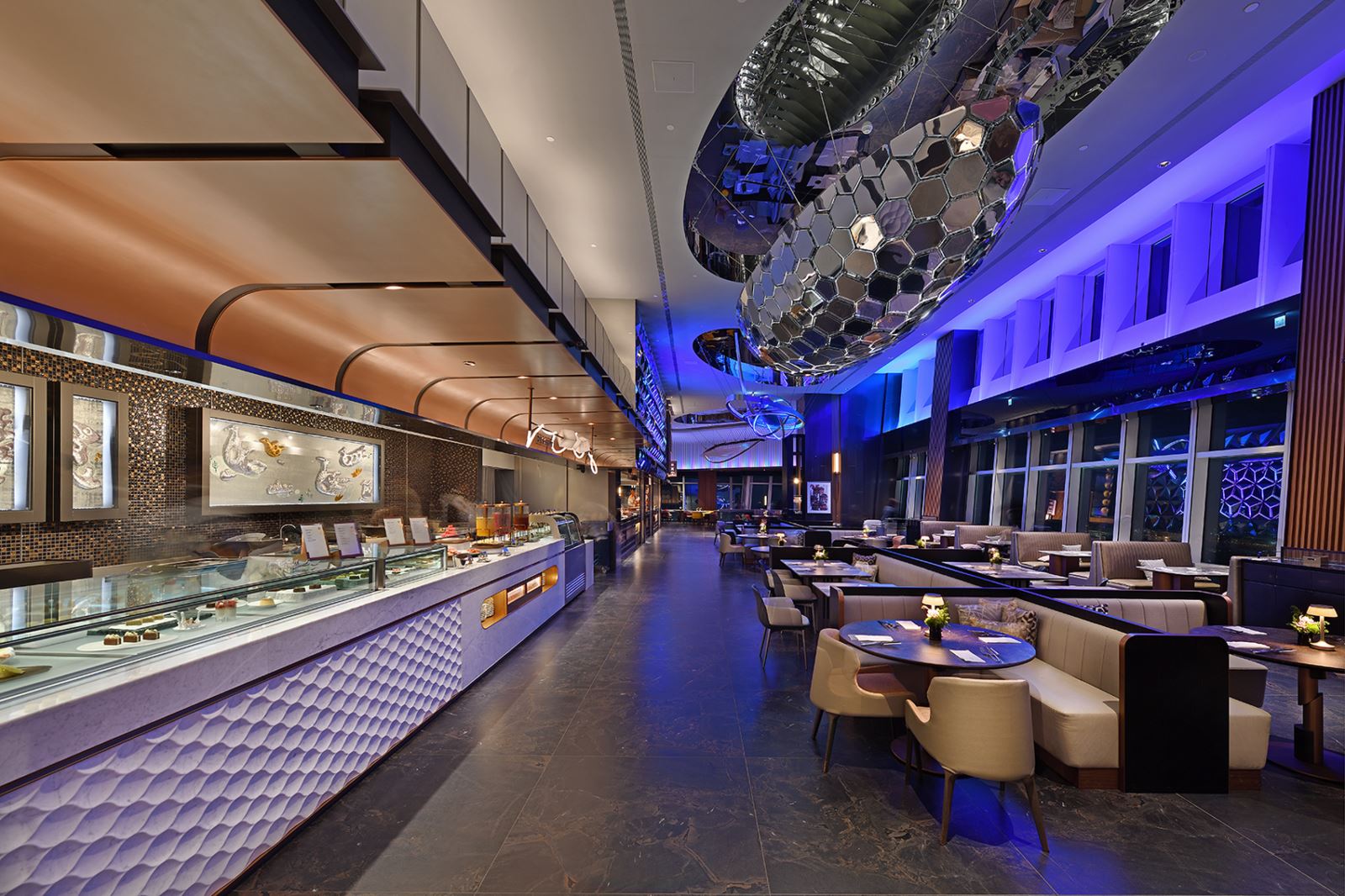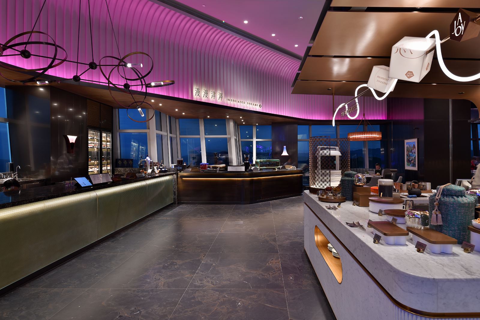 隨黃昏來臨,天光漸暗夜幕低垂之際,室內的陳設與高檔美食在精心設計的照明下展現出迷人的魅力,仿佛精品展示般吸引著饕客的味蕾與眼球。此刻,窗外萬家燈火熠熠生輝,高樓夜景盡收眼底。盛裝賓客自由穿梭,身影映在巨大的玻璃帷幕上,與室內景觀相映成趣。玻璃反射倒影與窗外闌珊,內外交融的景象並非偶然,而是經過精心策劃的藝術展演:應用控制系統和自動定時調光,掌握天光與室內光的配比,確保視覺舒適度,創造和諧的視覺層次,並增添了藝術性的互動體驗。