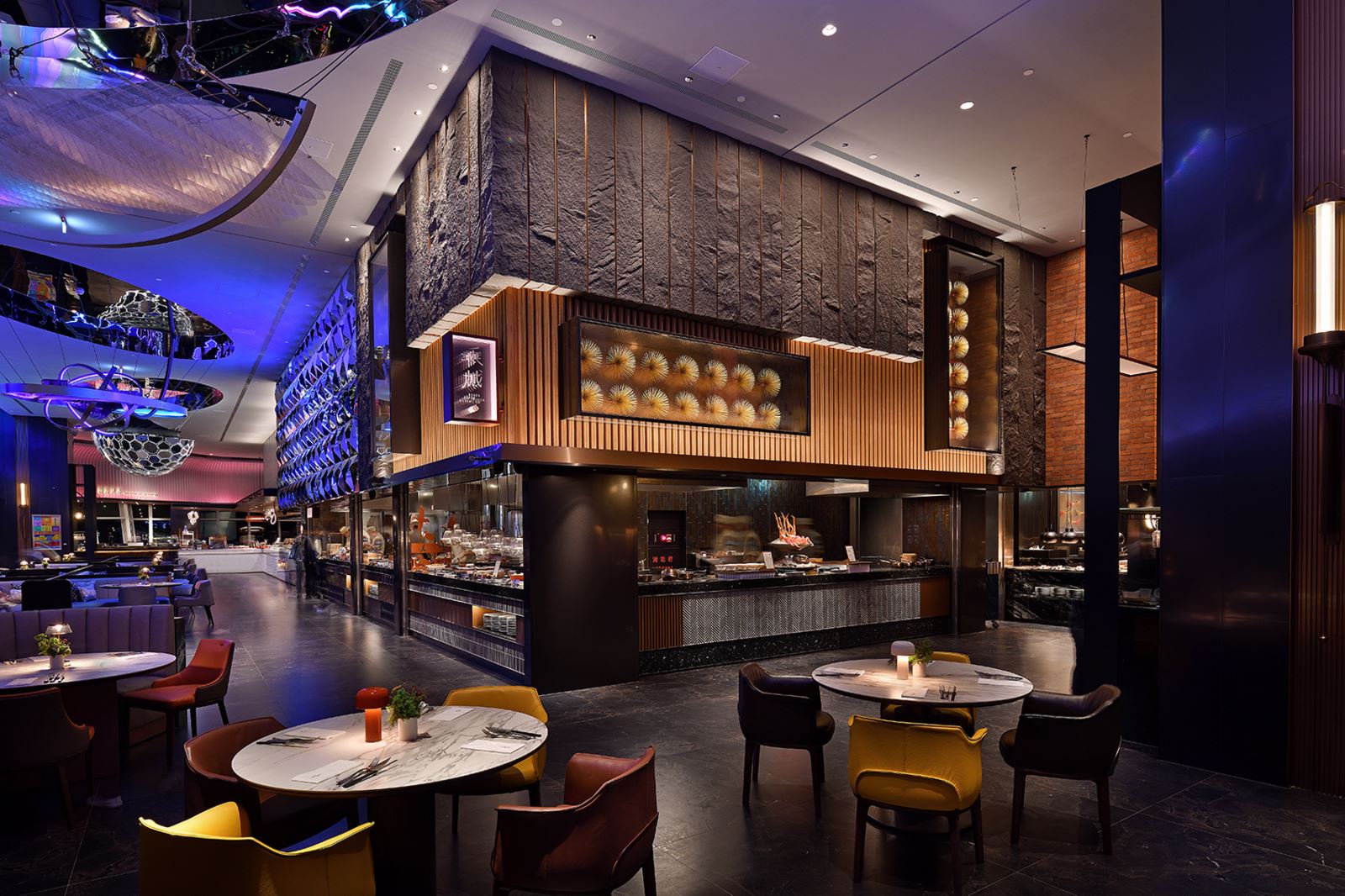 作為全台最高檔自助餐廳的指標性項目,本案的環境特色包括以下三大重點:首先是玻璃帷幕形成的通透感與特殊高樓視野景觀;其次,由環狀動線串聯起不同室內主題空間的展演性;最後,隨著每日時間和天候的變化,餐廳內的視覺感受也呈現不停變換的狀態。在照明設計的策略上,針對突顯這些特殊的空間特色和滿足環境需求的同時,也著重於塑造高級而氣質不凡的用餐體驗。不只控制場景中「亮部」的比例佈署是照明的表現,「暗部」的配置,如同畫作中的留白,更是重要的塑造氣氛的方式。