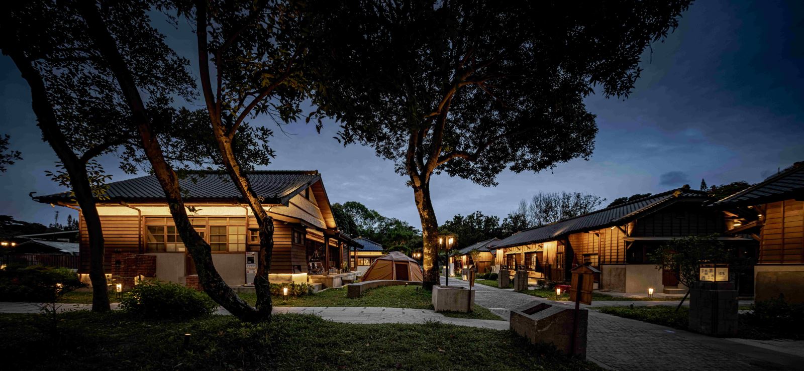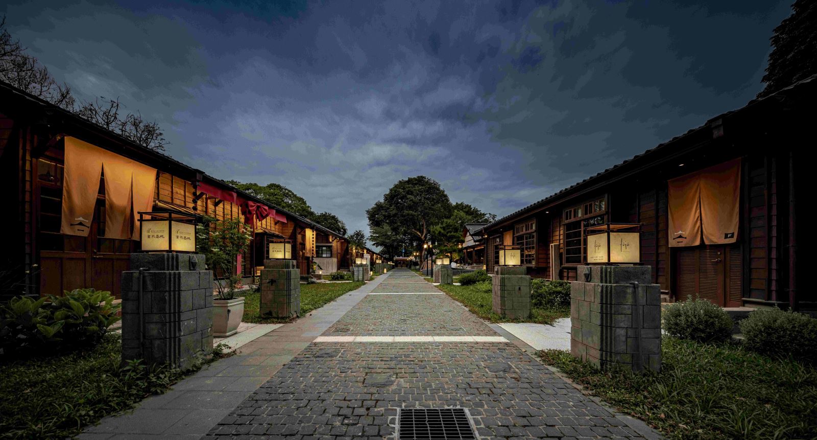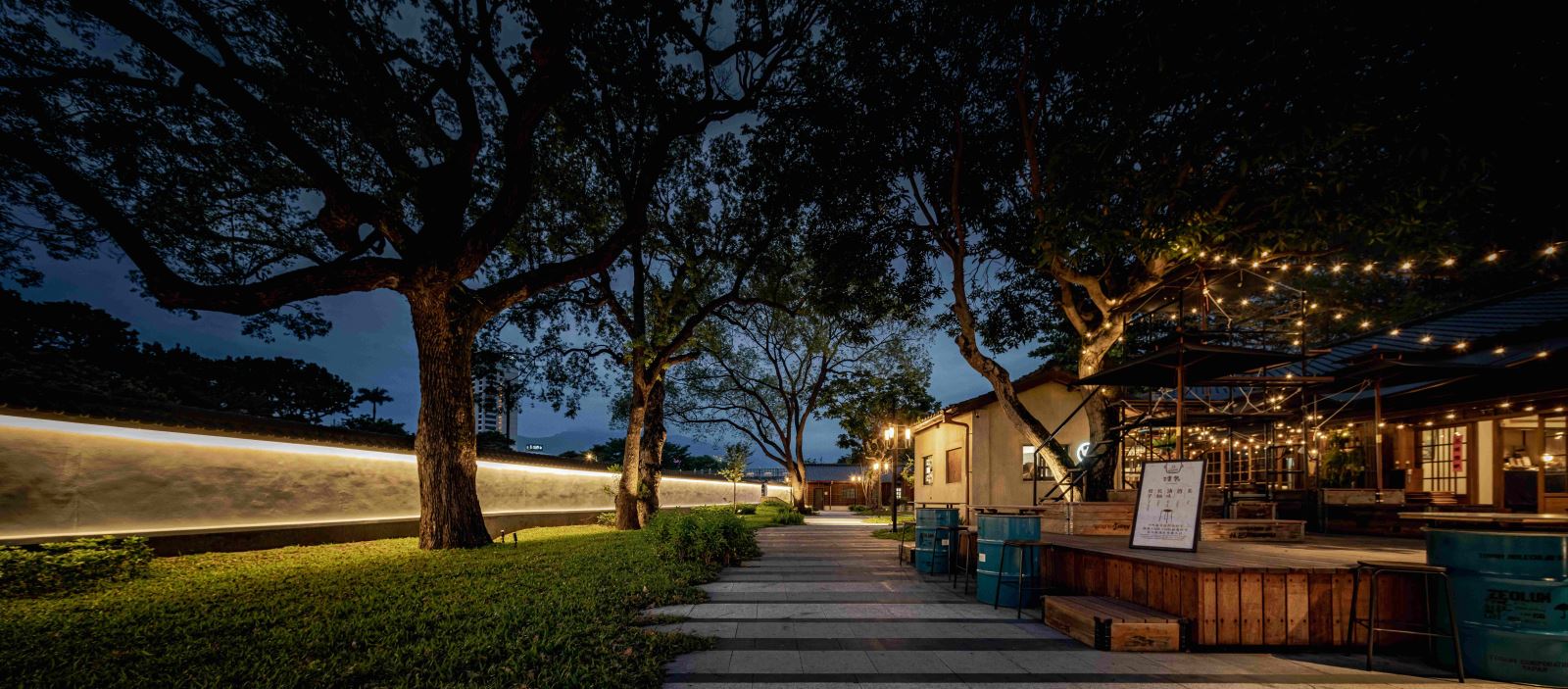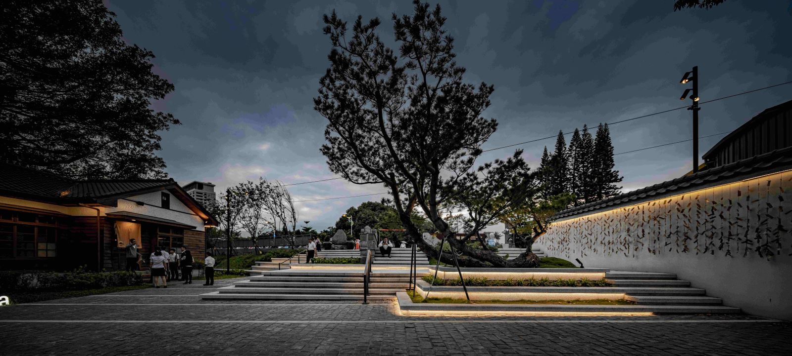 園區的照明規劃與多樣化的建築和景觀規劃相輔相成,採用多層次的照明手法和照明系統,從使用者的角度出發。從入口階梯的扶手燈光安全引導,廣場開闊空間高桿燈的活動提示,到引導遊客漫步穿梭於園區之中,途中不經意間看到日式房舍被燈光照亮的建築細節和映照在水面上的倒影,構成了園區光環境第一層的「靜」,讓遊客放慢腳步、放鬆心情。稍微前行,店鋪招牌結合的柱頭燈箱、訂製景觀高燈與店鋪建築立面所圍塑的中央通り,使遊客悠遊其間,宛如走在日本京都的二年坂,是園區光環境第二層的「雅」,讓遊客進一步融入環境之中。穿過小道,來到酒條通り,與圍牆結合的燈光圍塑出的邊界,搭配居酒屋店家與攤位的燈串,是園區光環境第三層的「繽」,讓遊客徹底將身心都沉浸在歡聲笑語之中。