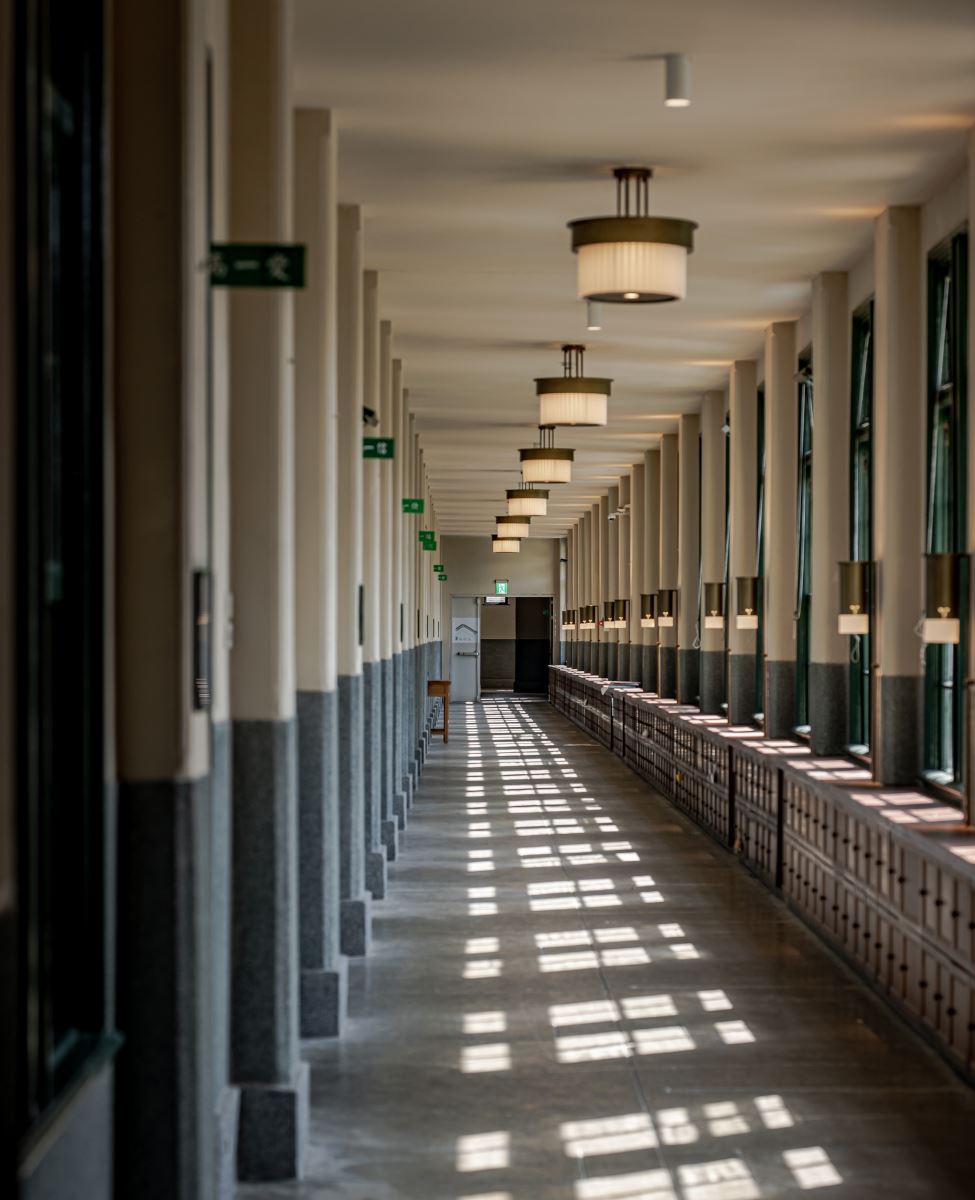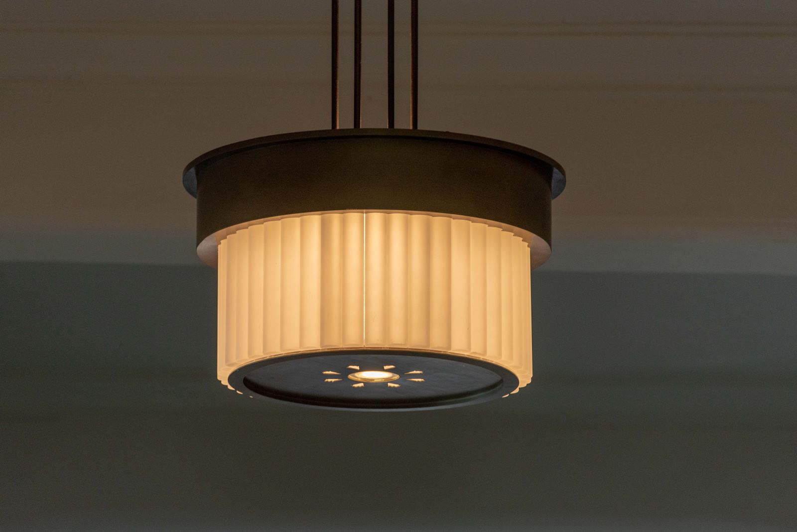 綜觀歷史建築的基本照明都是以裝飾燈具(吊燈、吸頂燈)為主,畢竟早期沒有所謂嵌燈、也沒有做天花板的概念。因此,本案的照明設計也是從裝飾燈開始發想,只是該選擇怎樣的裝飾燈。在翻遍所有型錄、也參考無數案例後我們決定為光復樓設計屬於自己的裝飾燈系統,目的是讓燈具這個視覺元素能與建築本身有更緊密的結合與更直接的關係。我們邀請了執影照明參與訂製燈的設計,並一起探討何種建築元素可以被發展利用到燈具的外型與設計中。最後我們擷取了建築門簷的圓弧柱列語彙,花瓣形狀的通氣口、以及日治時代的北一女校徽,應用在一系列的裝飾燈具裡。