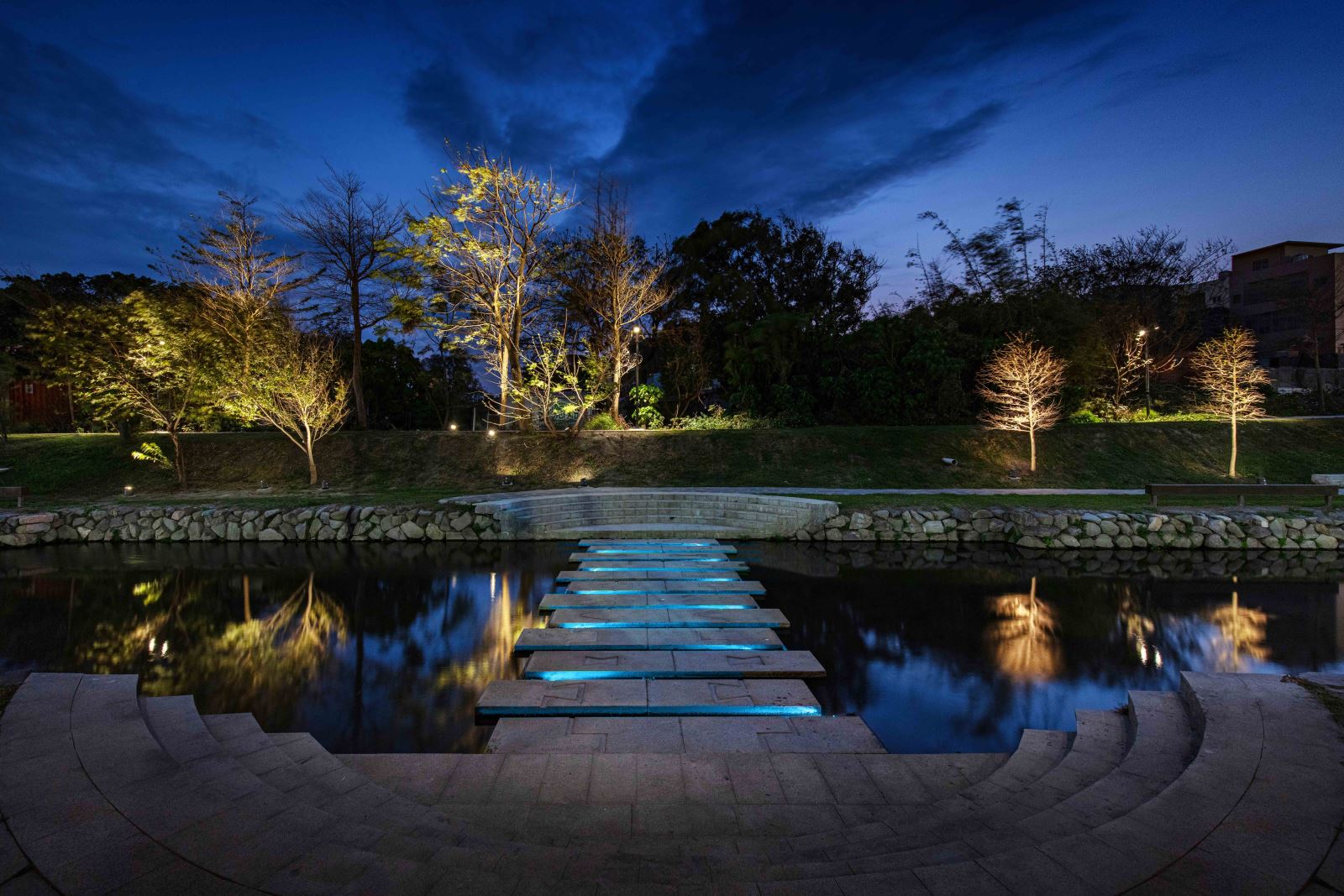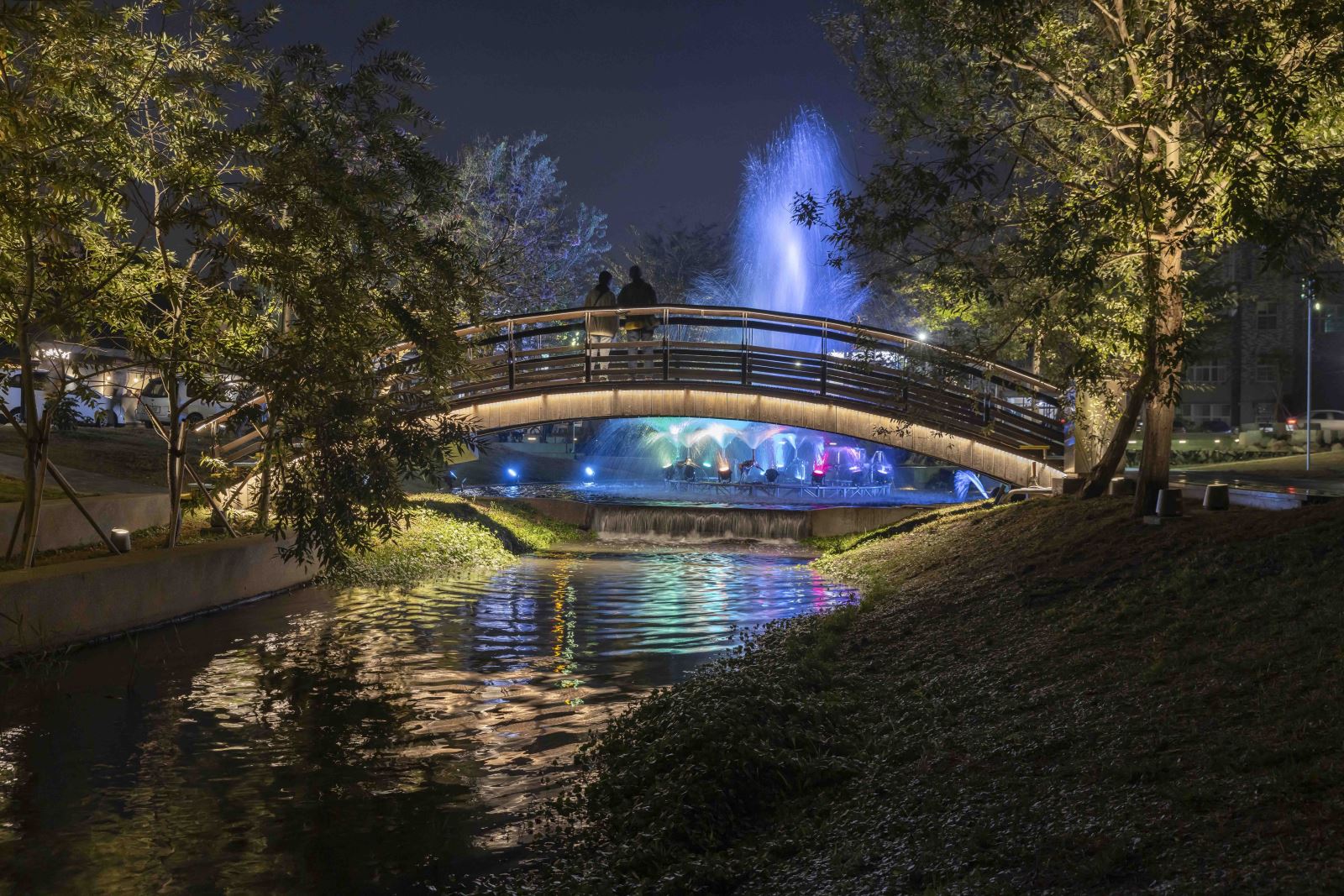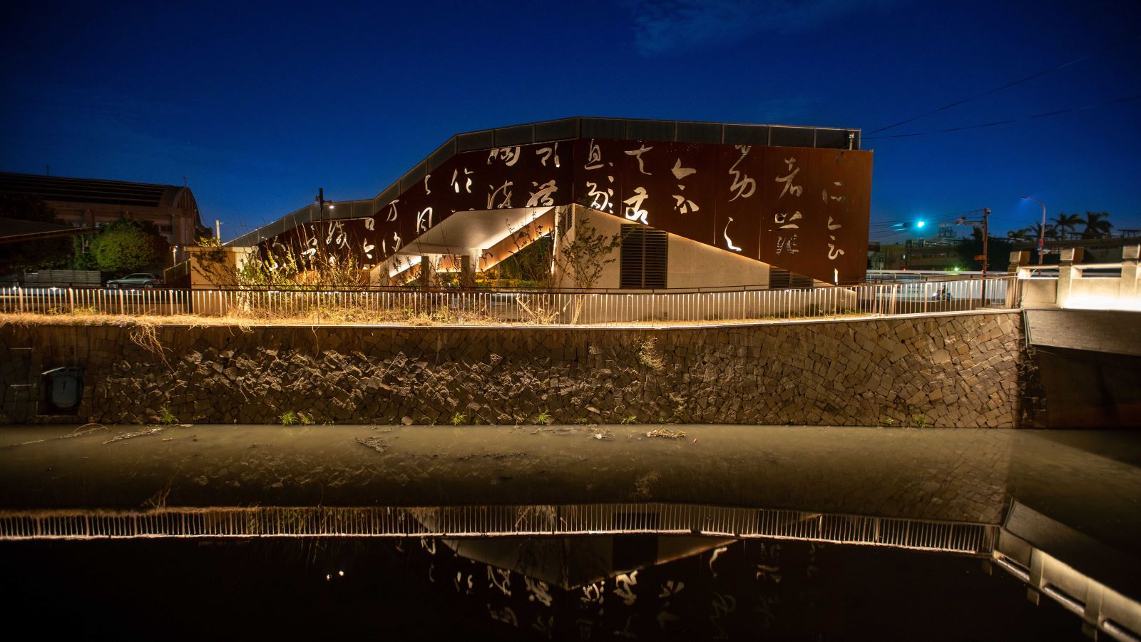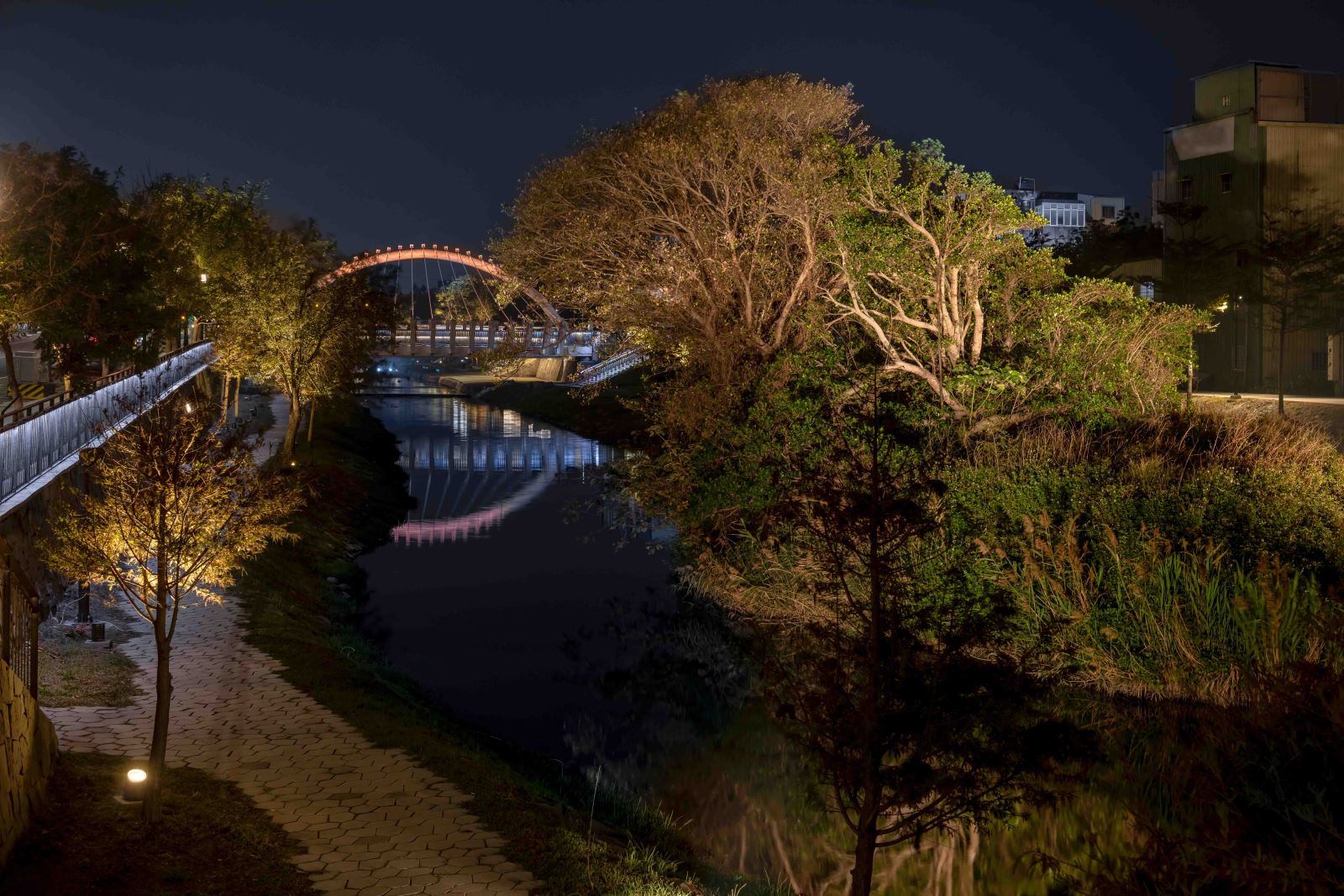本計畫亦優化與新設基地內共 9座橋樑的夜間照明,一座座的橋樑藉由隱身於護欄與階梯欄杆下方的線性燈光串聯, 與人行道的燈籠序列、下沉空間的親水廊道、地標亮點等設施等構成豐富的空間層次與美麗的地景。其中「菜園陸橋」是基地中尺度最大且最具特色的地標,與菜園橋遙望的「河中島」則是水域內特有的生態景觀。