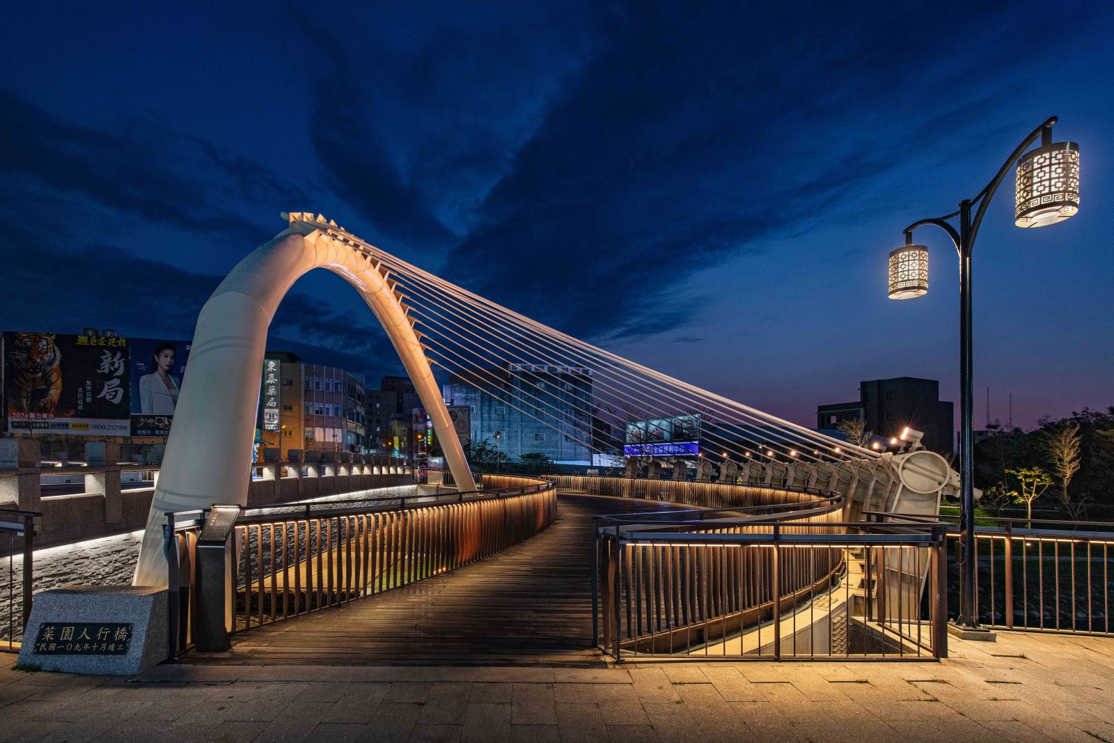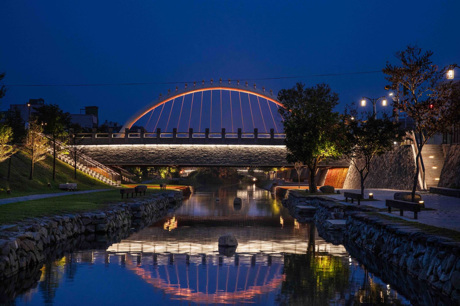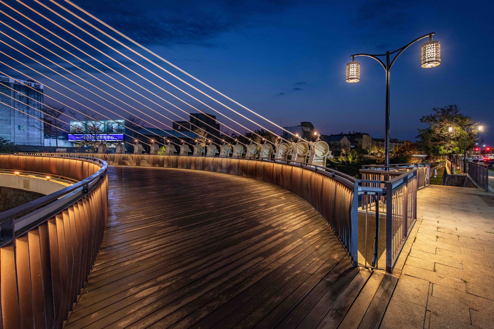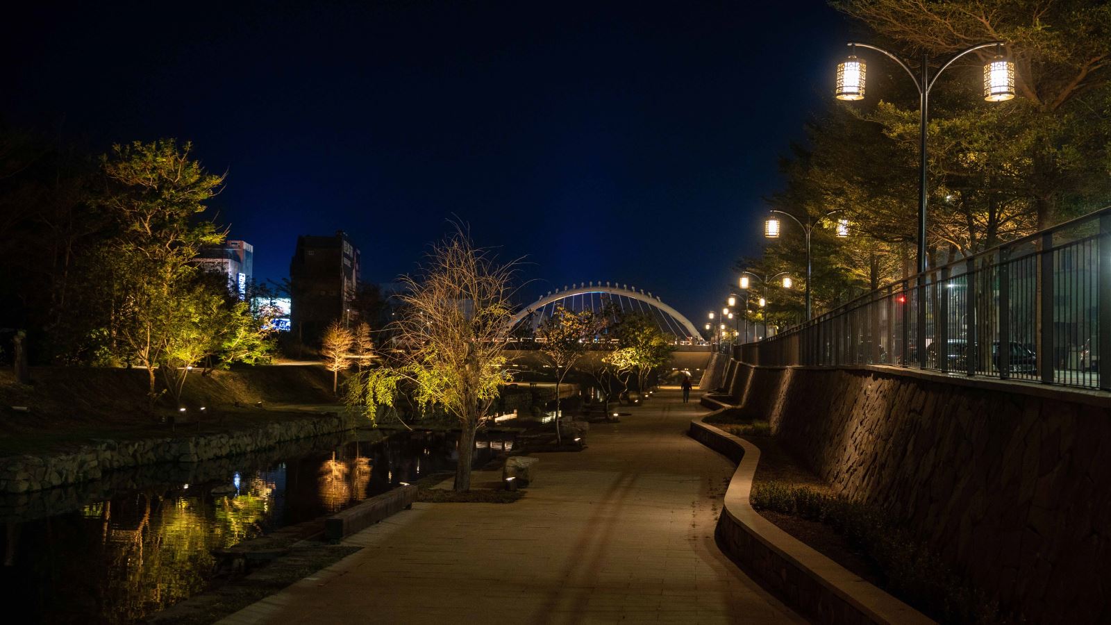 本計畫亦優化與新設基地內共 9座橋樑的夜間照明,一座座的橋樑藉由隱身於護欄與階梯欄杆下方的線性燈光串聯, 與人行道的燈籠序列、下沉空間的親水廊道、地標亮點等設施等構成豐富的空間層次與美麗的地景。其中「菜園陸橋」是基地中尺度最大且最具特色的地標,與菜園橋遙望的「河中島」則是水域內特有的生態景觀。