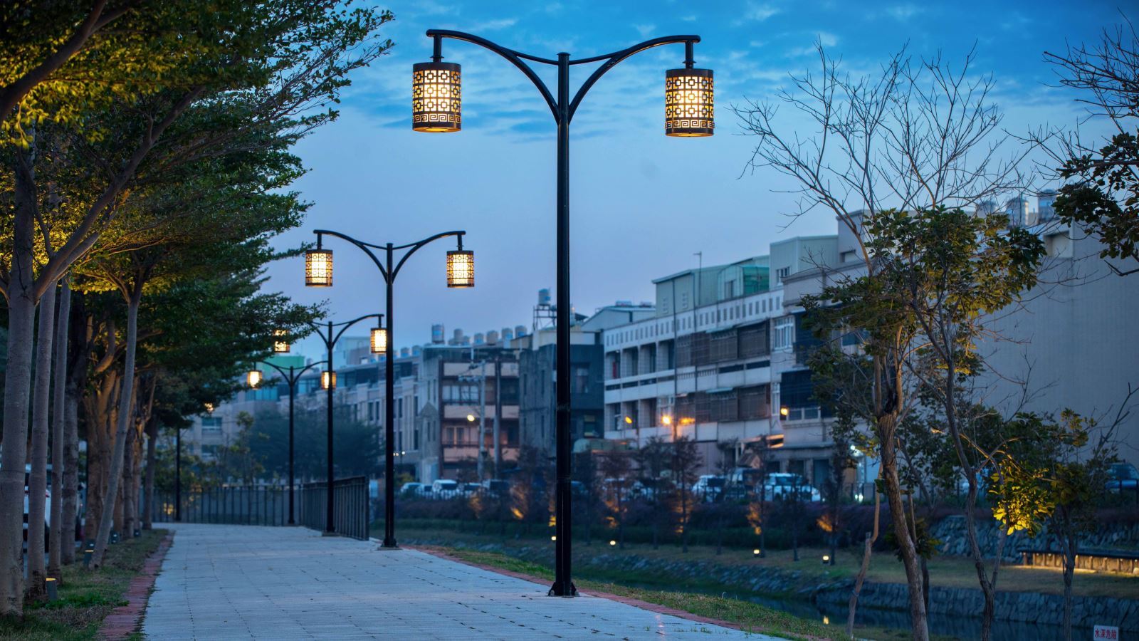 沿著水域貫穿東西的人行道景觀燈則是本案照明優化的第二重點,照明設計以傳統民居中常見的花窗元素設計的訂製燈罩取代既有的景觀燈燈罩,古璞的視覺元素讓原本常見於一般人行道的制式景觀燈不僅能融入環境,更成為美化景觀廊道夜的功臣之一。