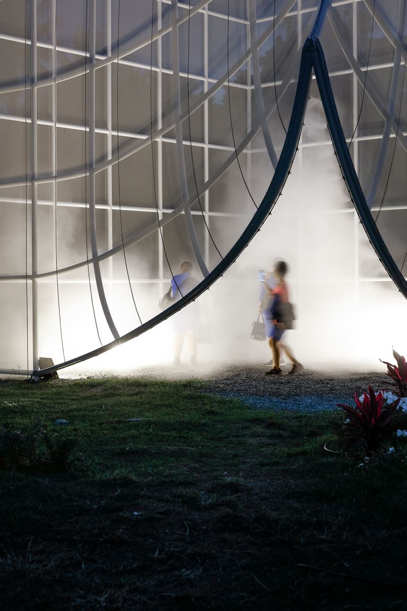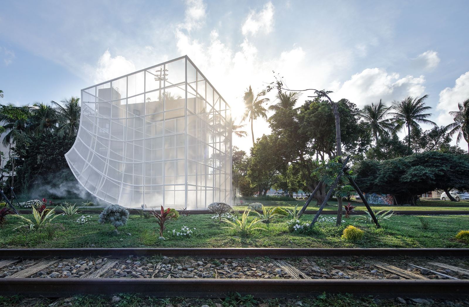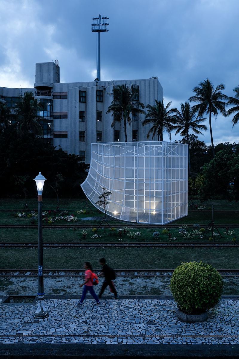 這件空間裝置,涵納了多重材質與多重功能,設置在台東舊車站,台東設計中心前的空曠草坪環境上。空間裝置,由格狀鋼管系統形塑而成,外層包覆了具穿透性、透氣性的網布。空間內部設計了了噴霧設施,創造出清透空靈的環境氛圍,白天,作品的網紗及水霧提供減緩熱氣的避適所且在台東日光的照射下,不同角度能觀賞到不同的光影變化;夜晚,搭配燈光及水霧成為ㄧ個夢幻的空間。輕靈的環境空間,吸引人群停留,讓人成群結伴來此活動,或享受隱蔽而親密的空間體驗。
