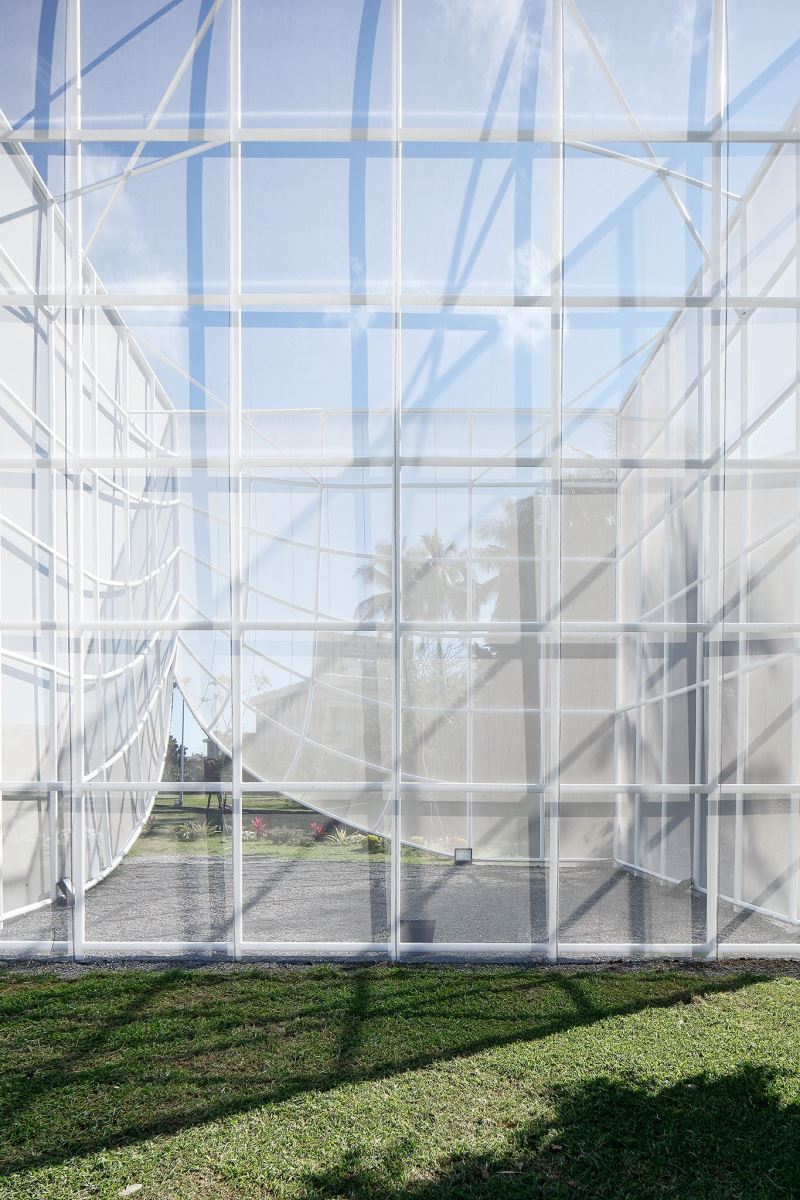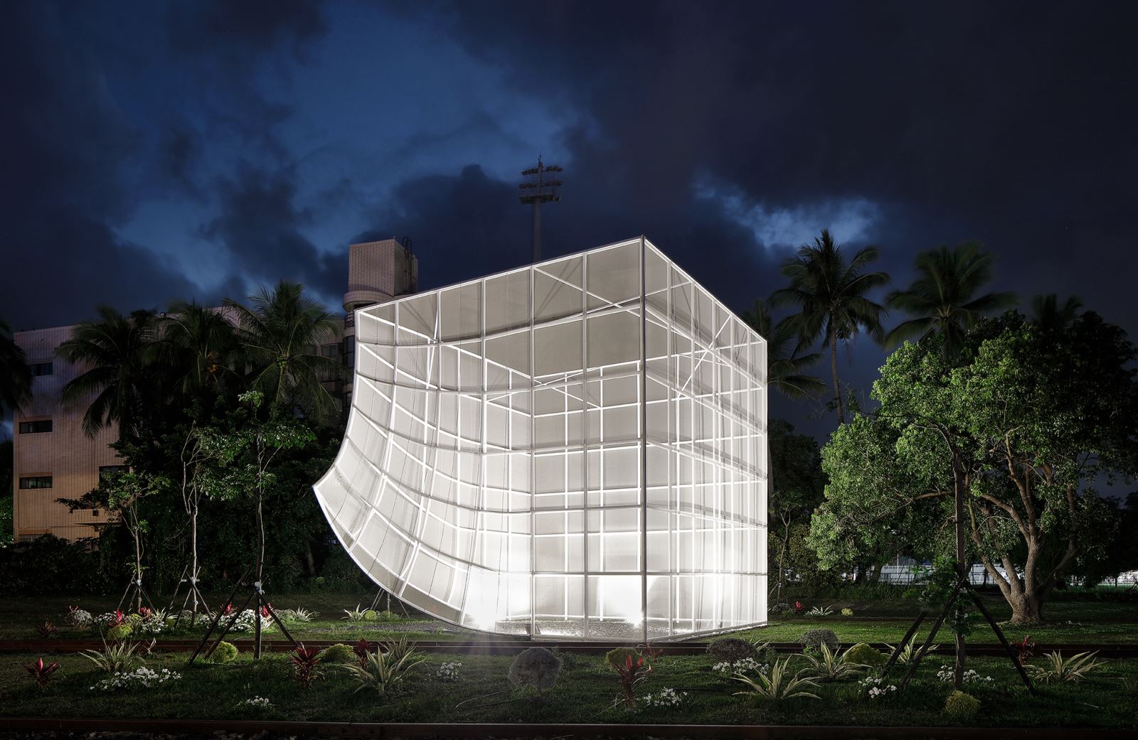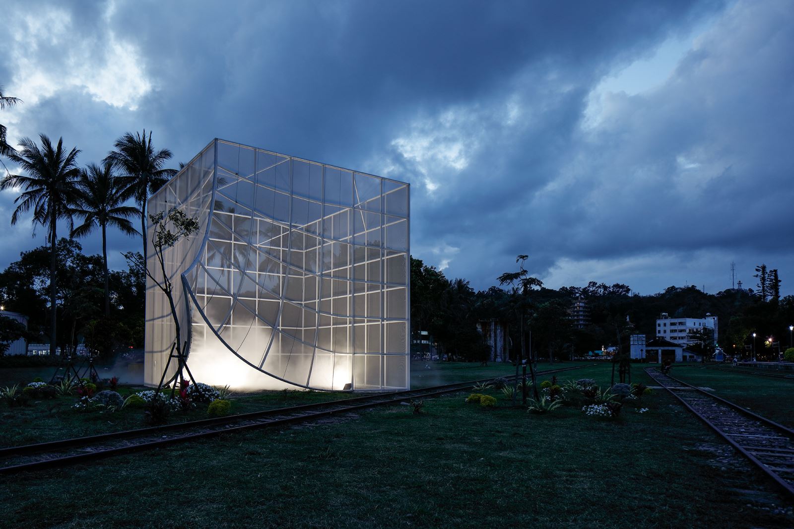 這件空間裝置,涵納了多重材質與多重功能,設置在台東舊車站,台東設計中心前的空曠草坪環境上。空間裝置,由格狀鋼管系統形塑而成,外層包覆了具穿透性、透氣性的網布。空間內部設計了了噴霧設施,創造出清透空靈的環境氛圍,白天,作品的網紗及水霧提供減緩熱氣的避適所且在台東日光的照射下,不同角度能觀賞到不同的光影變化;夜晚,搭配燈光及水霧成為ㄧ個夢幻的空間。輕靈的環境空間,吸引人群停留,讓人成群結伴來此活動,或享受隱蔽而親密的空間體驗。