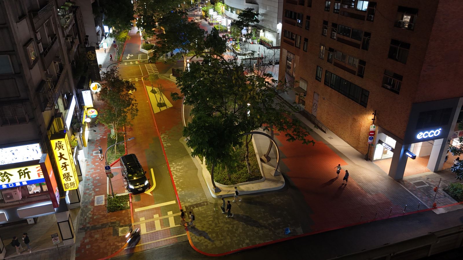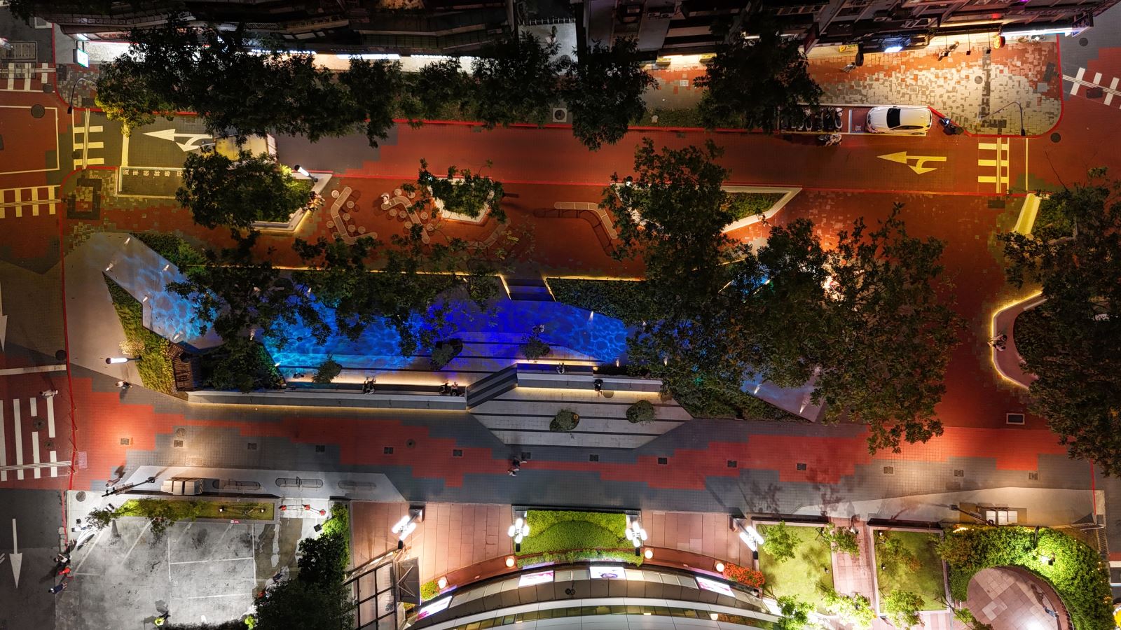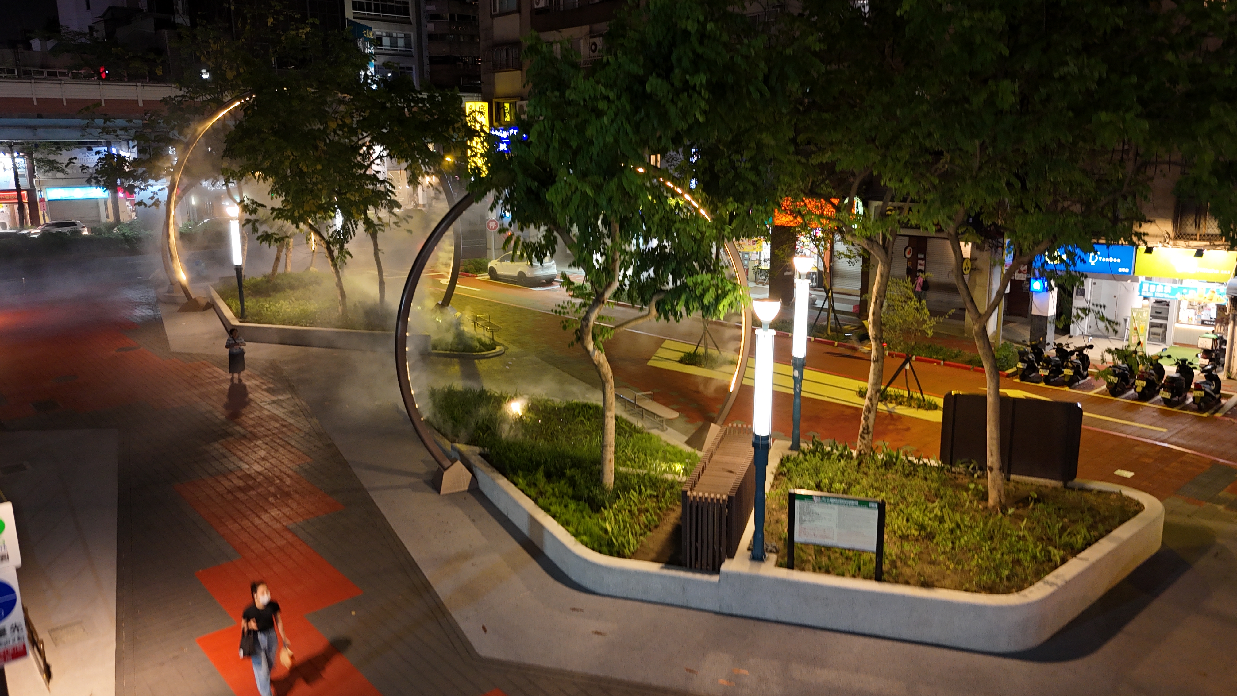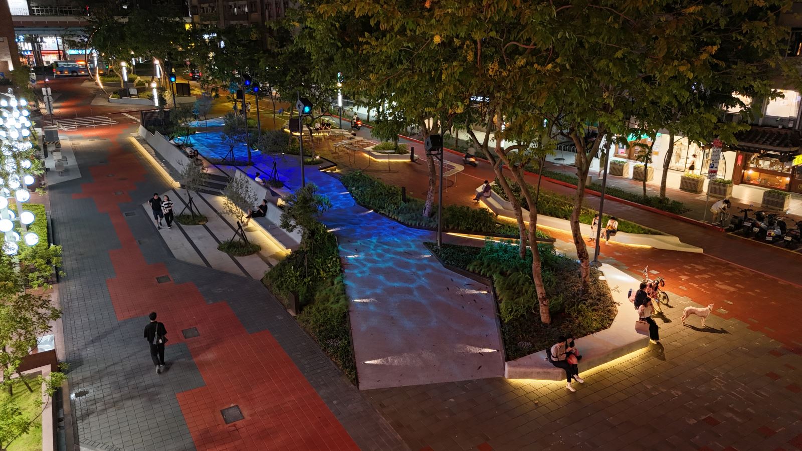 夜間光環境設計方面,創新夜間光影美學,為營造本計畫夜間特色,設計中納入夜間燈光美學設計,如:水霧光圓環、水波紋燈及座椅線燈等,營造東區商圈夜間氣氛,同時也考慮到節能減碳議題,水霧圓環也可看成是一個裝置藝術,路燈、景觀燈皆採LED節能燈具,達到IP65以上防水、適應高低溫環境、更長的使用時間、降低維修費用、低消費電力,同時路燈預留智慧照明設備安裝空間,由市府公燈處進行智慧化管理。LED燈具與一般燈具比較用電量,經計算年減量用電度數約8504.5度,年減碳量約4500公斤CO2。兼顧節能及生態環境保護,更選用低色溫及背後光束較少之燈具,本工程燈具光源集中在地面且低色溫,維護夜間生態環境。