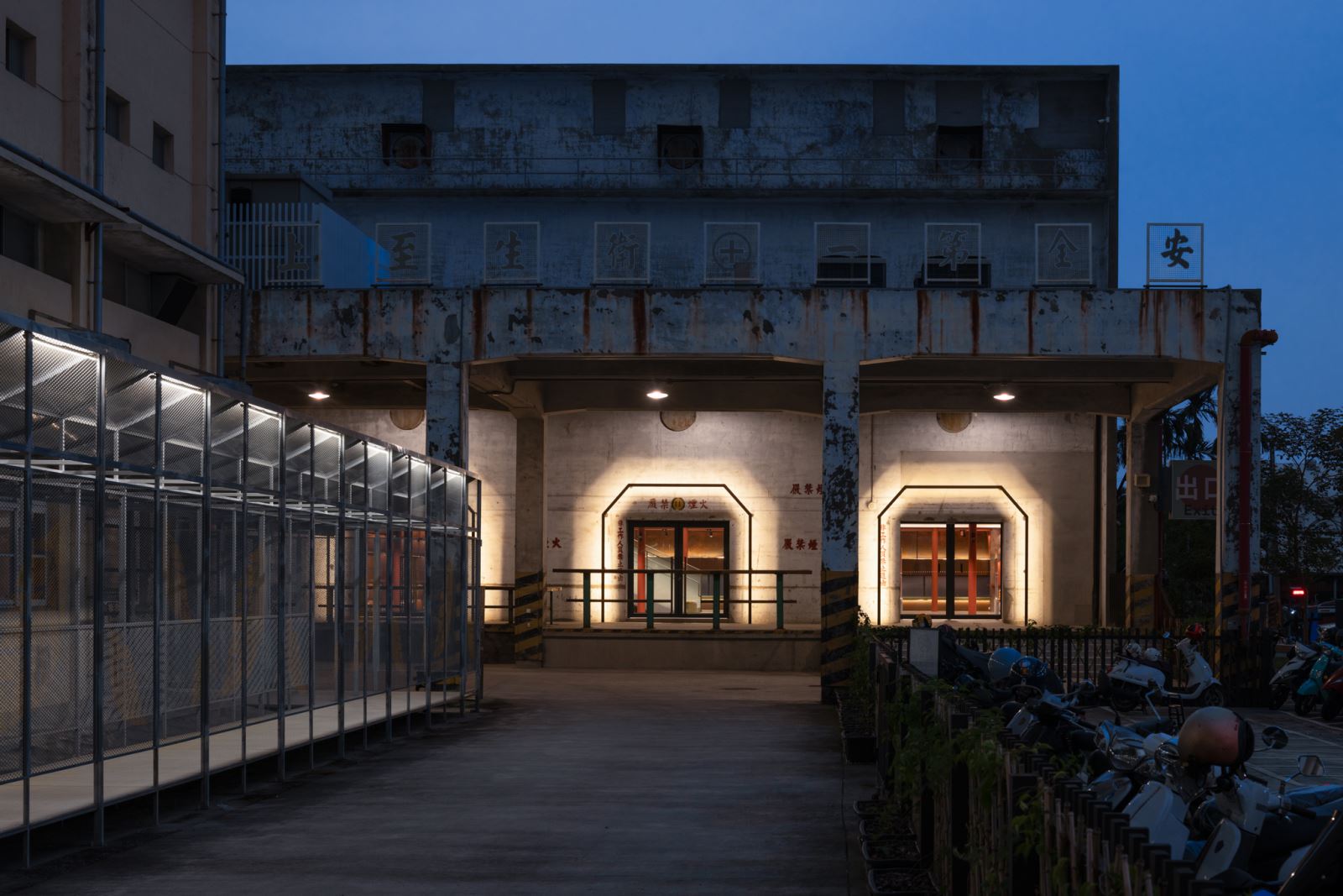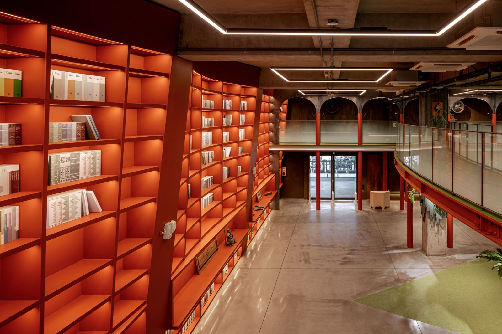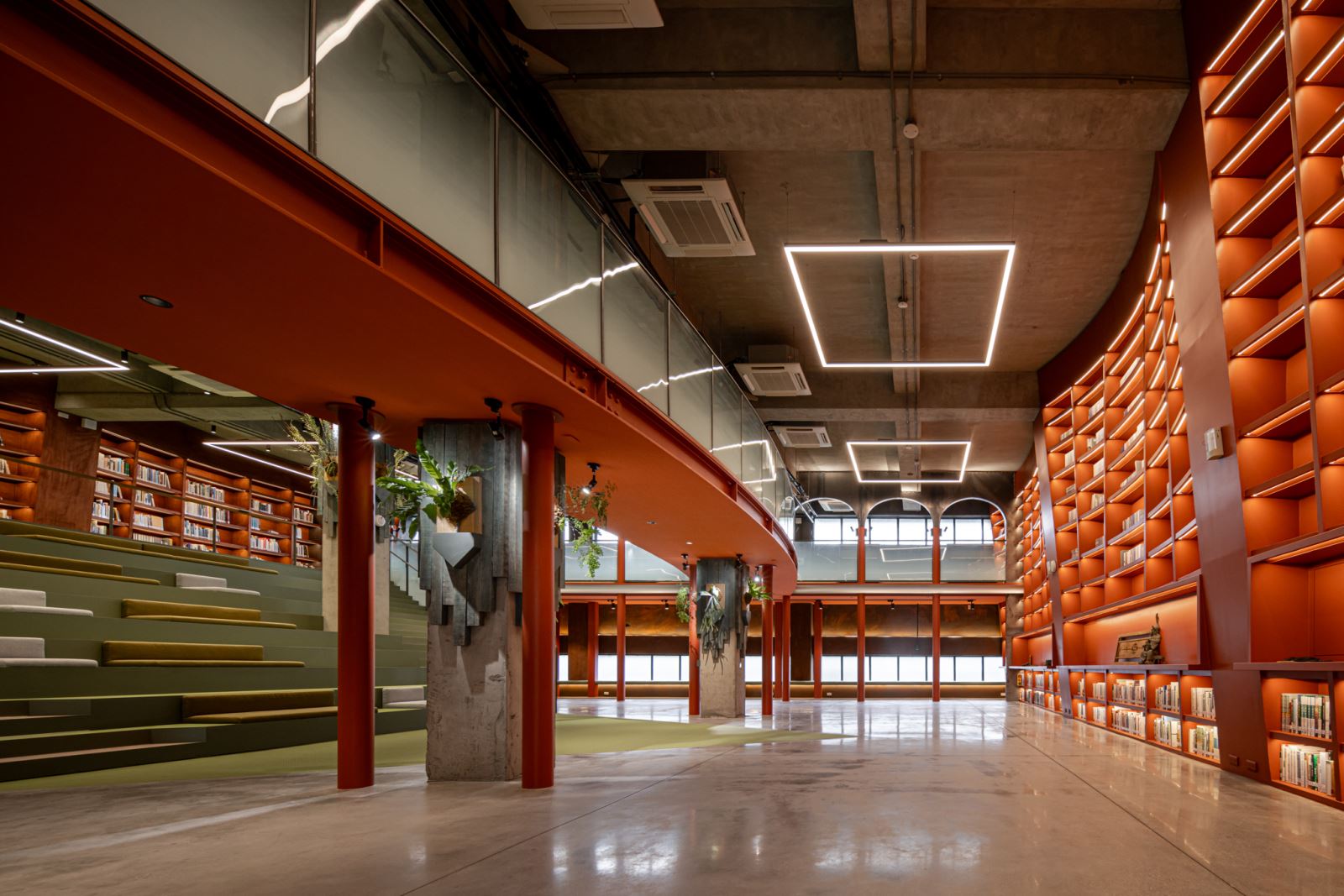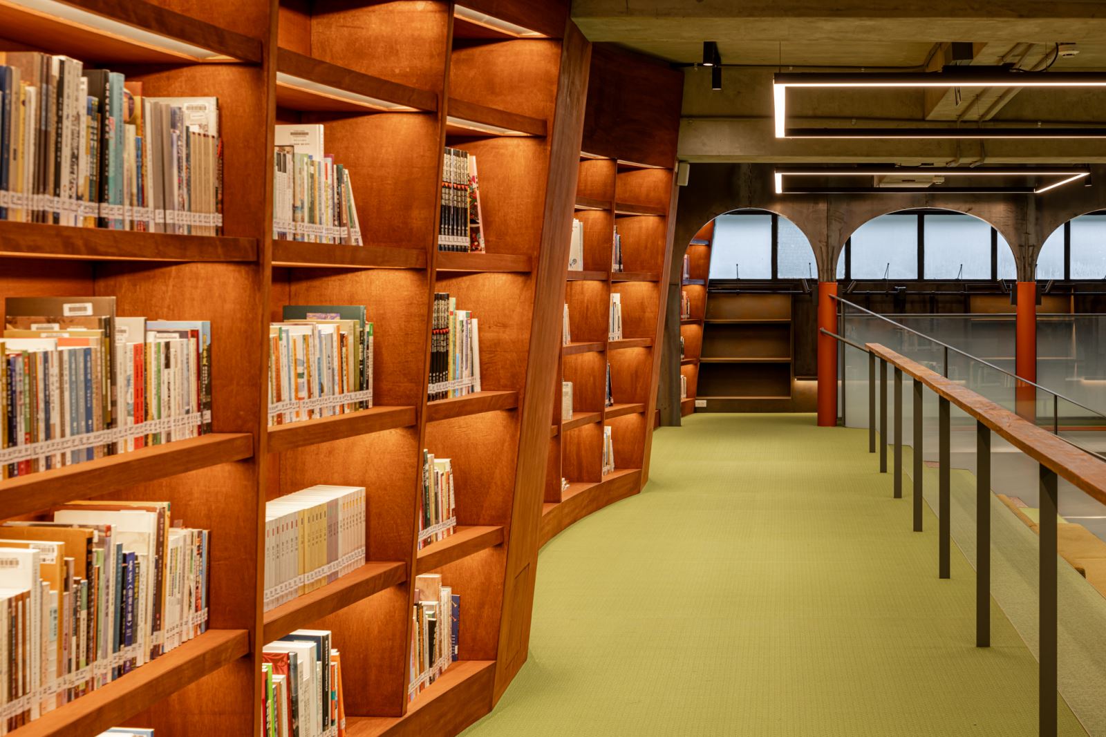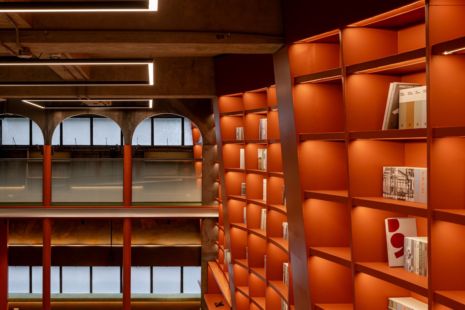 光環境規劃尊重既有倉庫的通風與採光邏輯,保留拱形長窗與圓形氣窗,自然光在白日滲透空間,營造出時間層次。夜間則透過清楚的功能分區照明:劇場階梯區、書牆、走廊、展覽平台分別配置嵌燈、光帶、軌道燈與線燈,兼顧照度需求與視覺引導,確保公共安全與空間層次兼容。