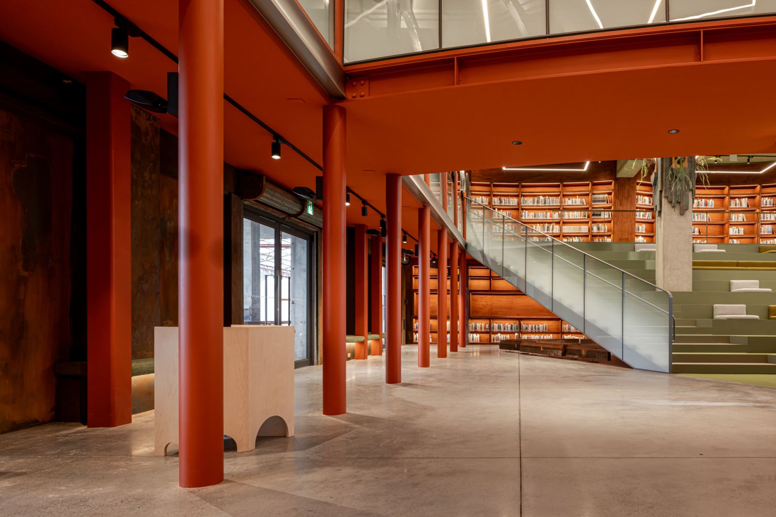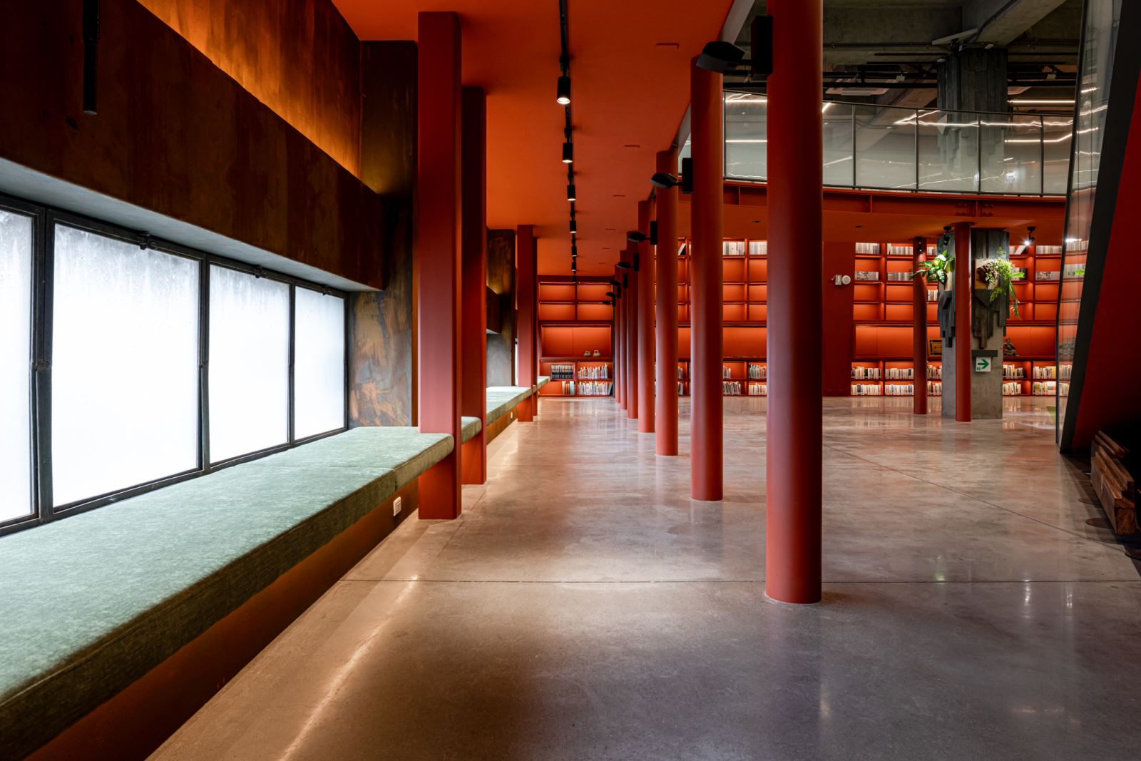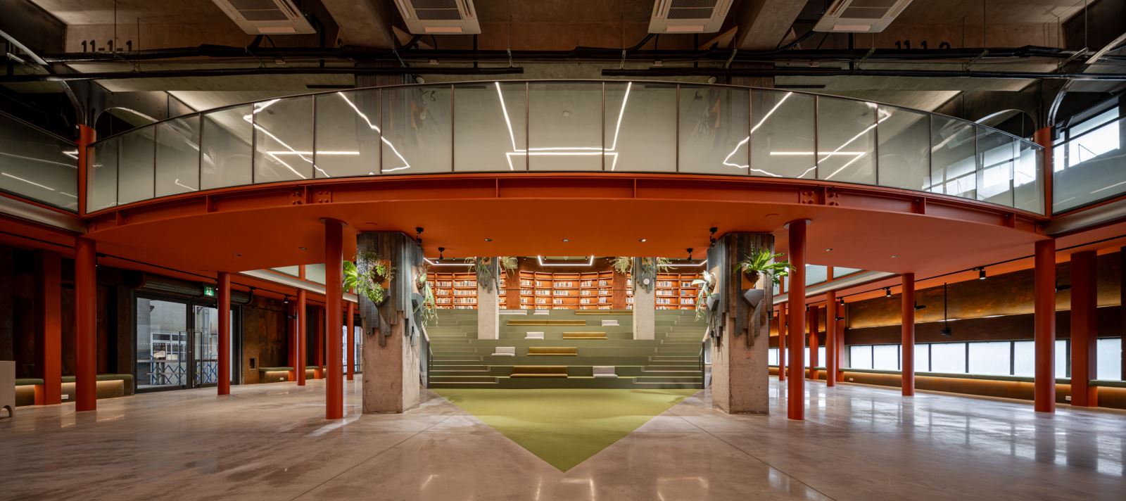 建築保留原有的混凝土結構與鐵件窗框,並延續內部空間的大尺度特質。設計團隊於中央設置三角形階梯劇場,作為視覺與機能的中心,並在挑高牆面設置具展示與閱讀功能的龕形書牆,讓空間同時具備圖書館、講堂與展覽等多種可能。部分舊木料與鐵件則被轉化為家具與欄杆細部,傳遞物件的歷史延續性。