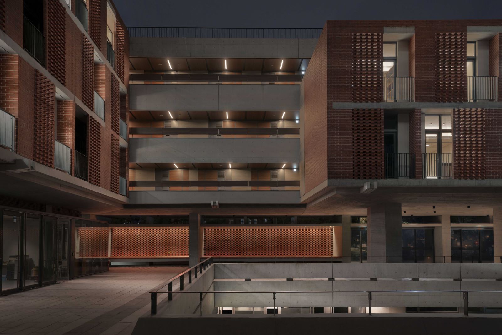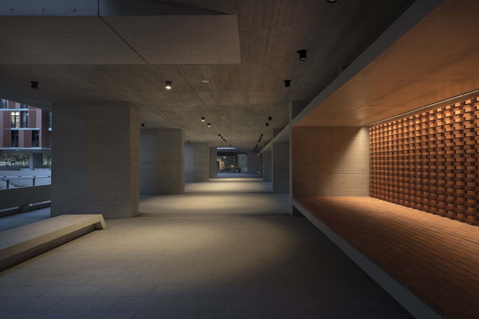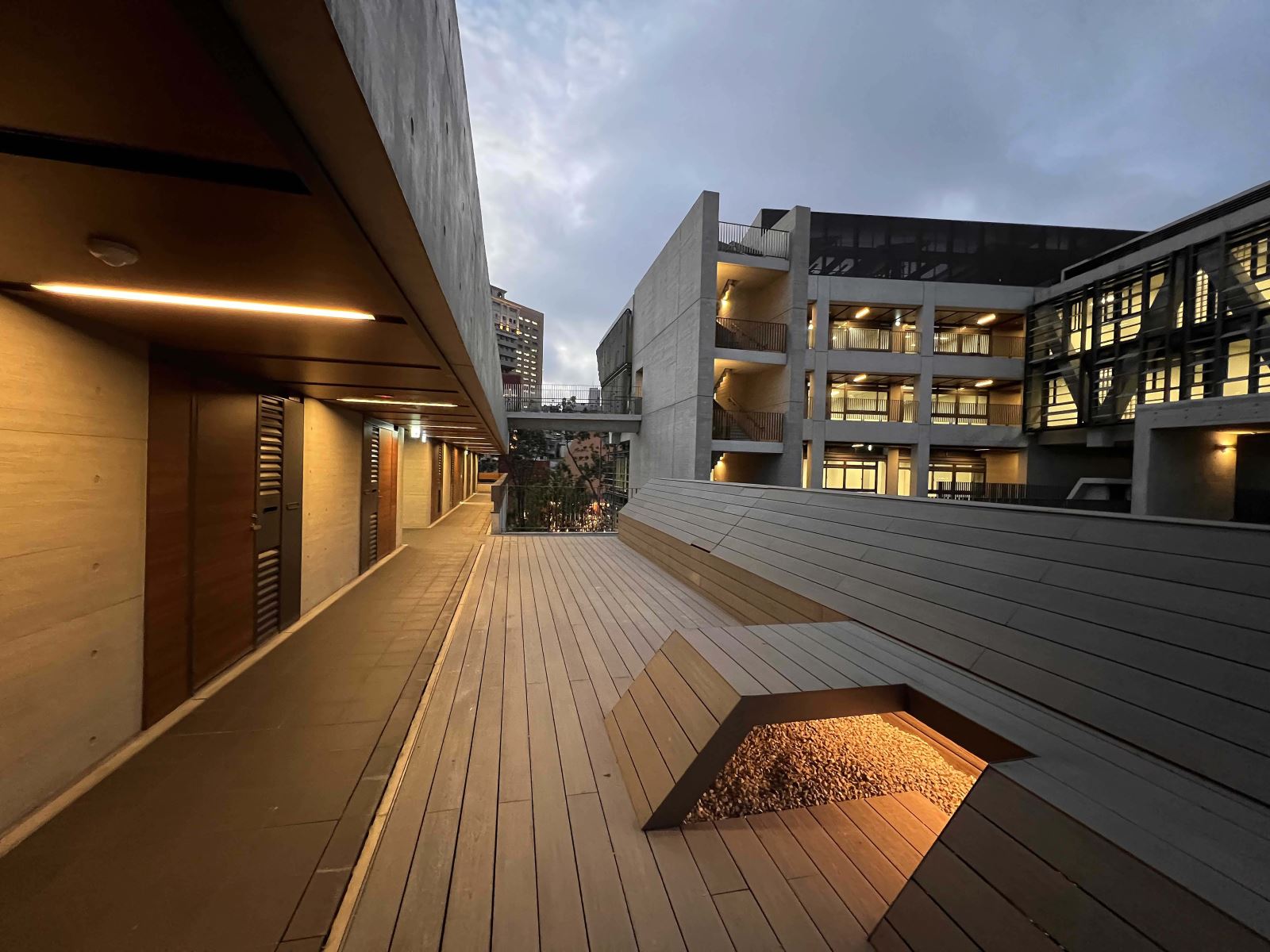 建築以四合院形式構成,中央廣場、大階梯、天井、空橋與廊道串聯起水平與垂直的流動動線。白天,陽光清晰地刻畫空間層次;夜晚,光線成為空間引導的角色,透過照明標示出上下空間穿梭的路徑與節點。主要廊道使用天花下照燈,其他水平移動空間則以低尺度、低照度照明營造放鬆氛圍。大廣場不設路燈,僅透過周遭建築內部光線為指引,維持空間視覺的開闊;大階梯邊緣則設置踢腳燈,清楚定義行進動線。戶外樓梯採用上下照壁燈,既保留杉木紋清水模材質的肌理感,也提供必要照度,達到美感與功能的平衡。